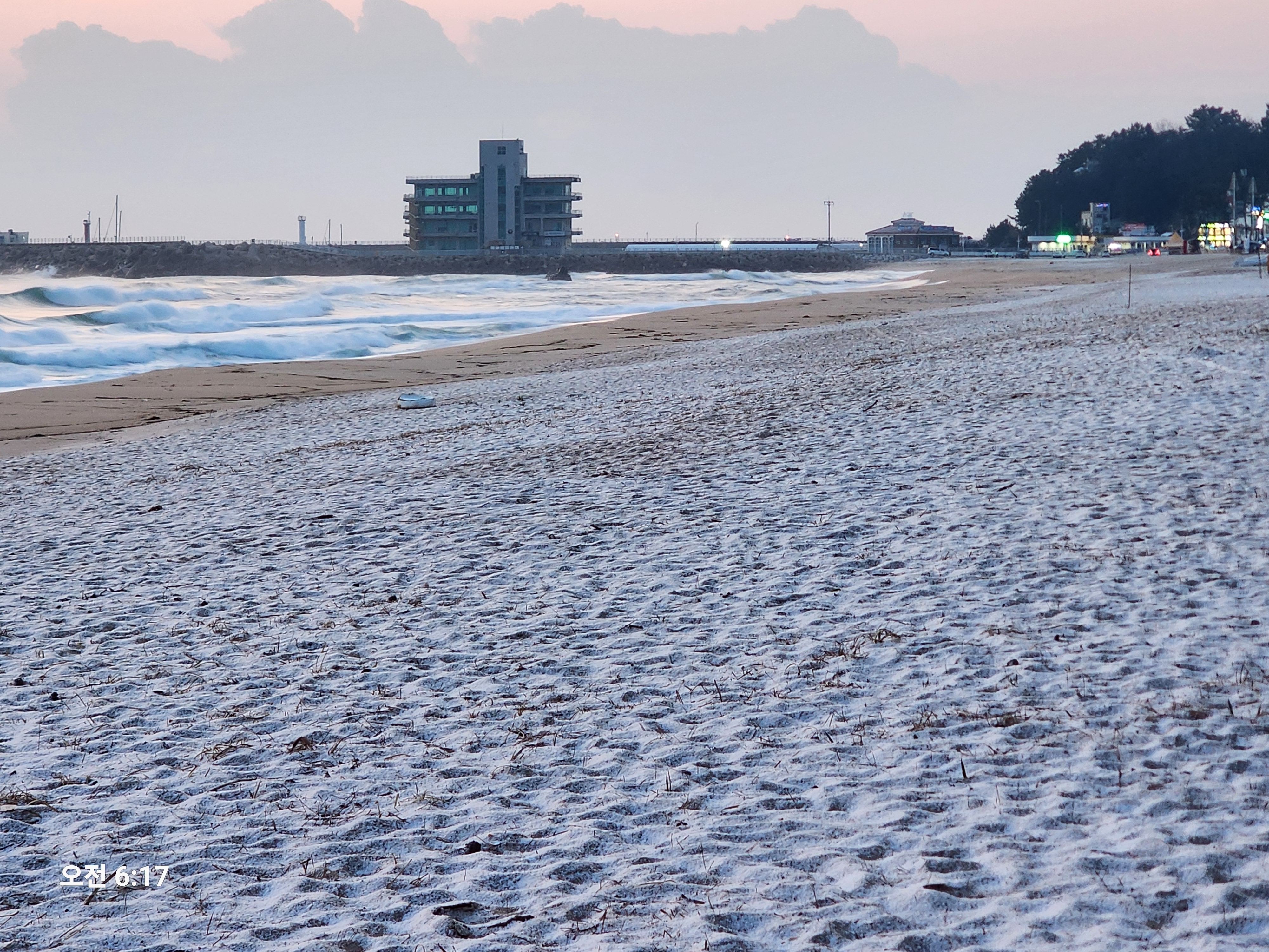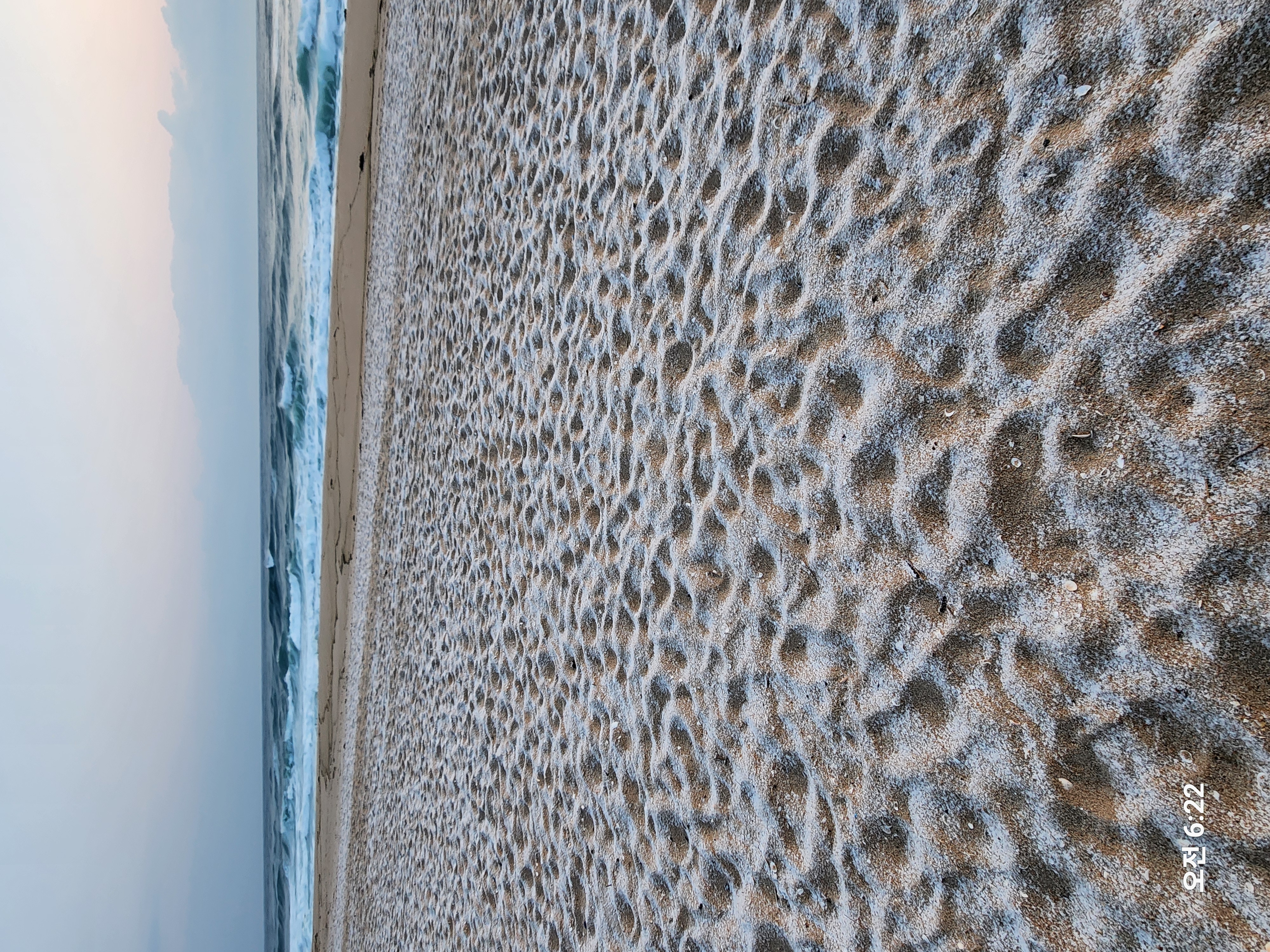 눈이 내리고 기온이 내려가 해안 모래사장이 딱딱하게 굳어 몸무게 좀 나가는 내가 지나가도 발자국이 남지 않는다.