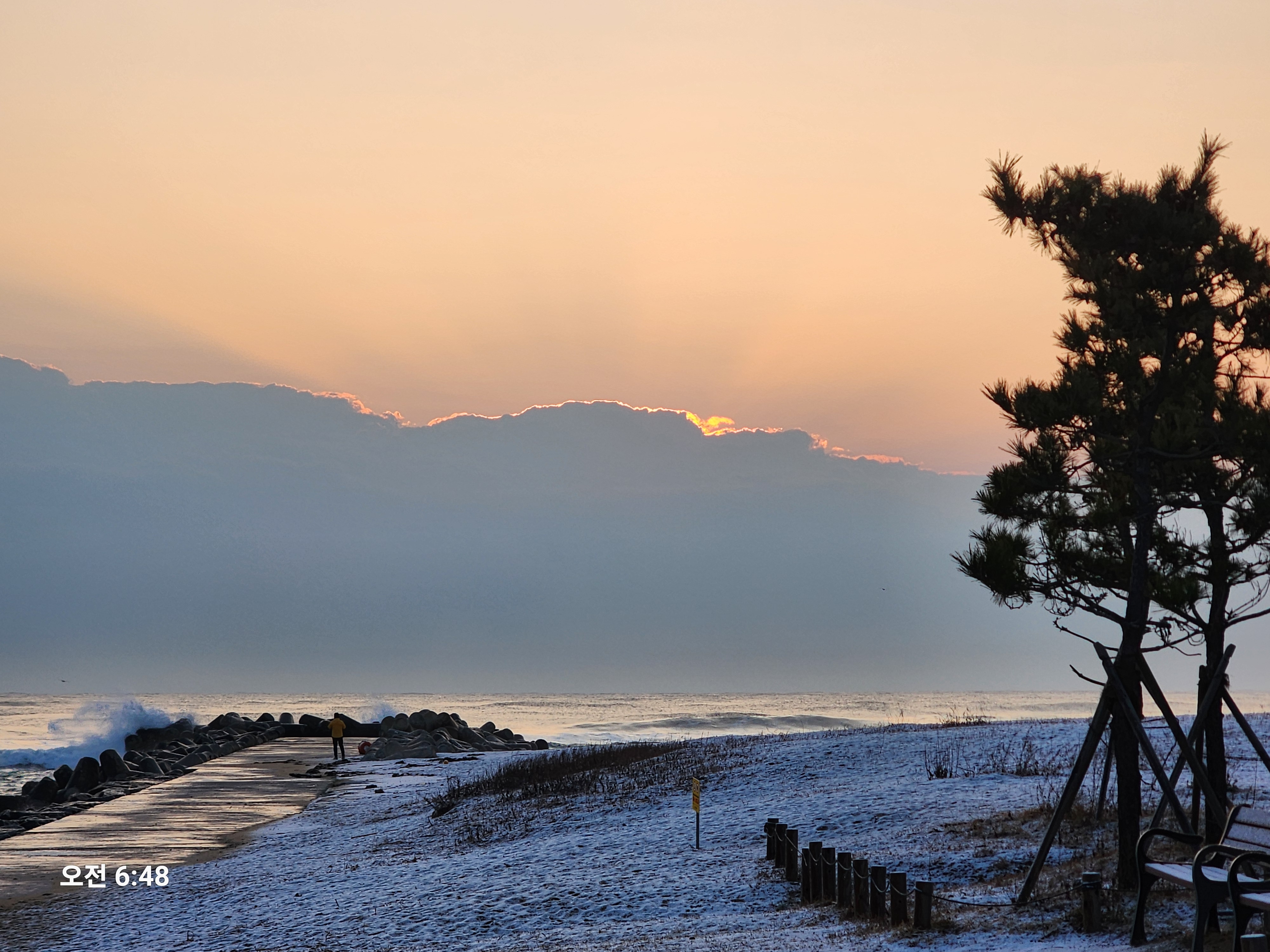 바닷날씨가 흐리고 눈이 내려 여러 날 일출을 못 보았기 오늘은 구름 한참 위에서 모습보였지만 사진에 담았다.