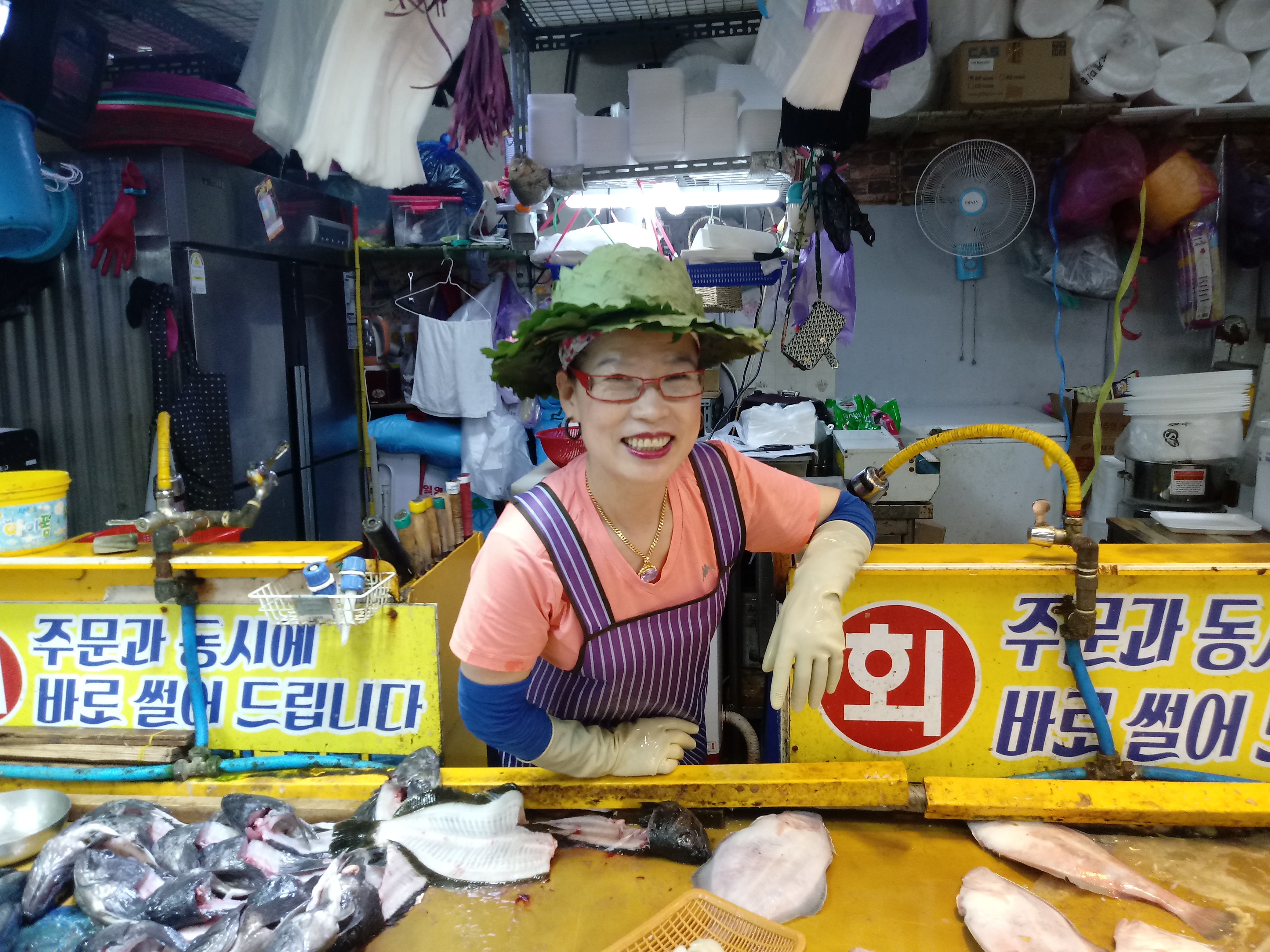 강릉중앙시장 횟집사장에게 선물한 갈잎모자