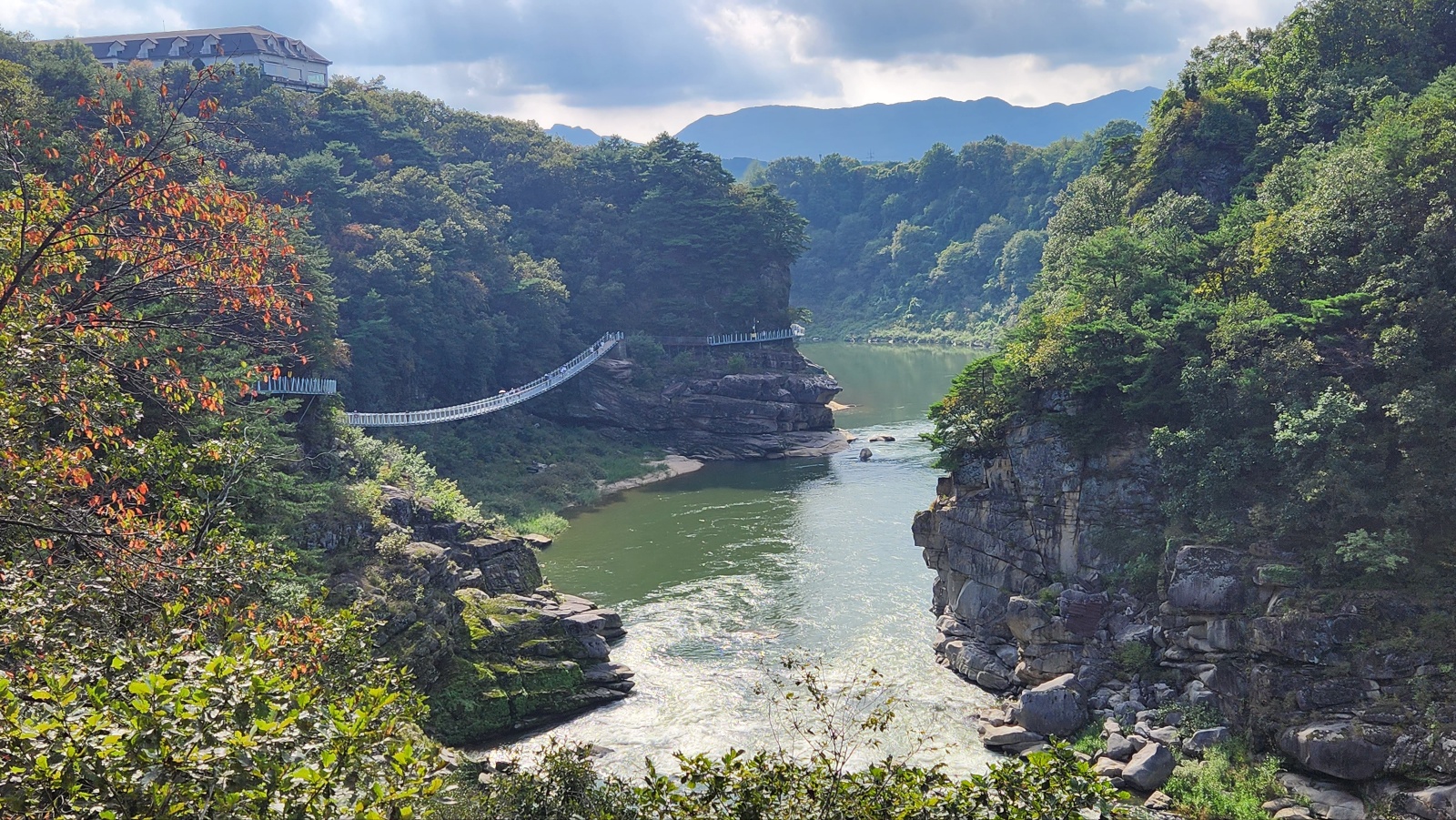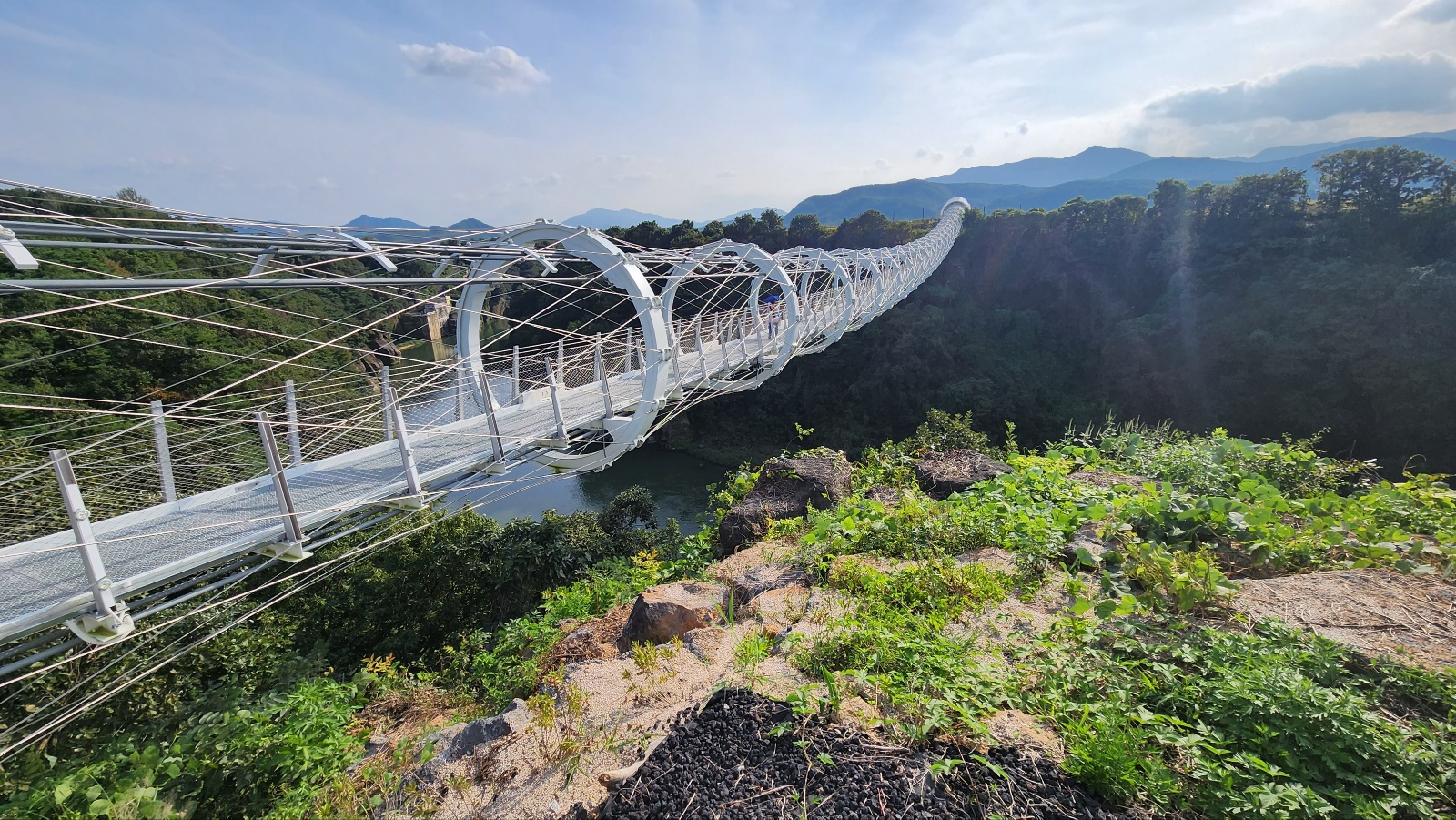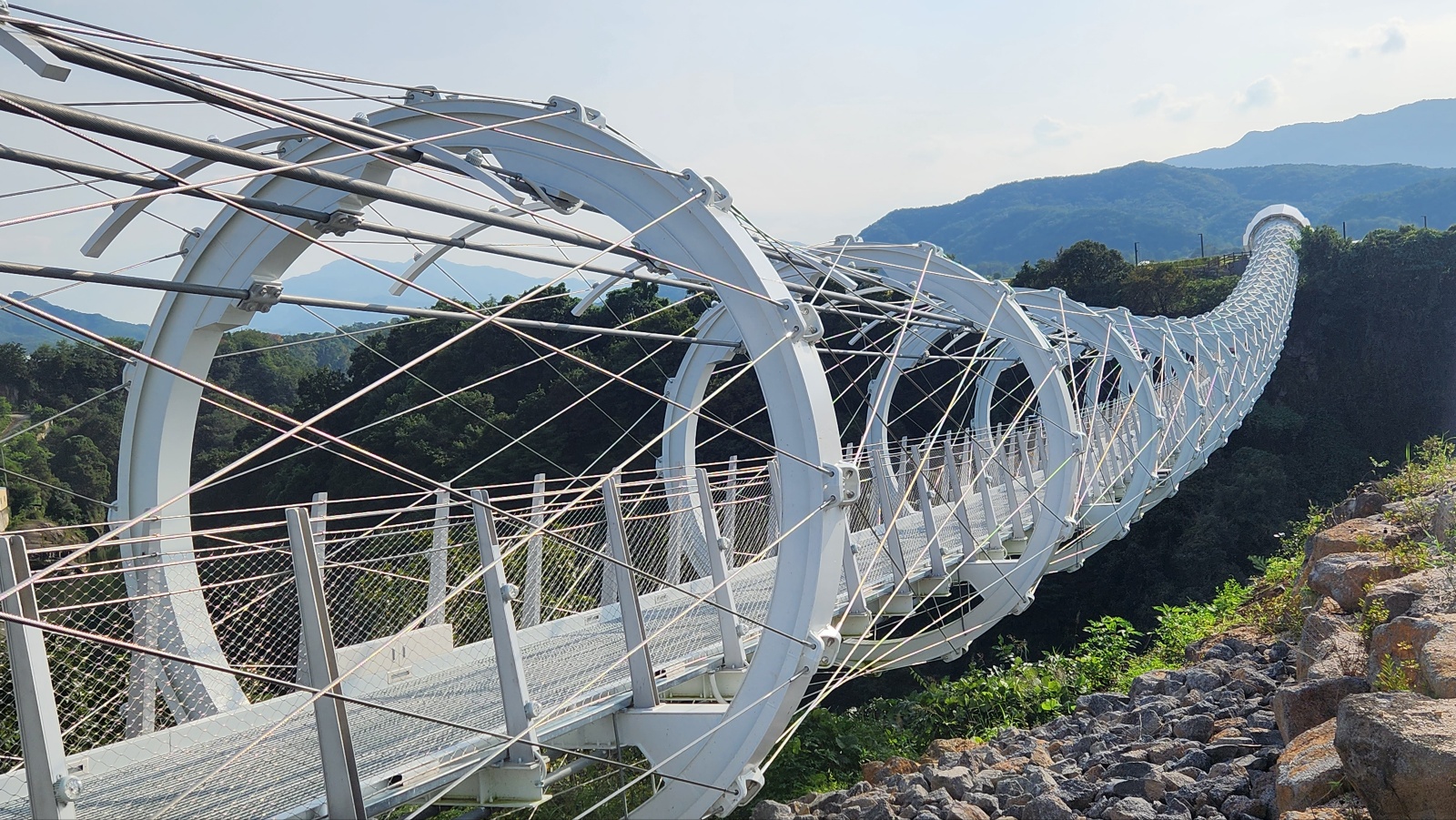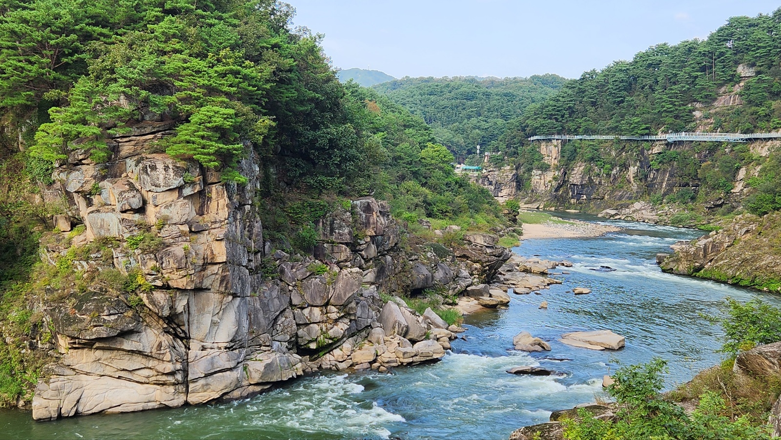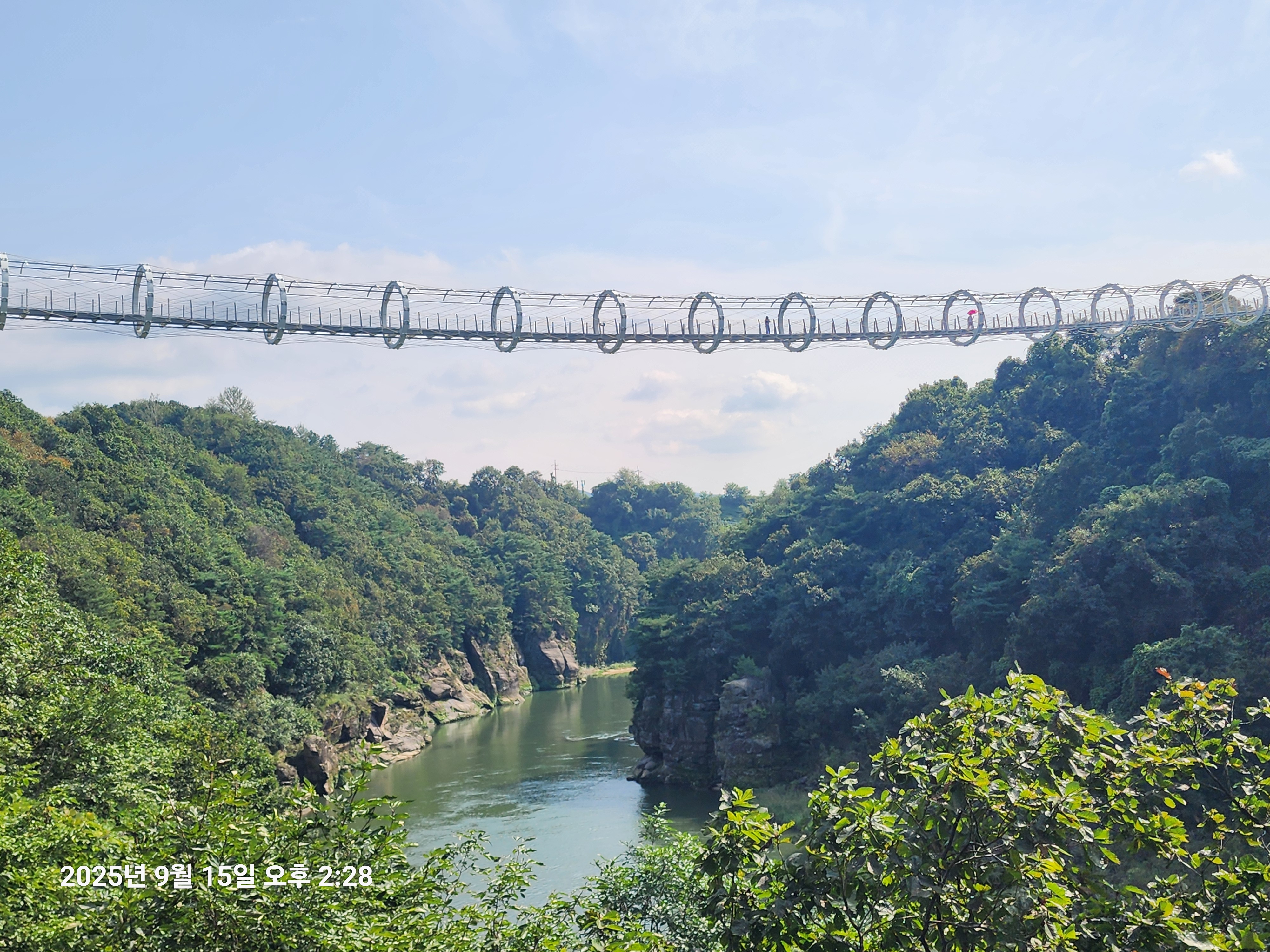 크게 기대했던것에 비해선 아쉬움도 있었지만 한탄강 절벽에 설치한 잔도가 중국 장가계급은 못돼도 한번쭘 가볼만하다 여겨졌다. 잔도의 폭은 1.5m, 총길이는 3.6km( 여러개의 다리 포함)주상절리길 첫 시작점 드르니게이트 통과후, 드르니쉼터- 너른바위쉼터- 드르니 스카이전망대( 반원형)- 쌍자라바위교- 현무암교- 동주황벽쉼터- 철원한탄강스카이전망대(반원형; 주상절리절경구간 전망)- 2번홀교- 샘소쉼터- 화강암교-한여울교- 구리소쉼터-단층교- 순담스카이전망대(반원형)-순담계곡쉼터--순담게이트(종점)