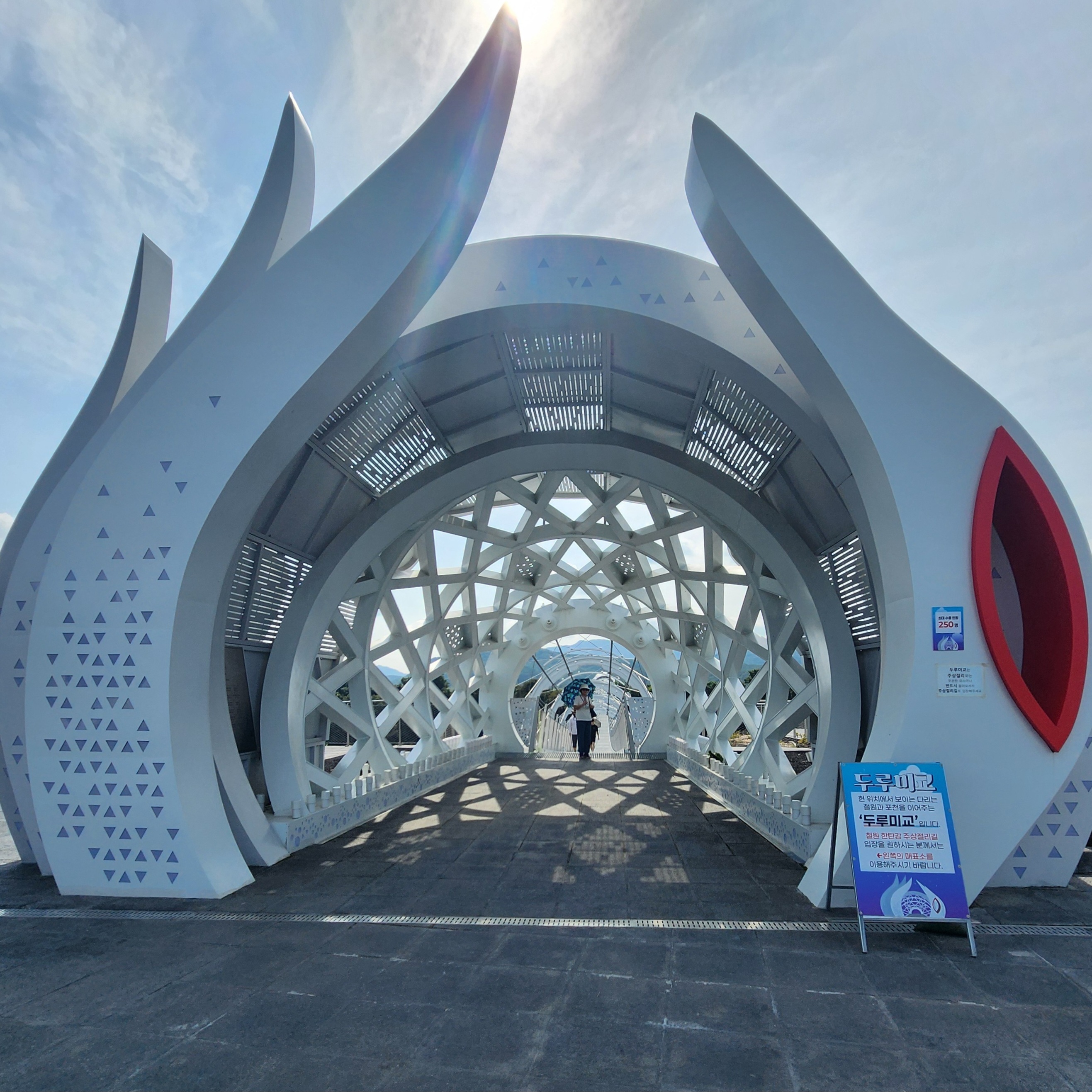 한탄강을 가로지르는 다리(두루미교) 시작점. 동굴로 들어가는 느낌이다.
