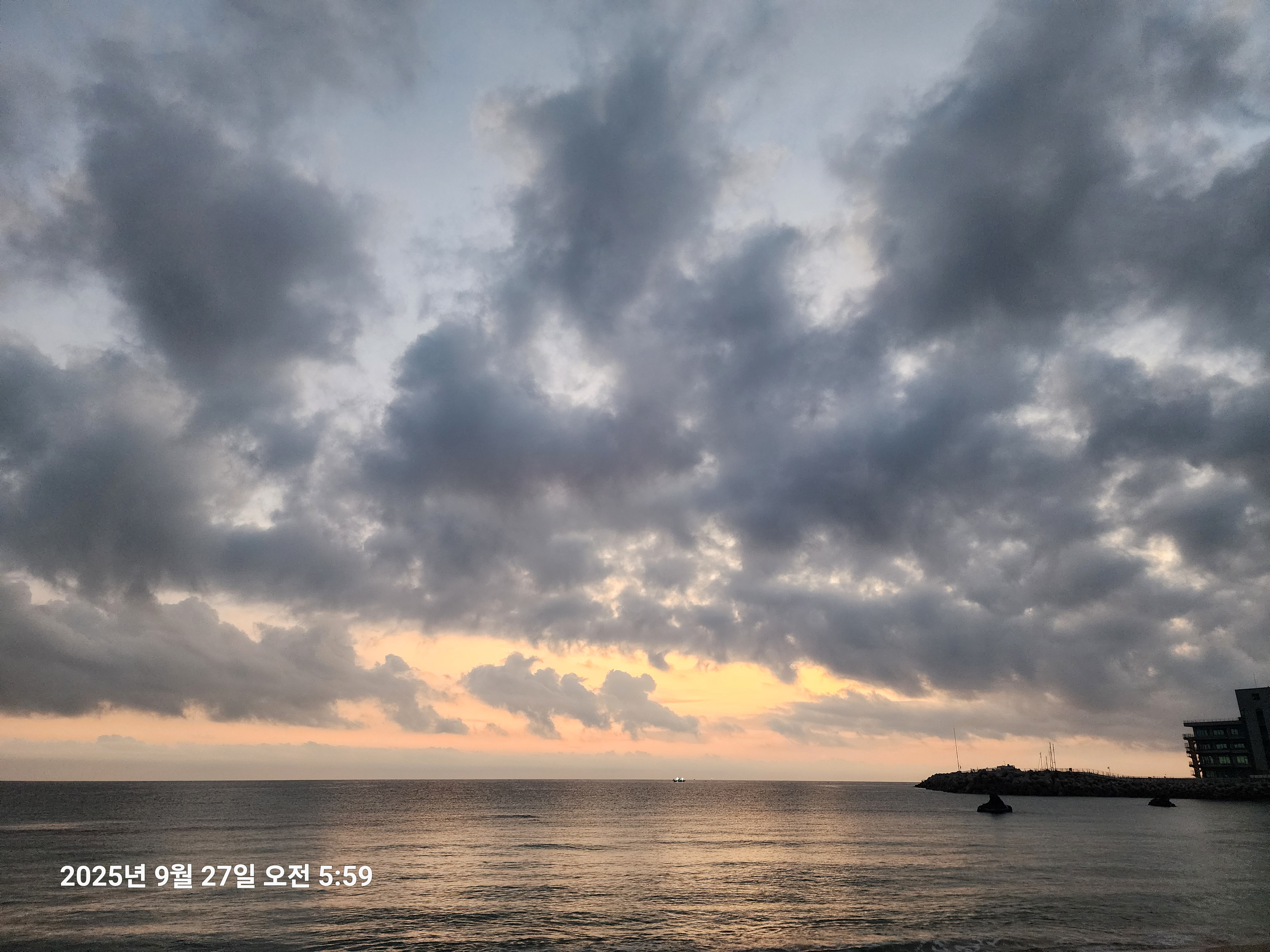 구름 한점 없었던 어제와는 달리 바다 위 하늘에 구름이 많이 끼어 있었는데,