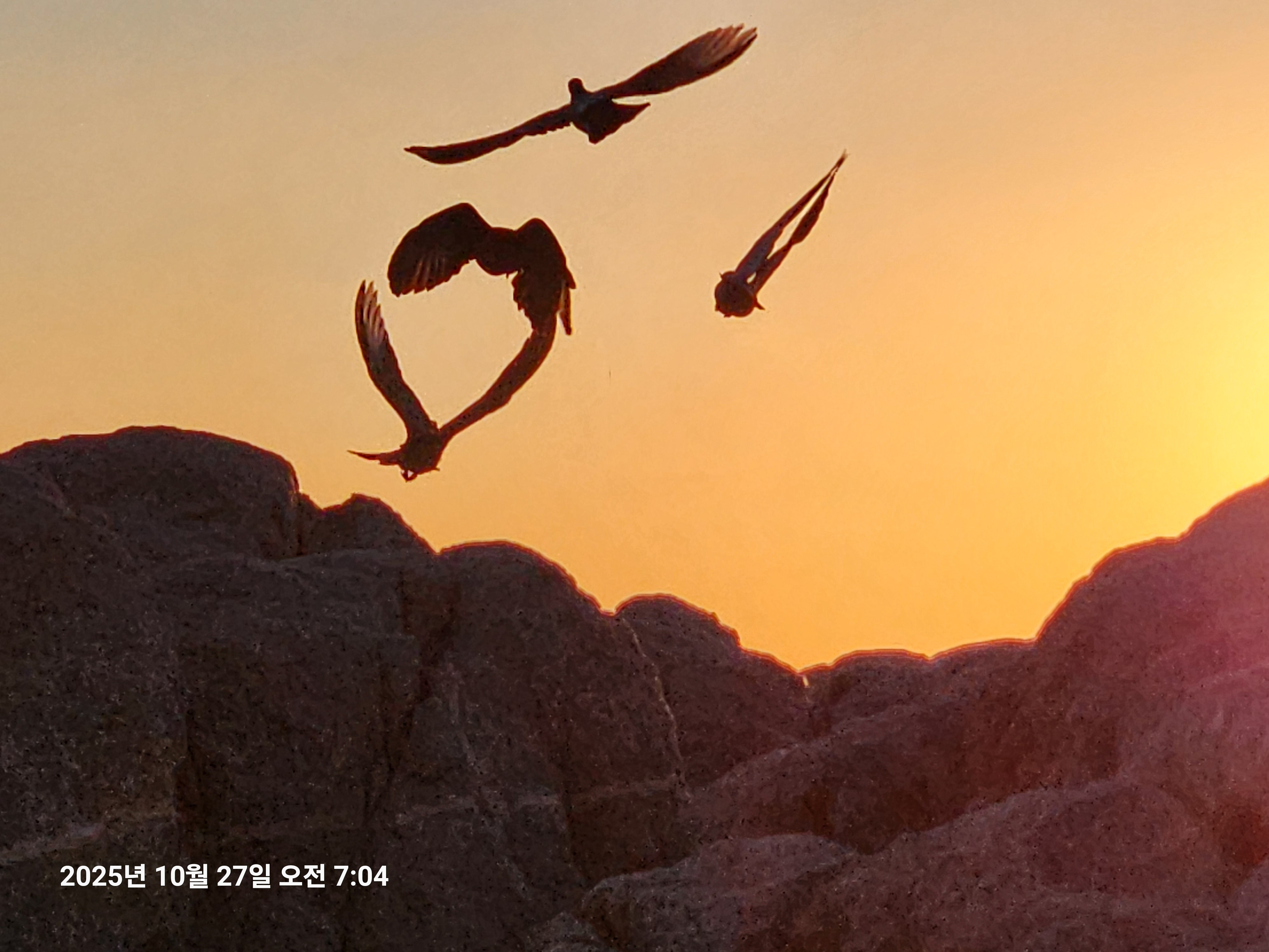 해변 큰 바위위에서 일출을 환영하는 갈매기들이 춤을추며 하트를 만들고,
