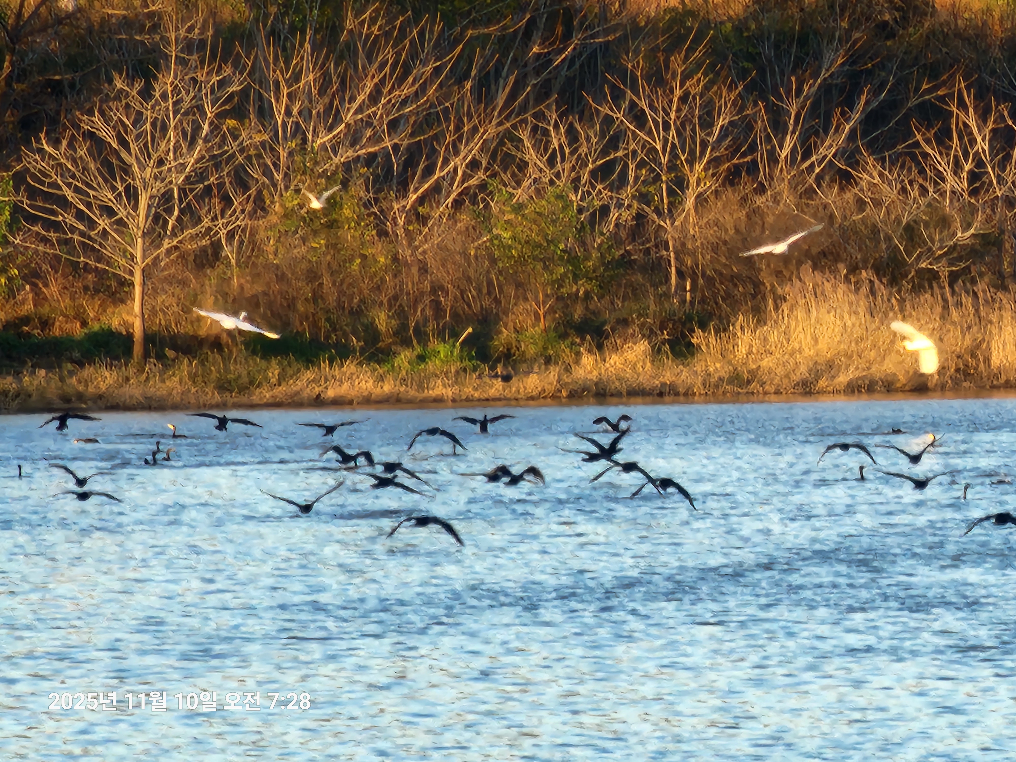 남대천 에서 무리로 옮겨다니는 가마우지 떼
