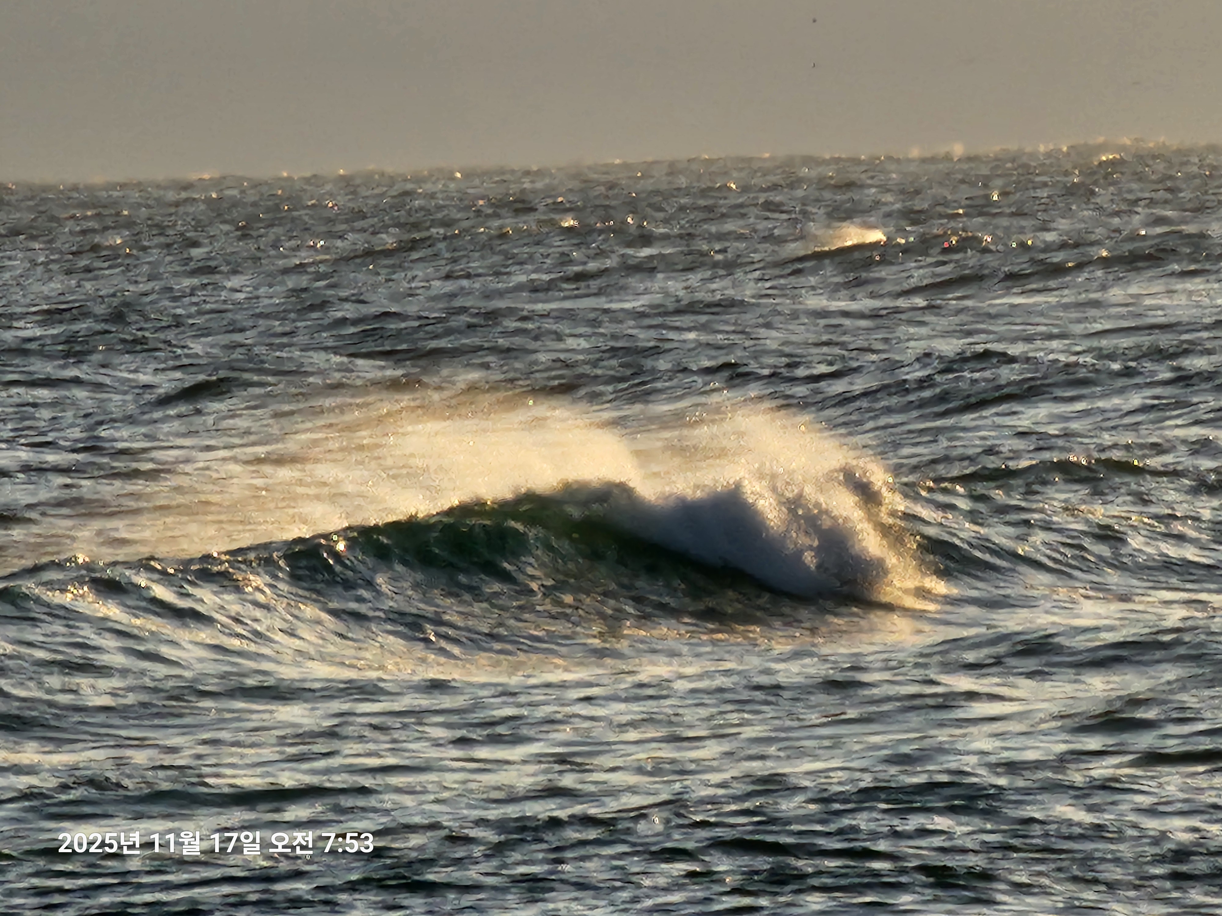 파도가 말갈기 처럼 날리며 햇빛받아 빛난다( 송정해변에서...역광)