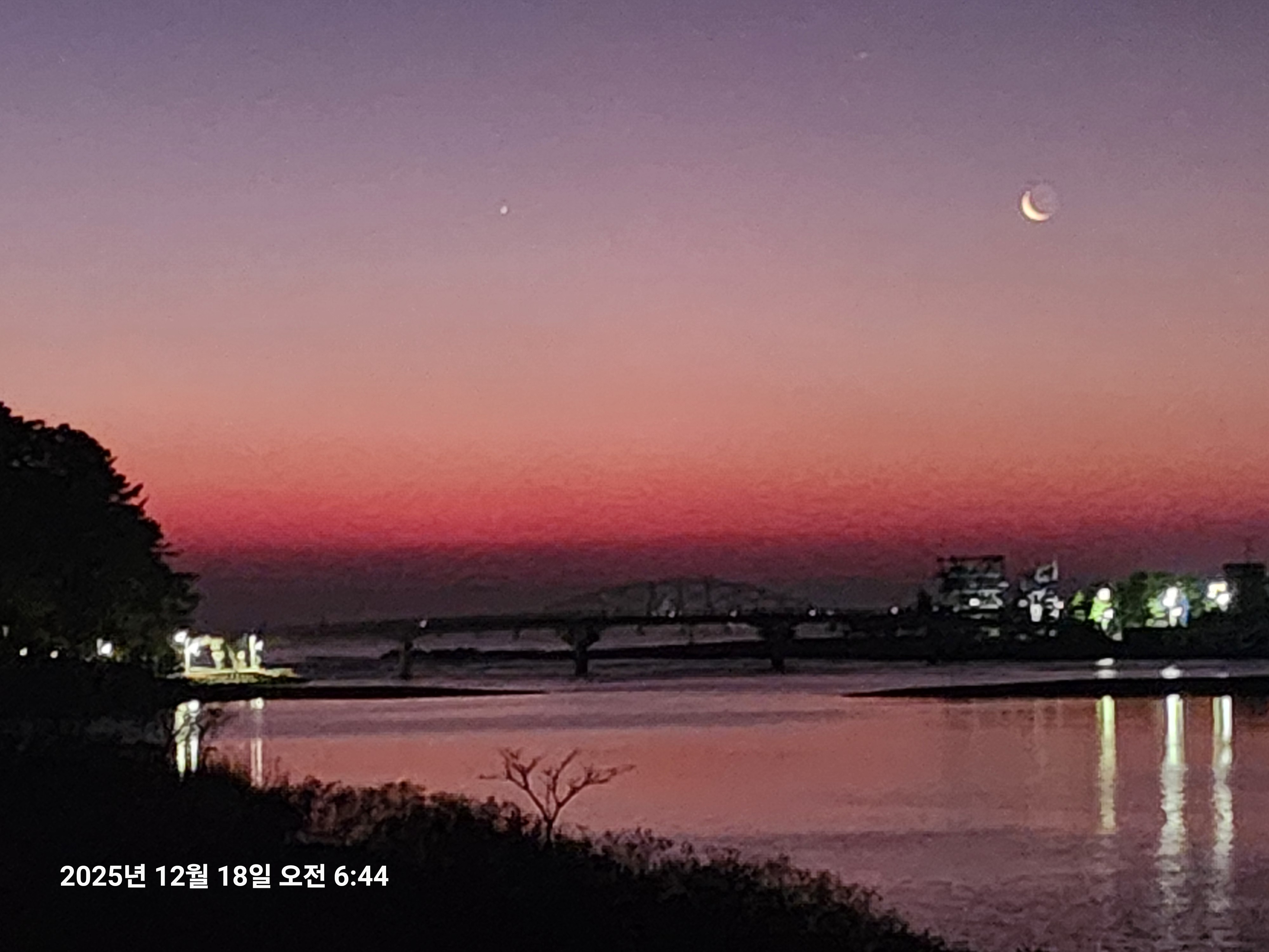 남대천 둔치길을 걸어 바다로 향하는 길, 지난밤에 내린 약간의 빗물이 얼어 둔치 길이 엄청 미그러웠는데, 동남쪽 하늘에 야윈 얼굴의 그믐달도 일출을 기다리는 듯.....