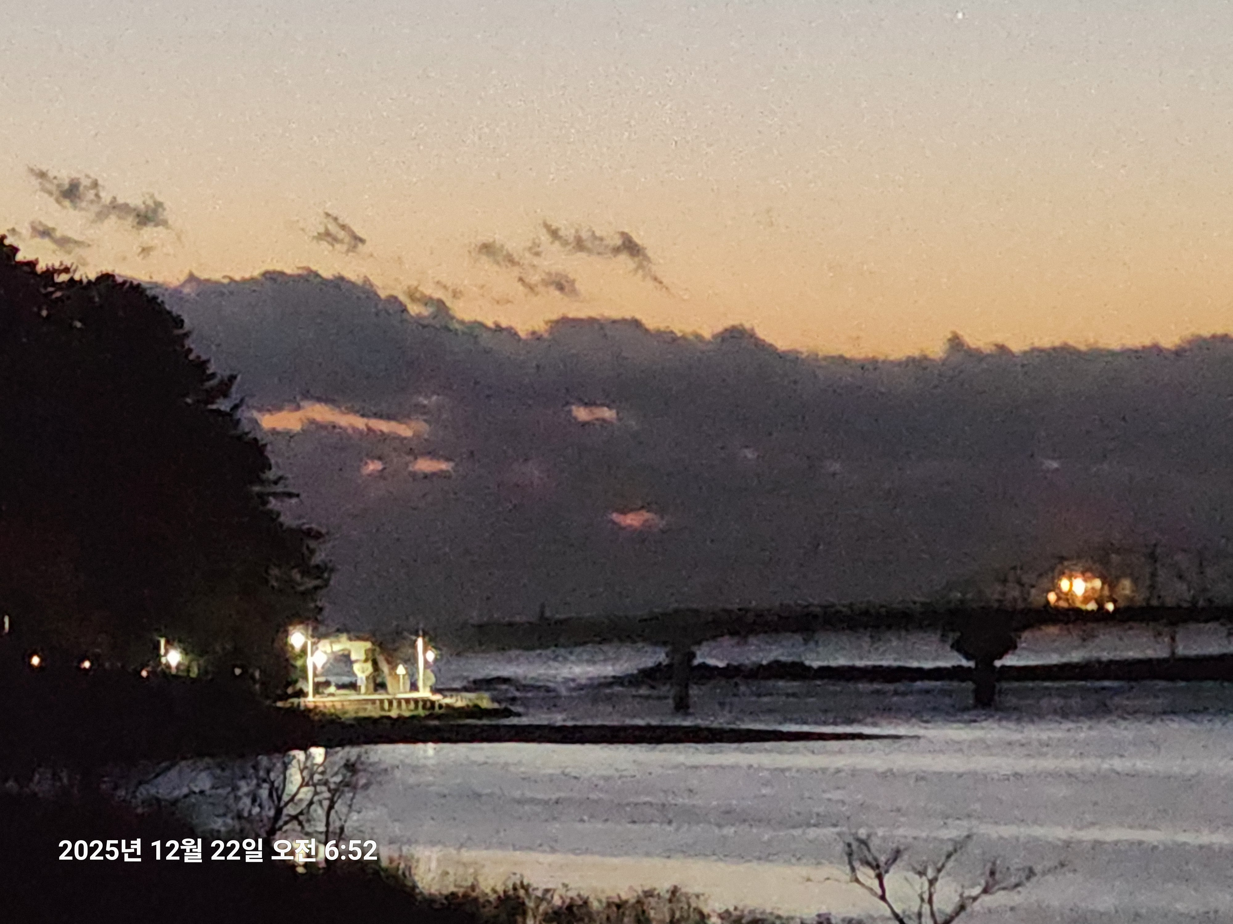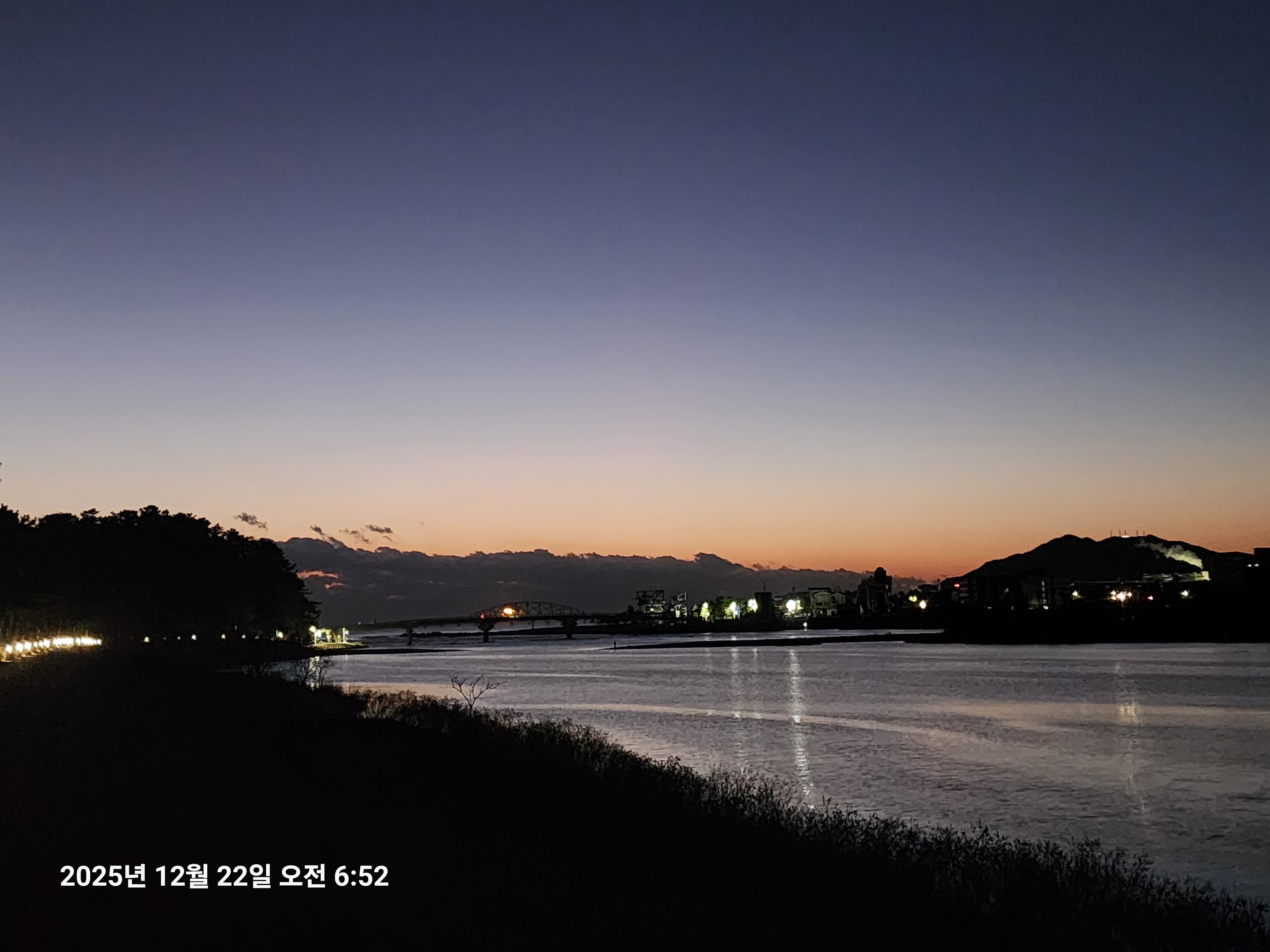 어제보다 기온이 더 내려갔고 남대천 공항대교 부근에서 바라본 바닷가엔 짙은 구름이 길게 끼어 있는 것이 마치큰 산맥이 생겨 괘방산에 연결되기라도 한것처럼 보인다.