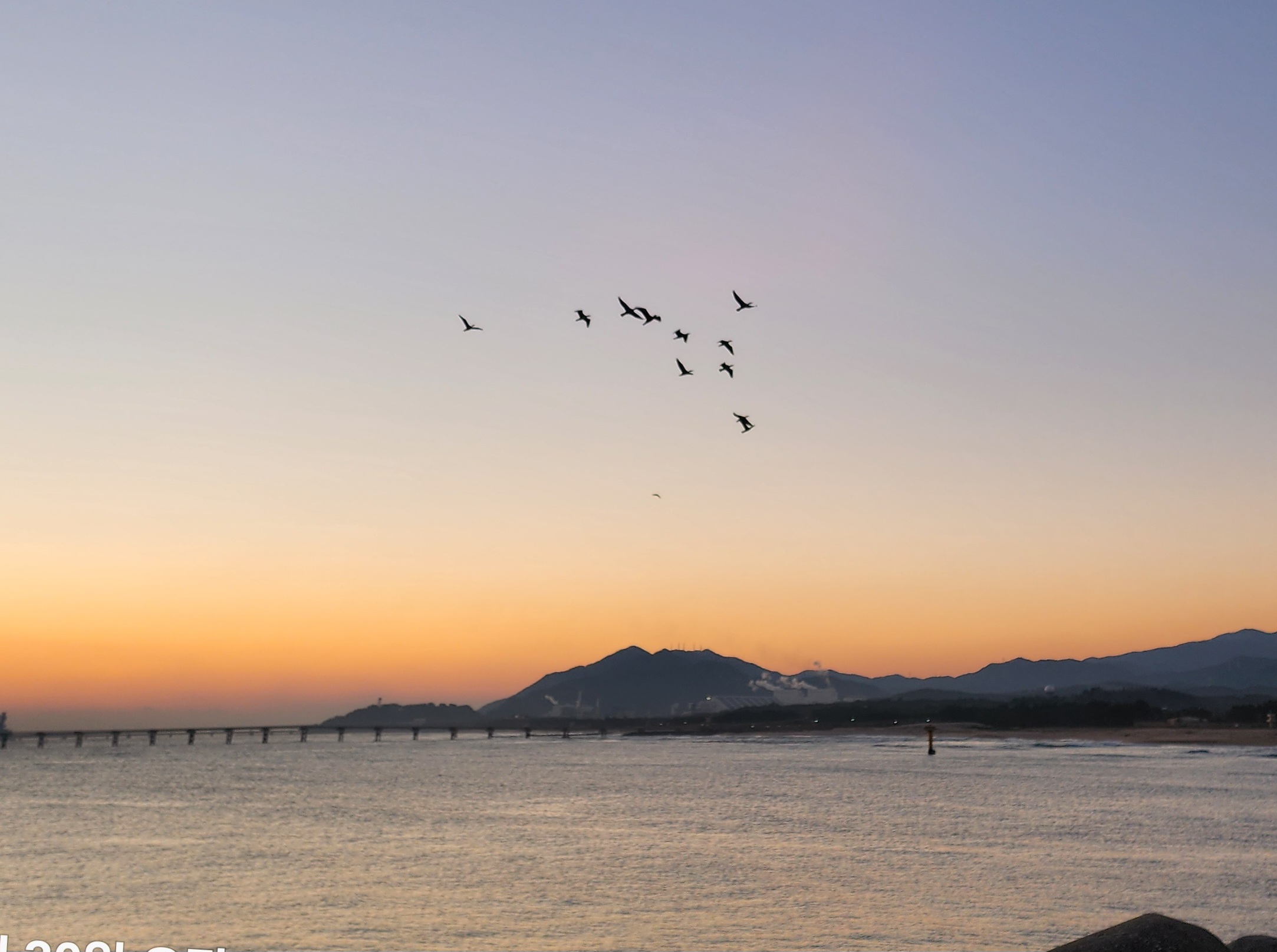 오늘도 1월1일 일출을 앞당겨 왔다는 이들이 좀 있었다. 남방파제 앞바다는 잔잔하여 호수 같고. 커피거리 앞바다는 약간의 파도가 있다.