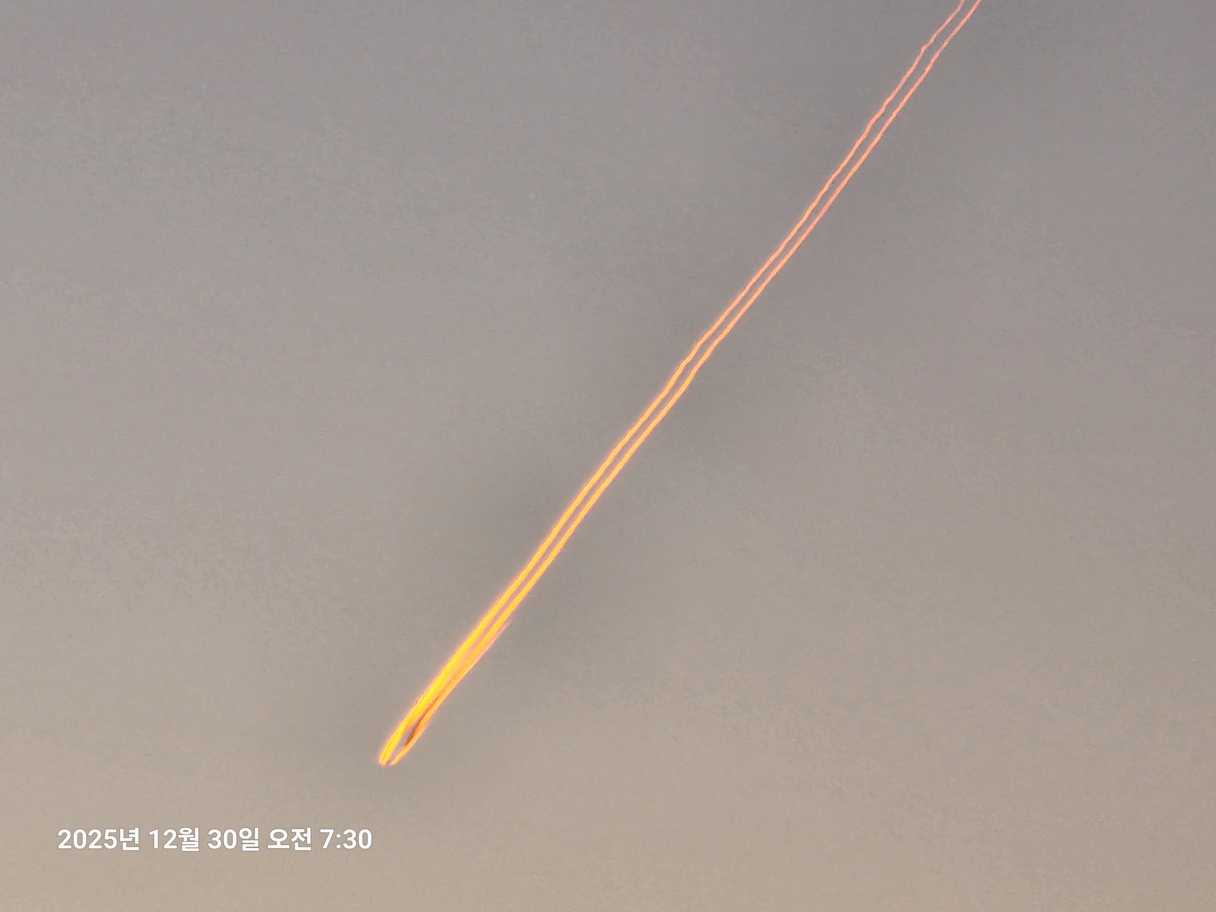 제트기가 내뿜는 연기가 먼저 햇빛을 받으며 일출을 응원한다.