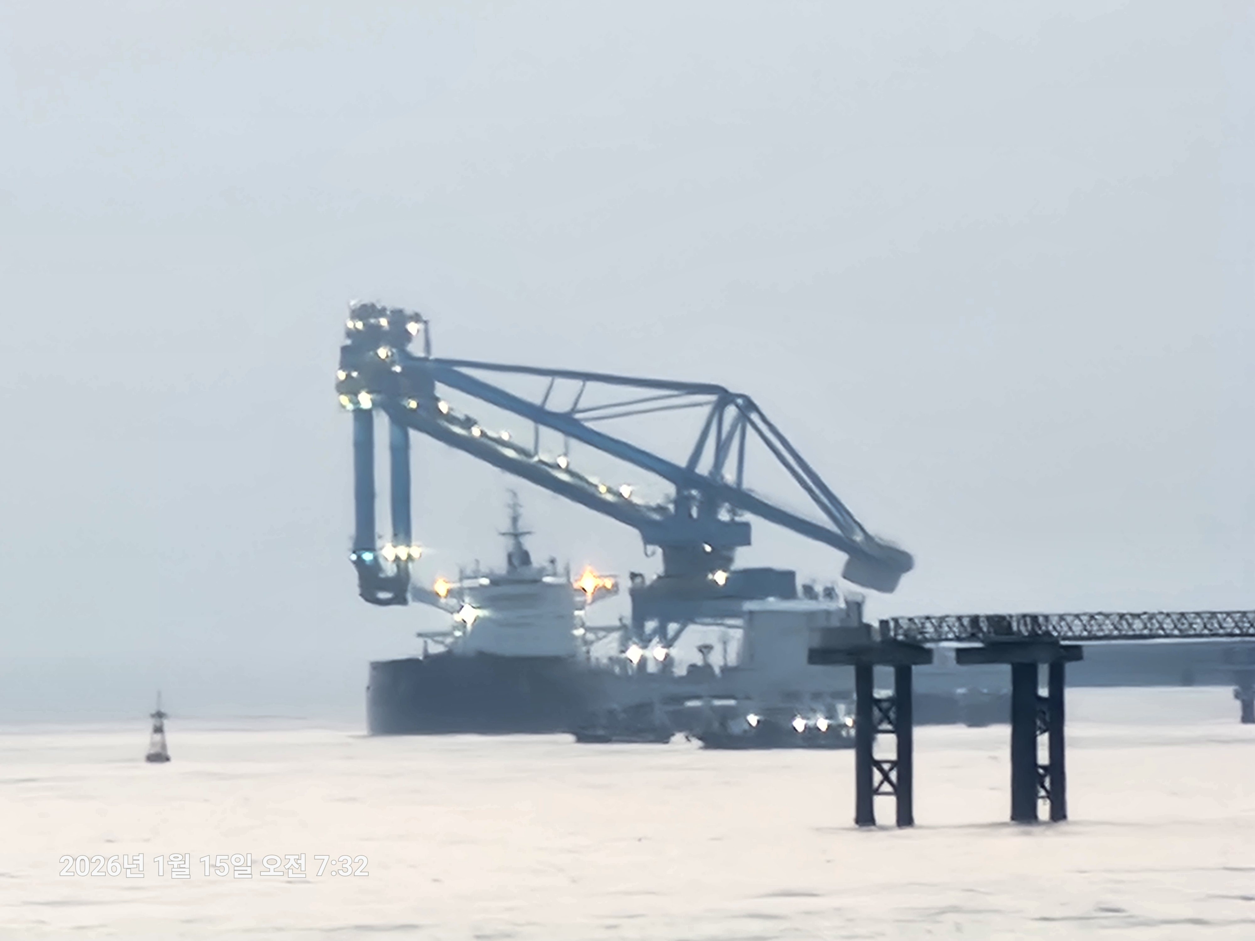 안인화력 연료. 석탄을 싣고온 배(좌측)가 하역장비(위로 뾰족한 것)옆에 정박하고있다.화물선의 정면을 보이고 있어 작게 보이나, 옆에서 보면 대형화물선이다