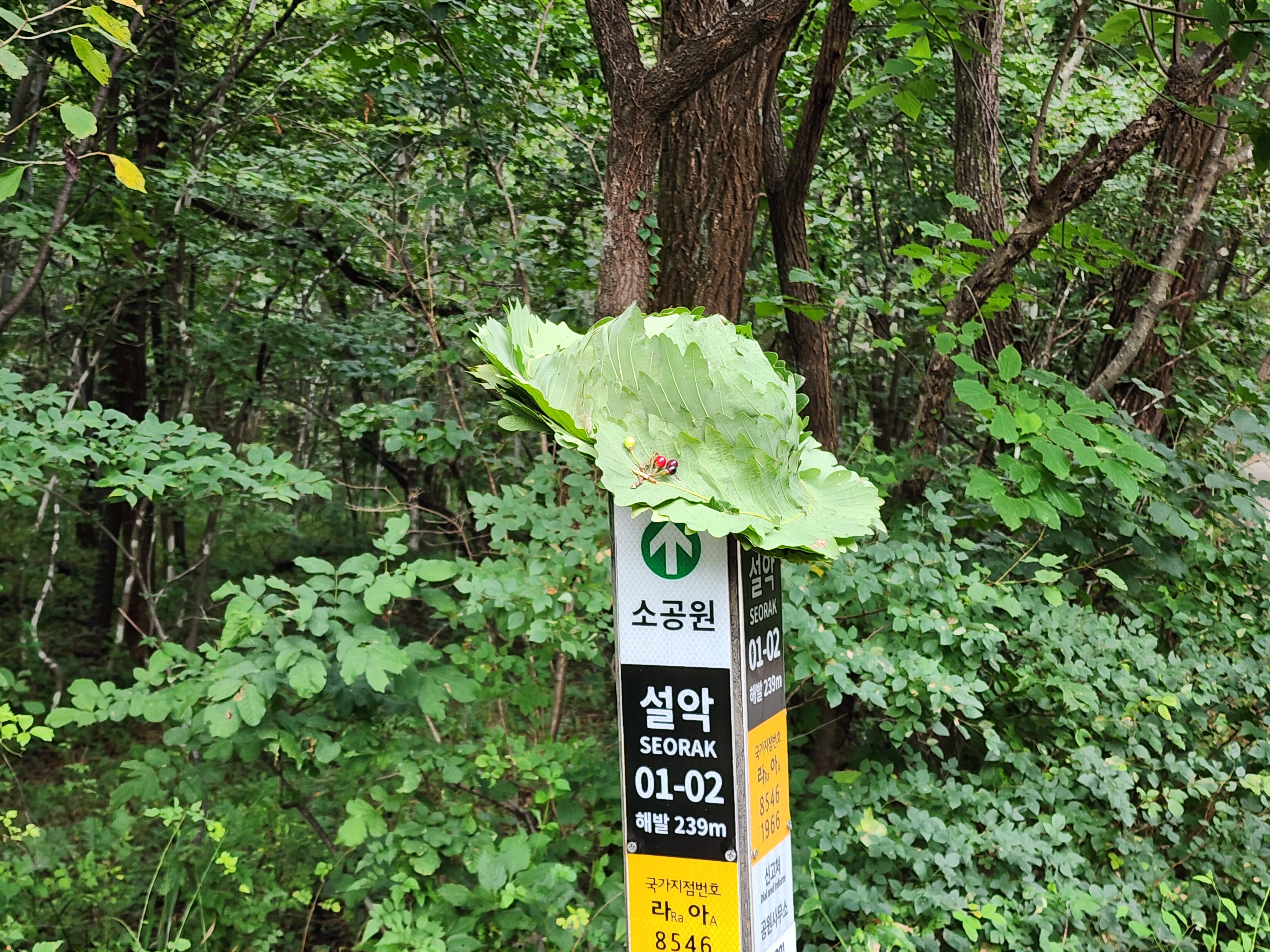 찾을수 없어 신갈나무잎을 뜯어 모자를 하나 만들어 들고 내려 오는 동안 여러명을 만났지만, 관심을 보이는 사람이