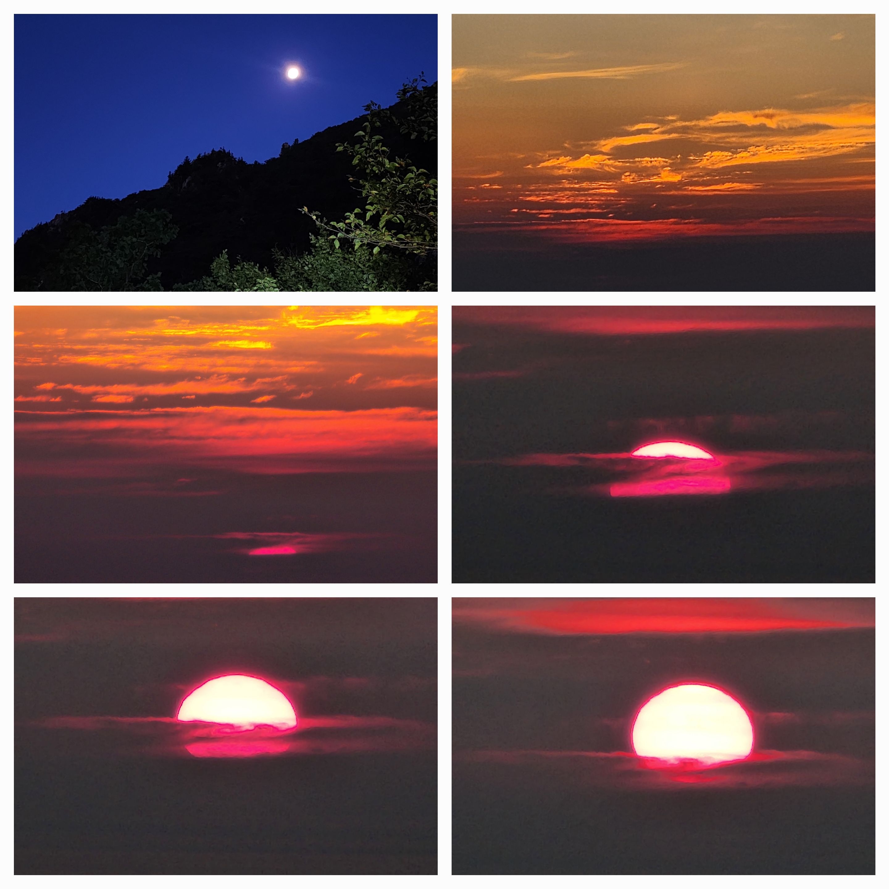 금강문에서 본 공룡능선을 넘는 달, 마등령 오르는 길에 본 일출, 수평선을 선명히; 구분할수 없다