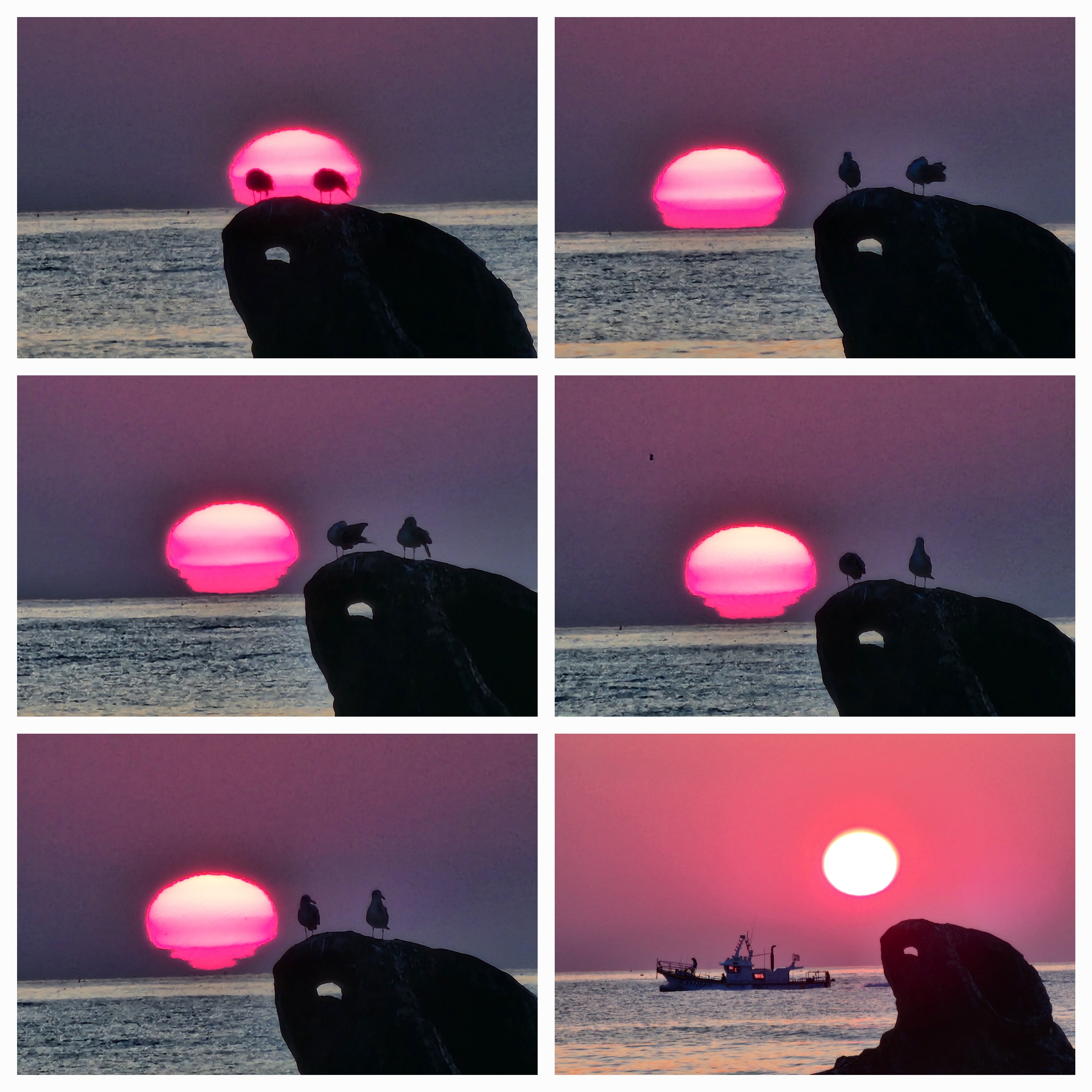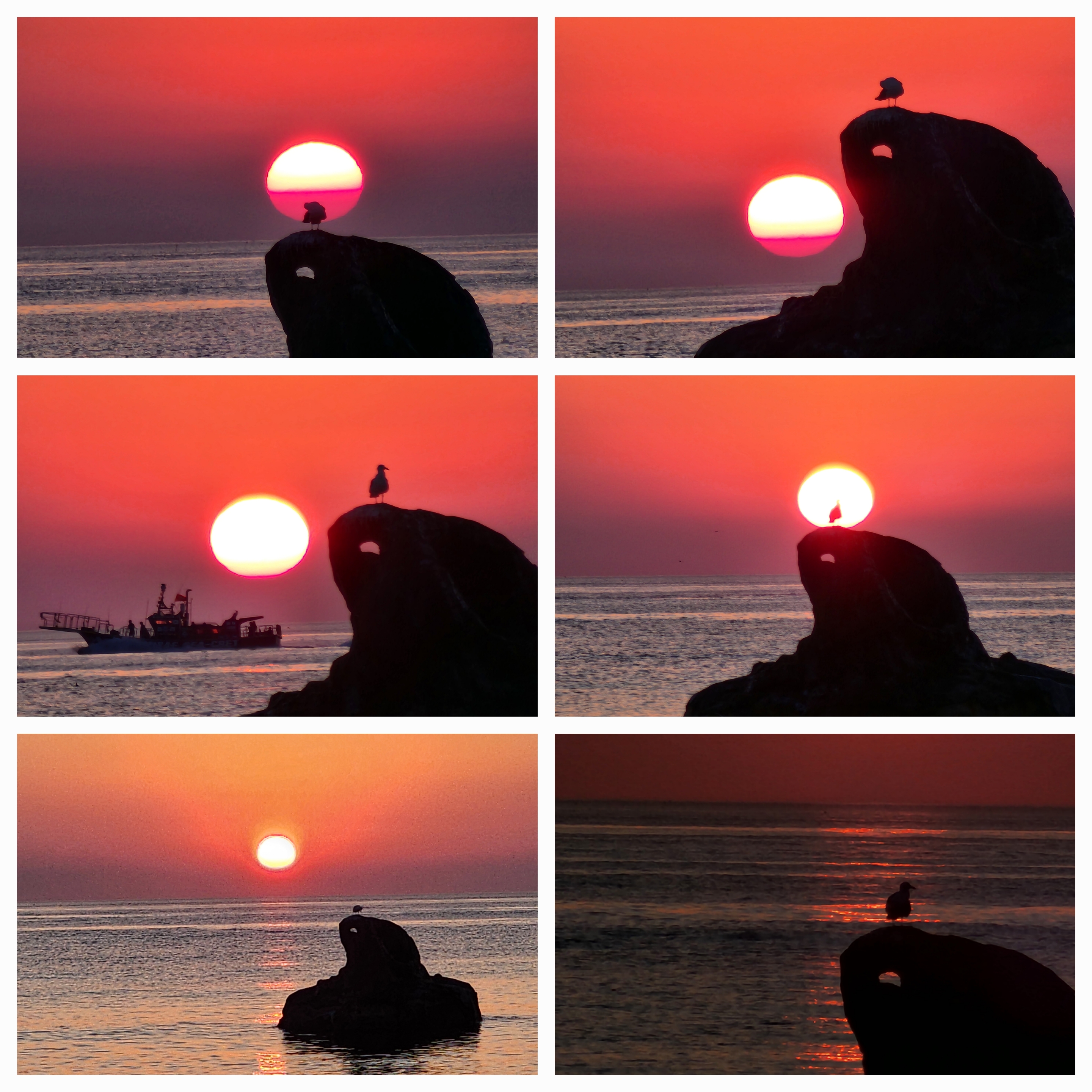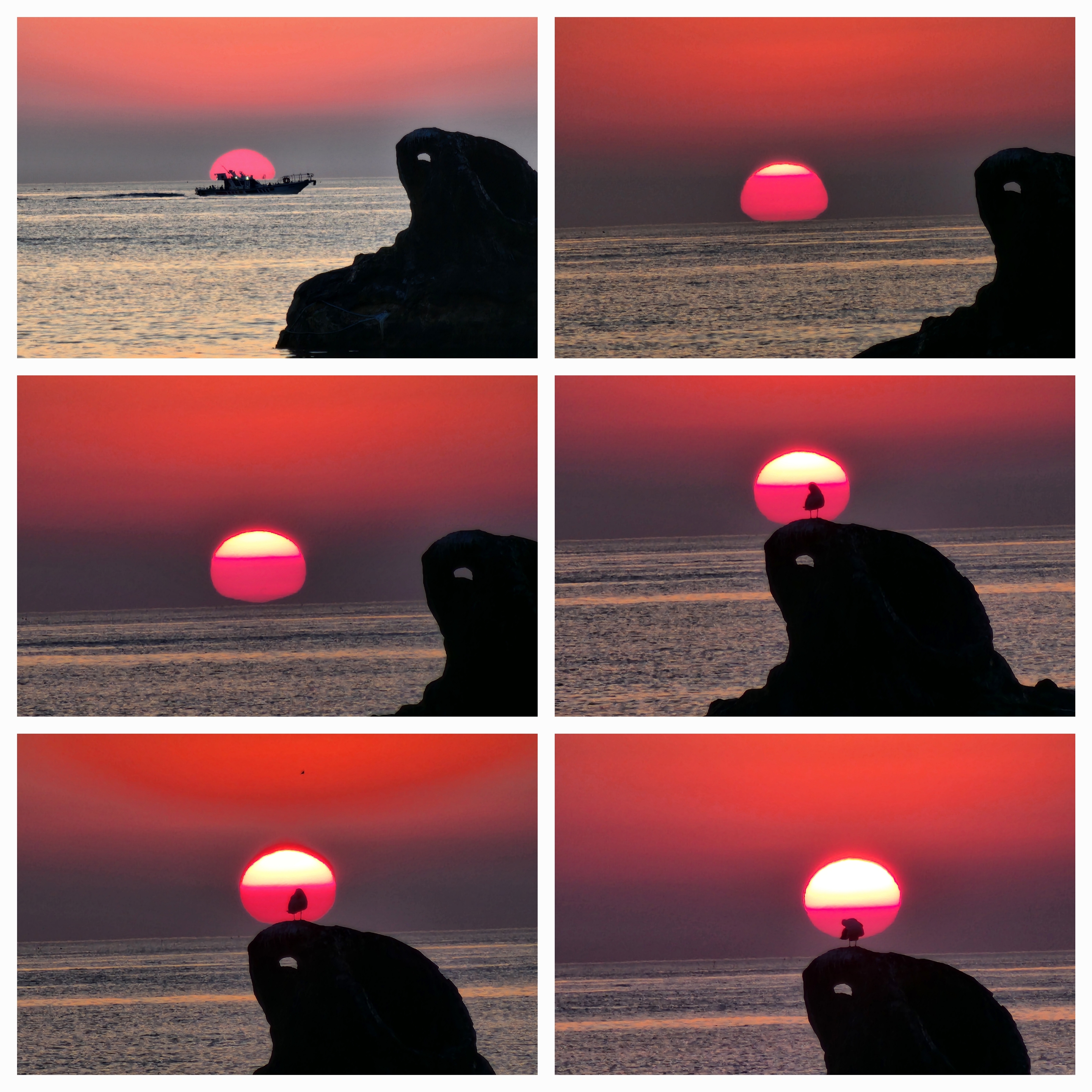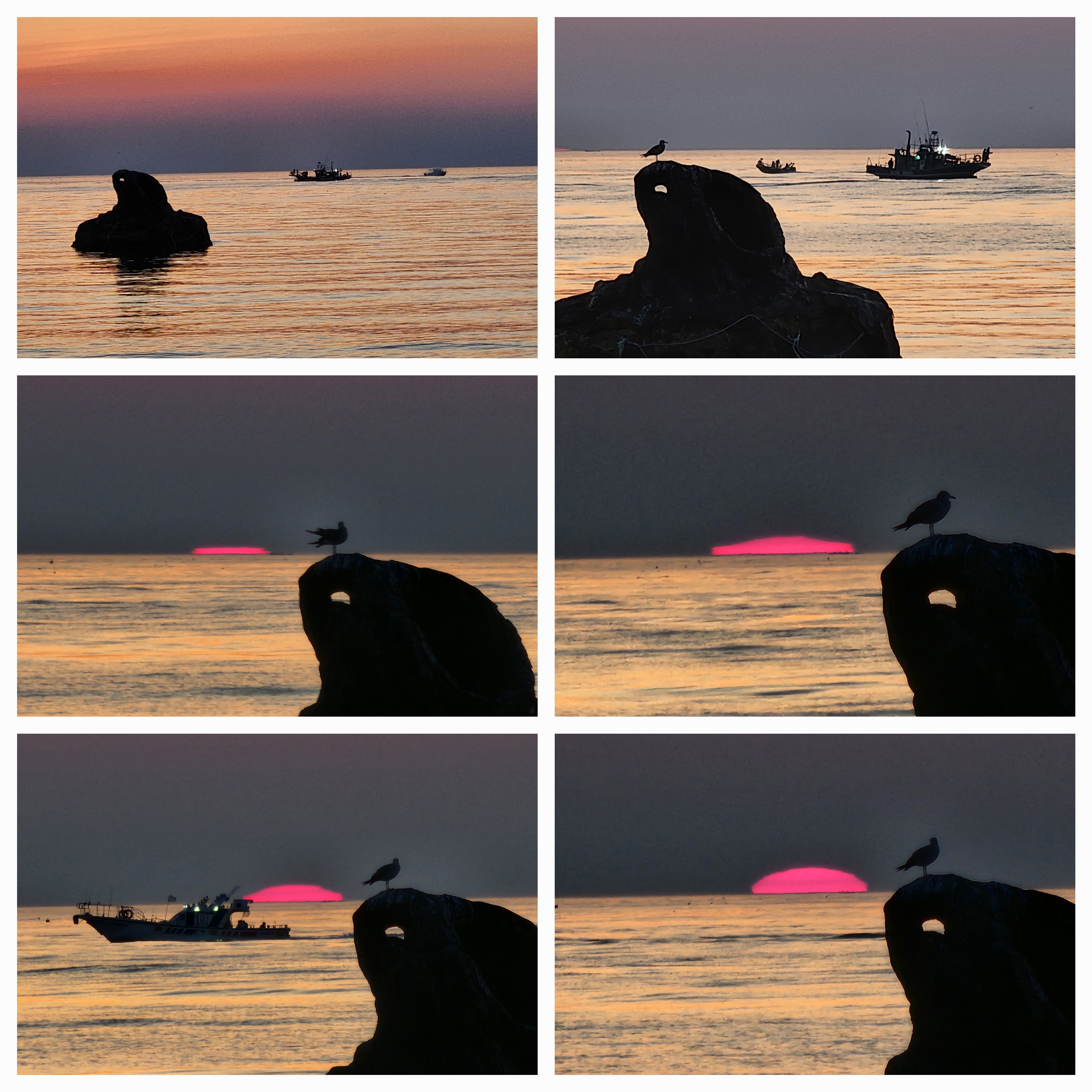 오메가현상을 동반한 수평선 일출이다... 해는 외계인(?)닮고.. 갈매기가 잠시 모델을 자청한다.