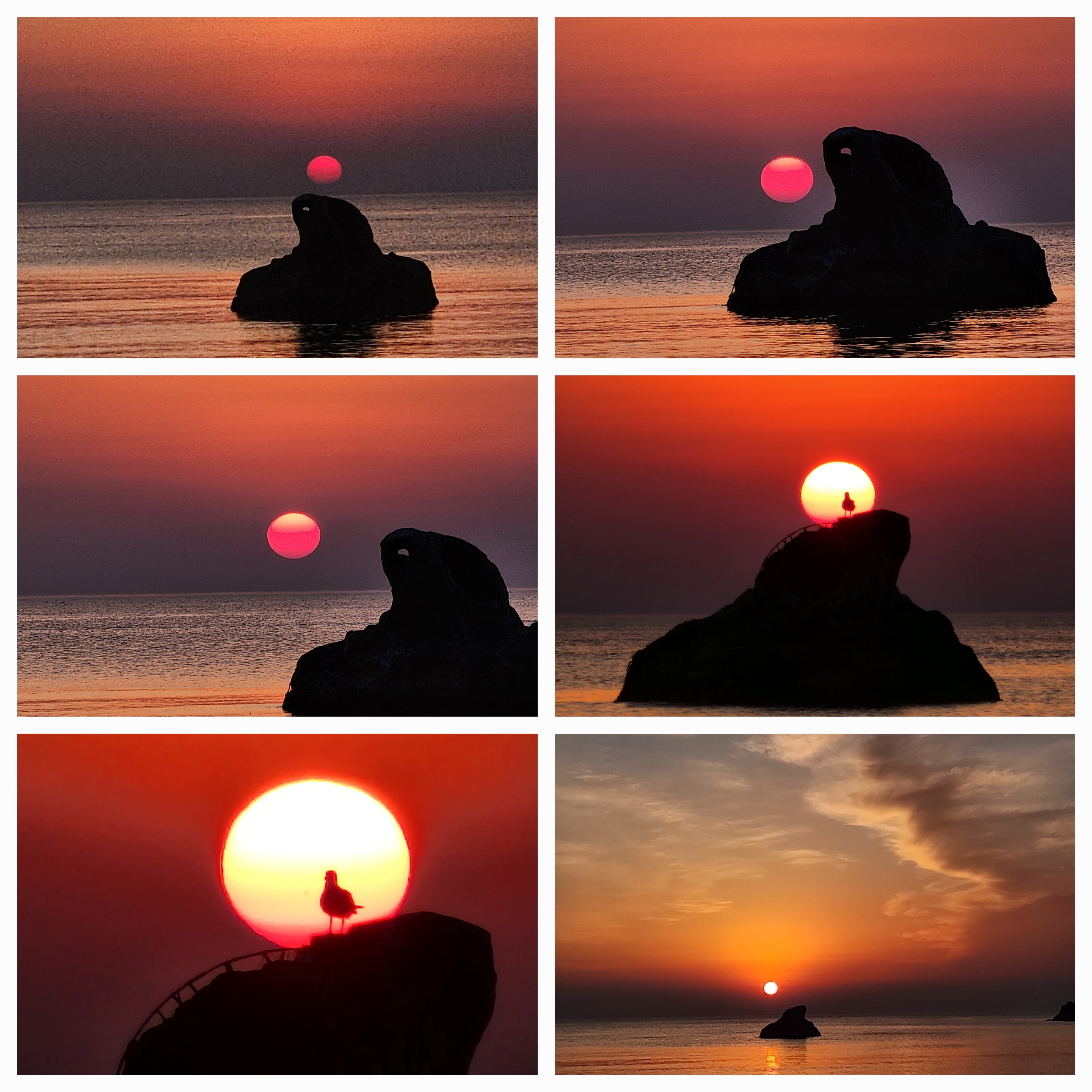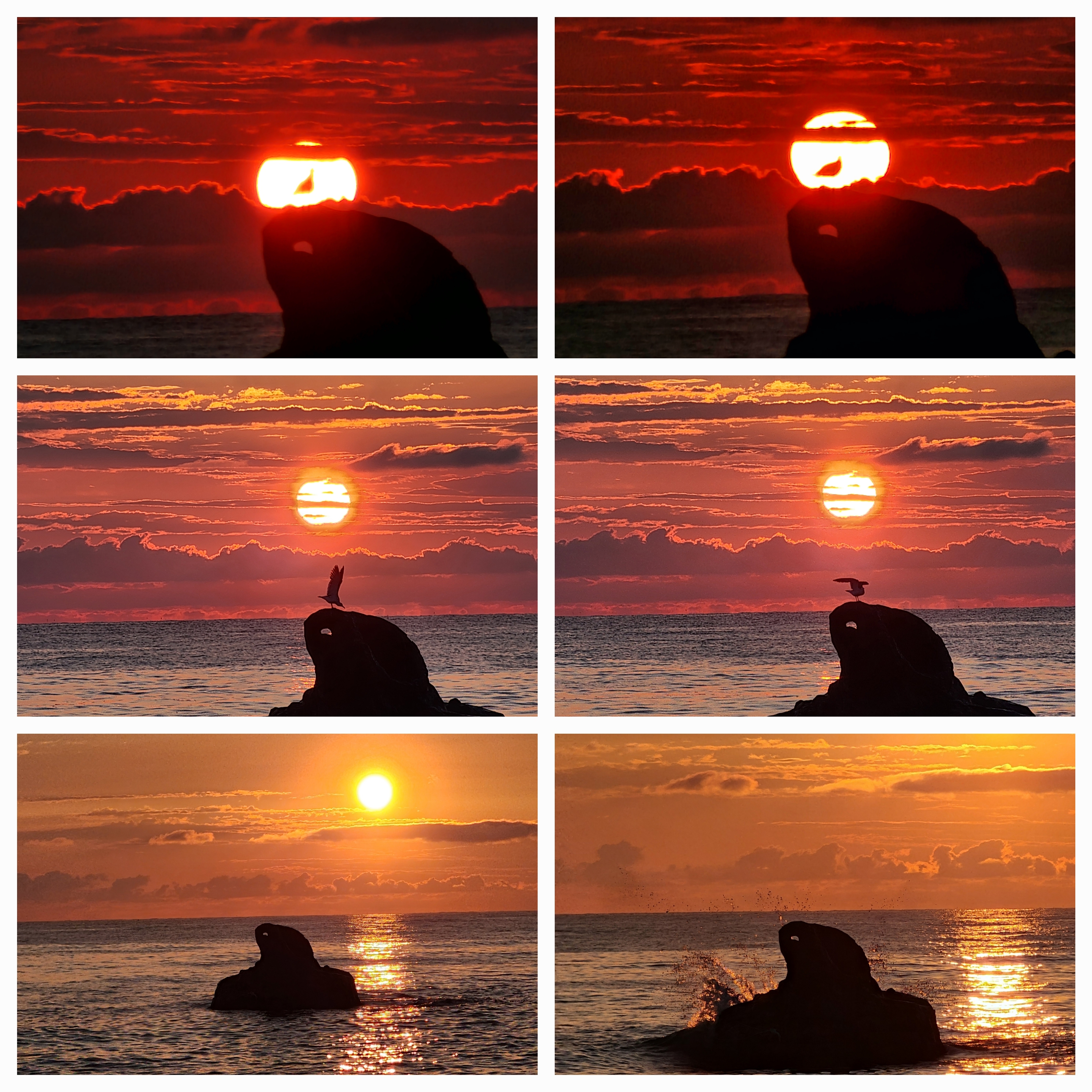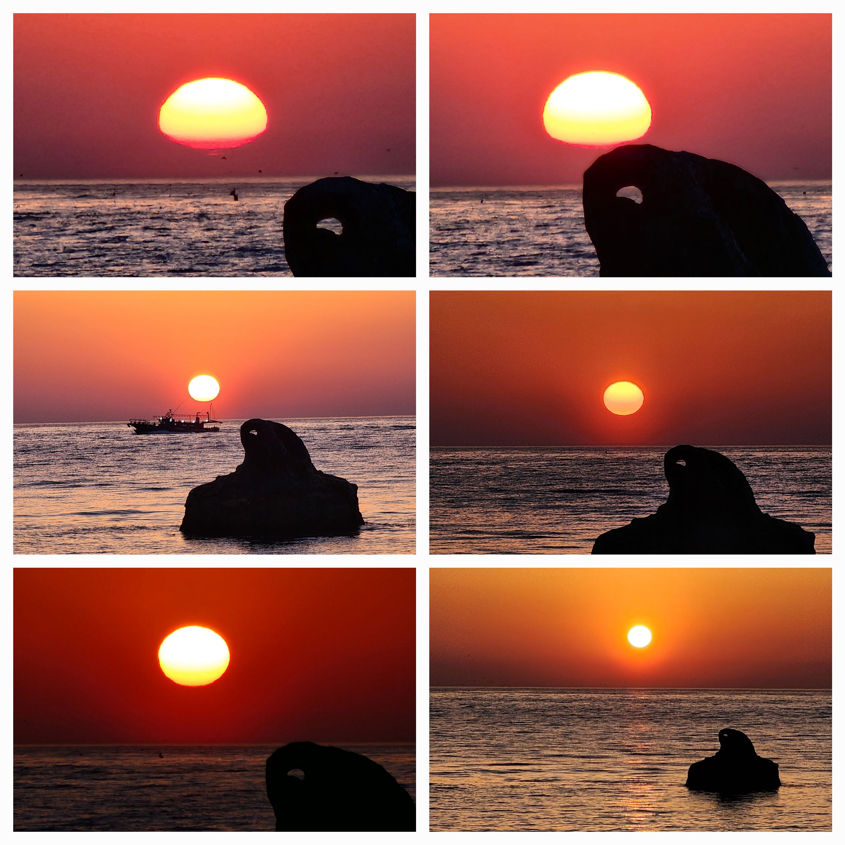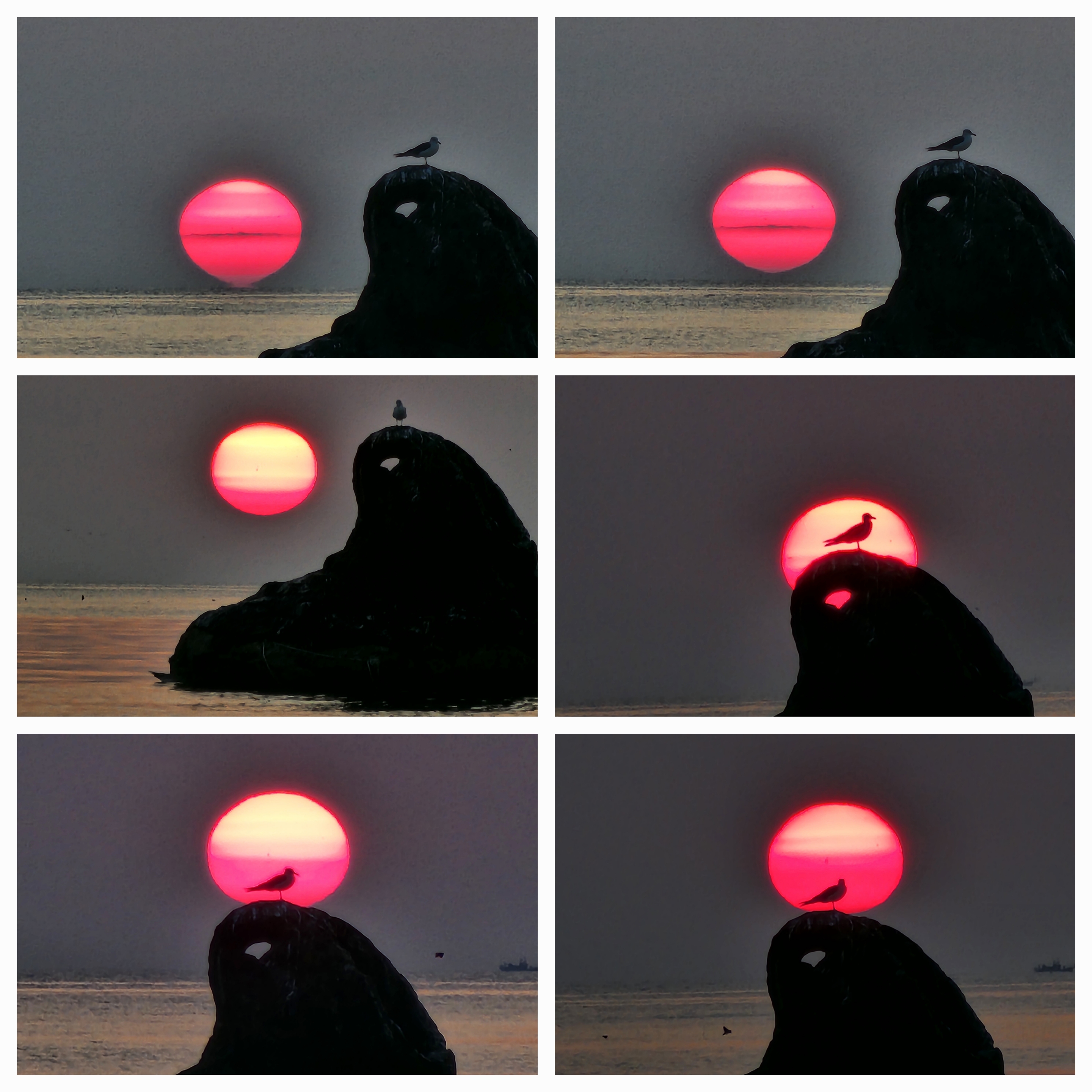 오메가현상을 동반한 수평선 일출이다... 해는 외계인(?)닮고.. 갈매기가 잠시 모델을 자청한다.
