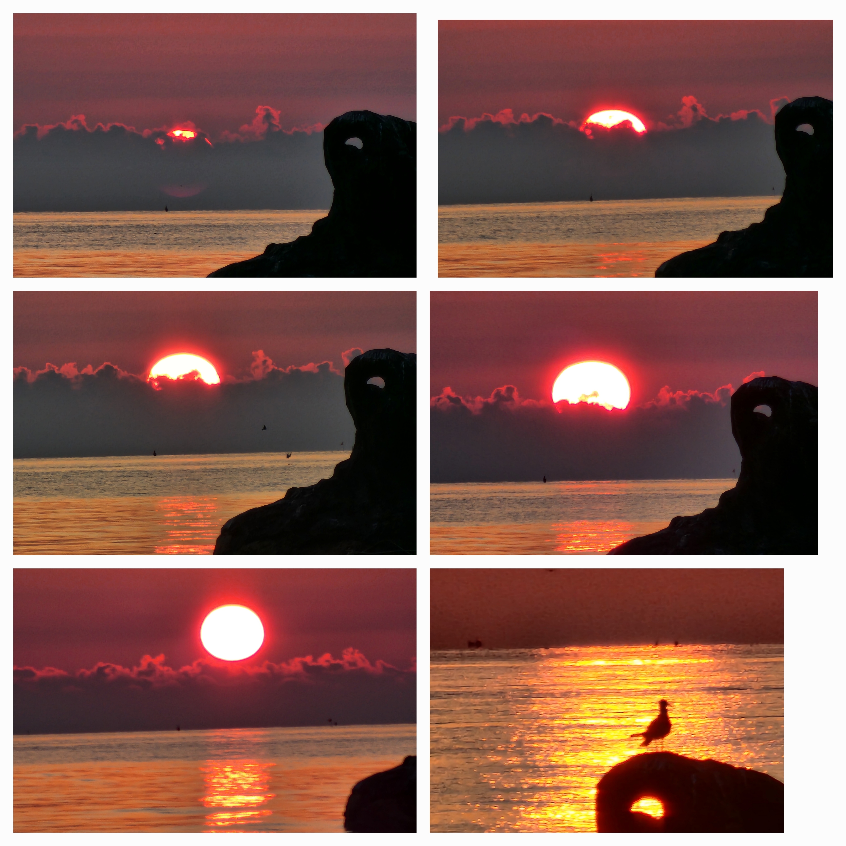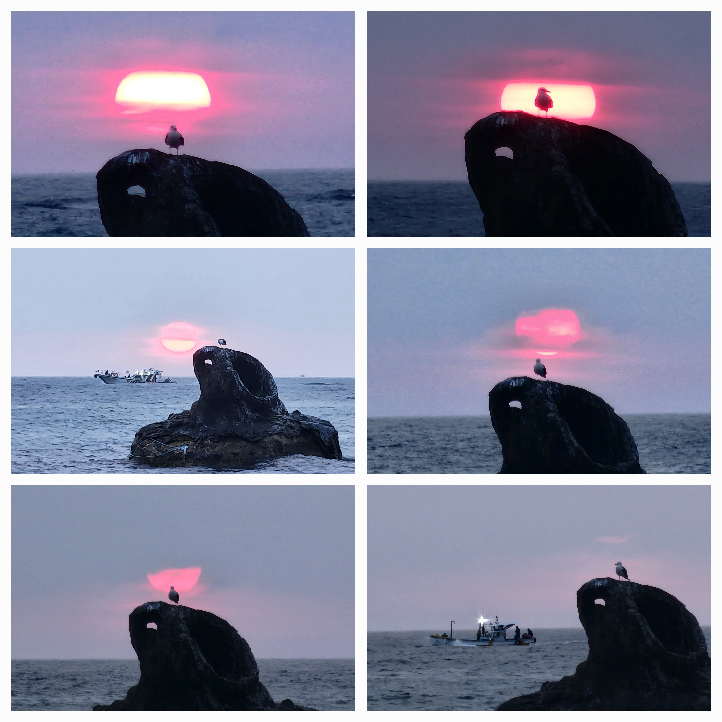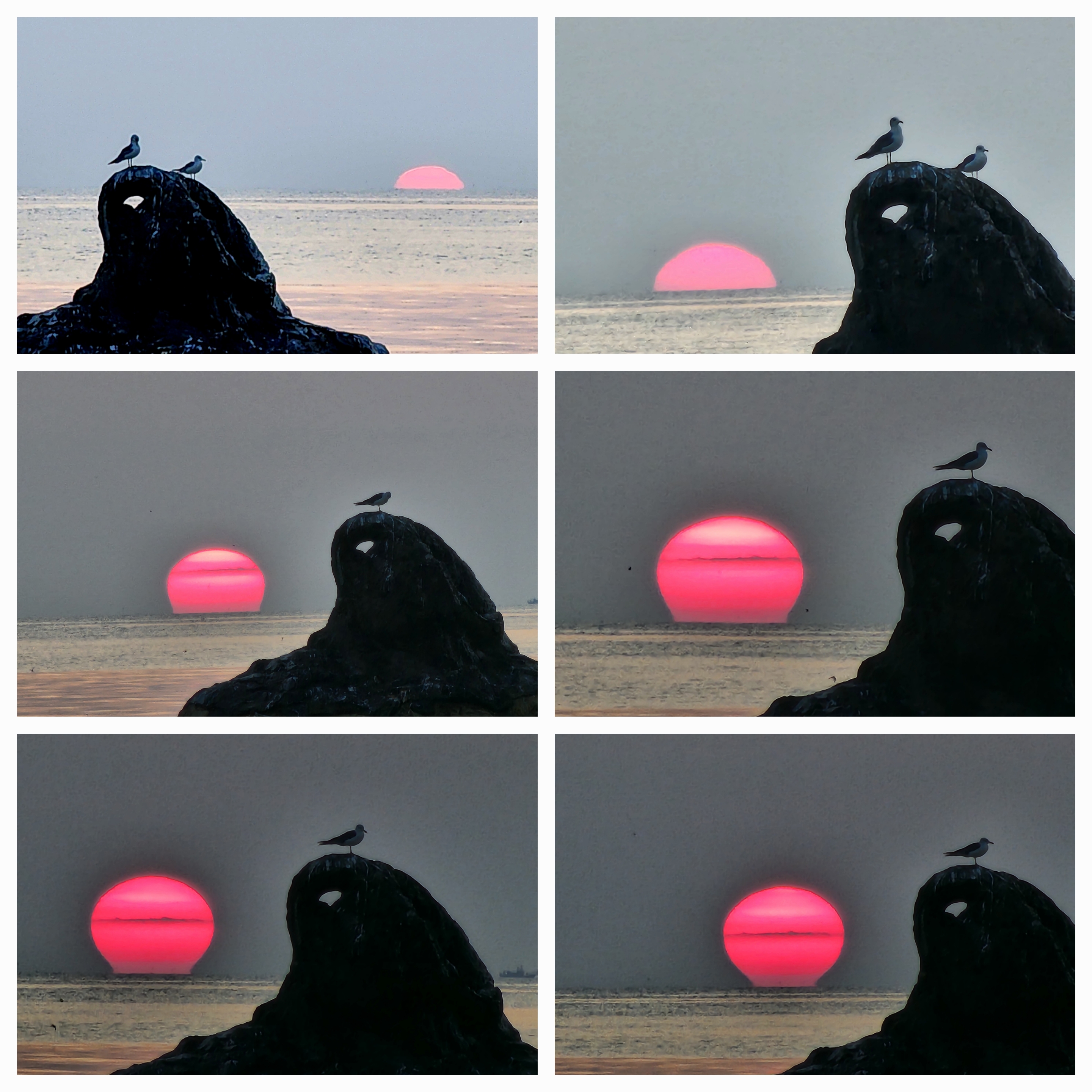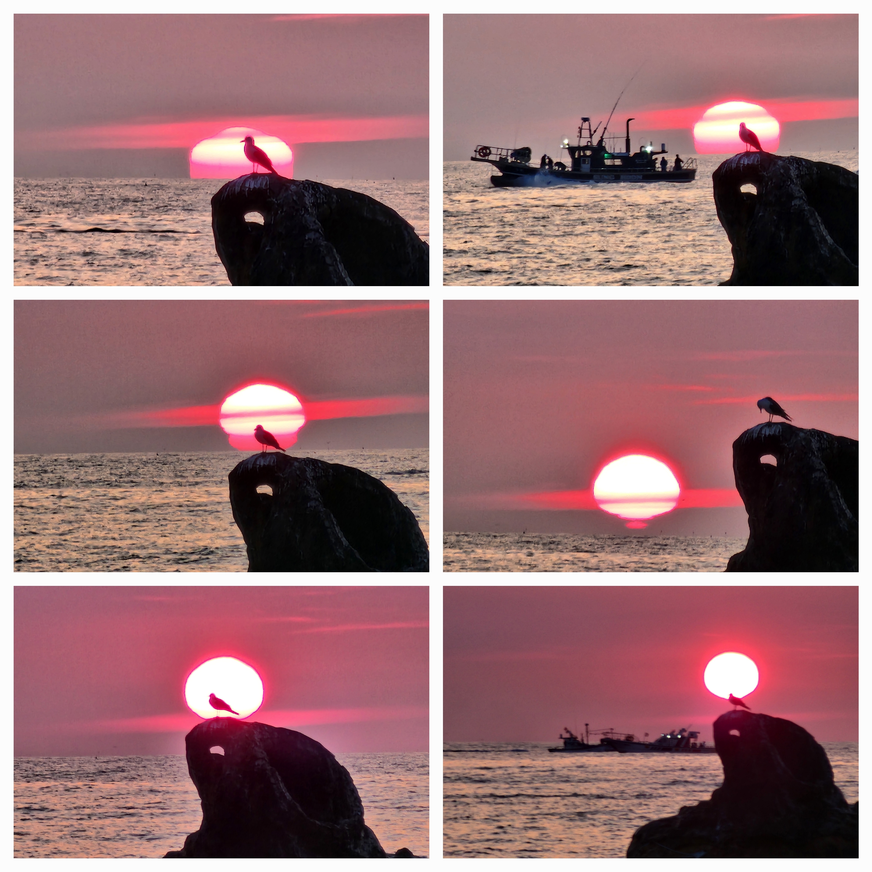 오메가현상을 동반한 수평선 일출이다... 해는 외계인(?)닮고.. 갈매기가 잠시 모델을 자청한다.