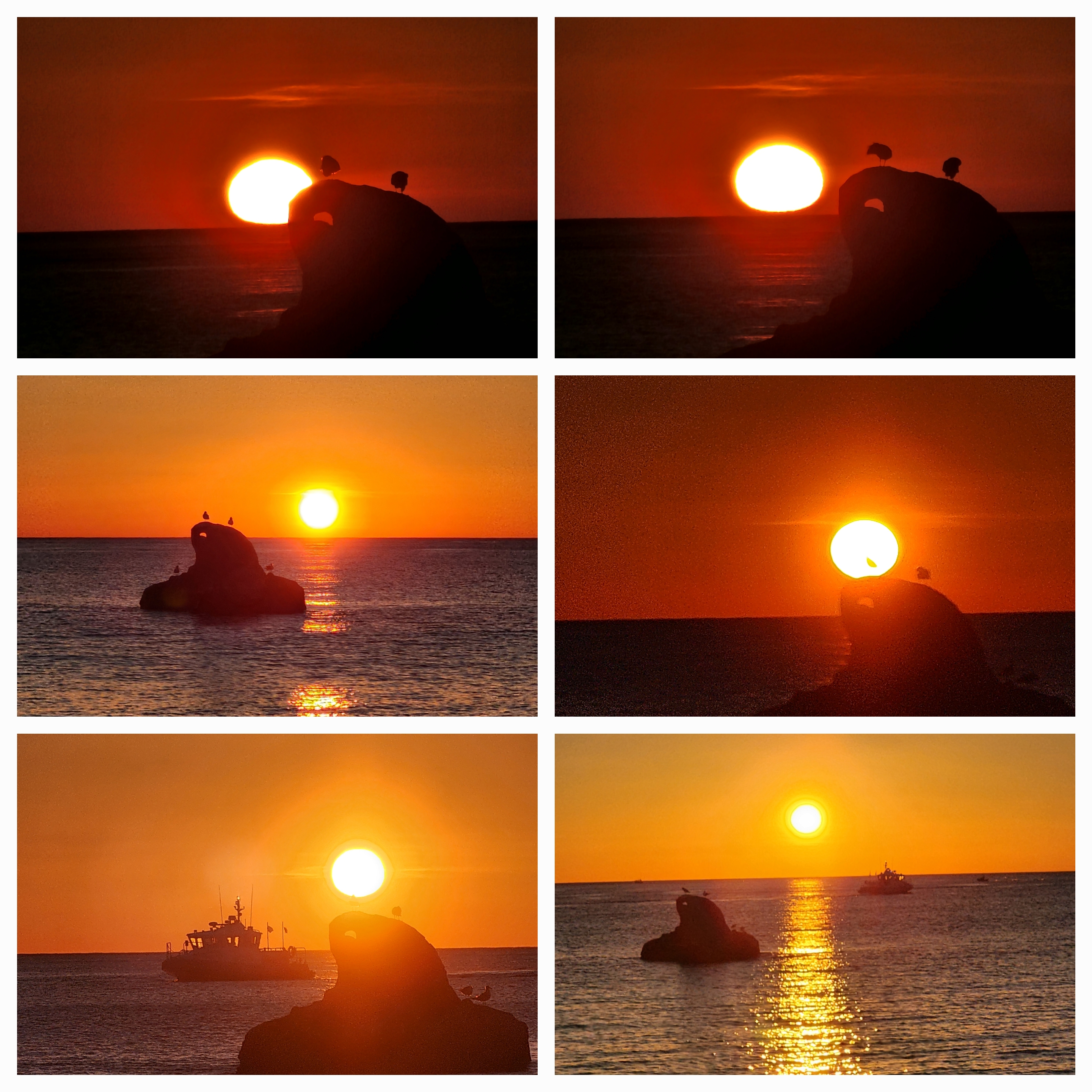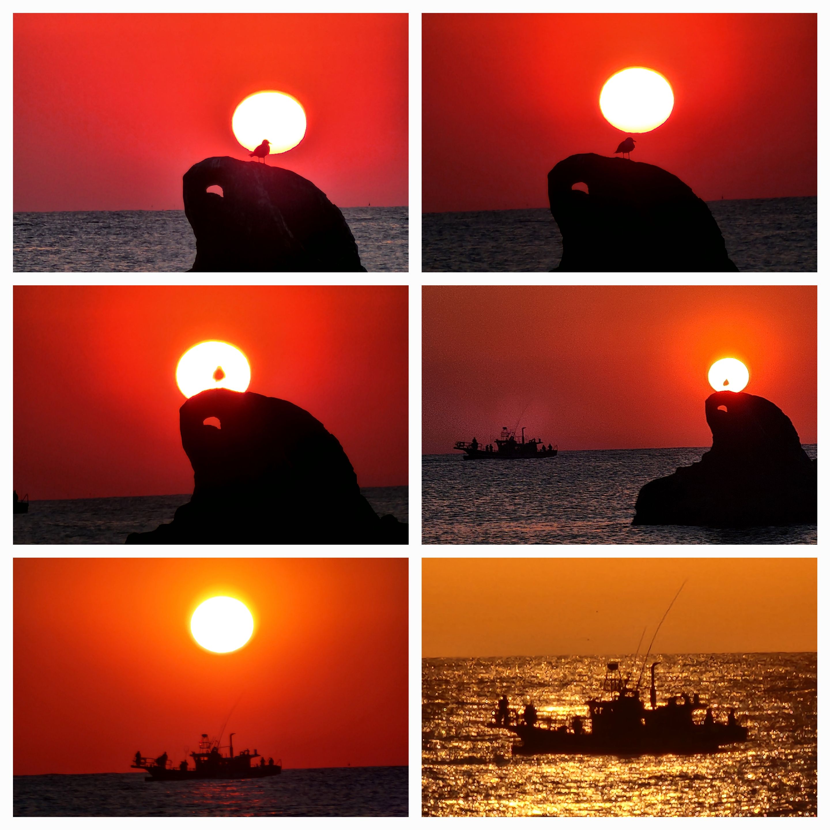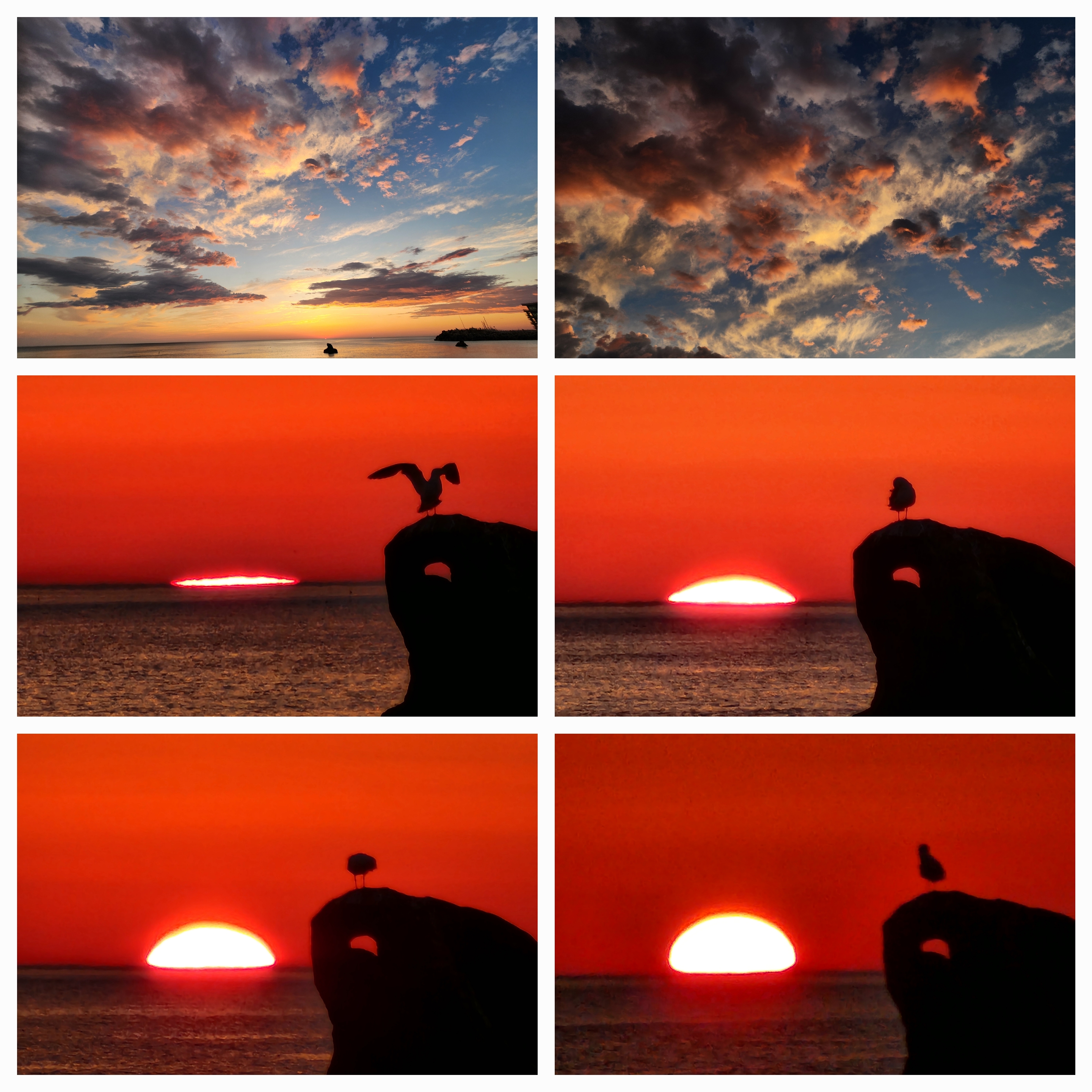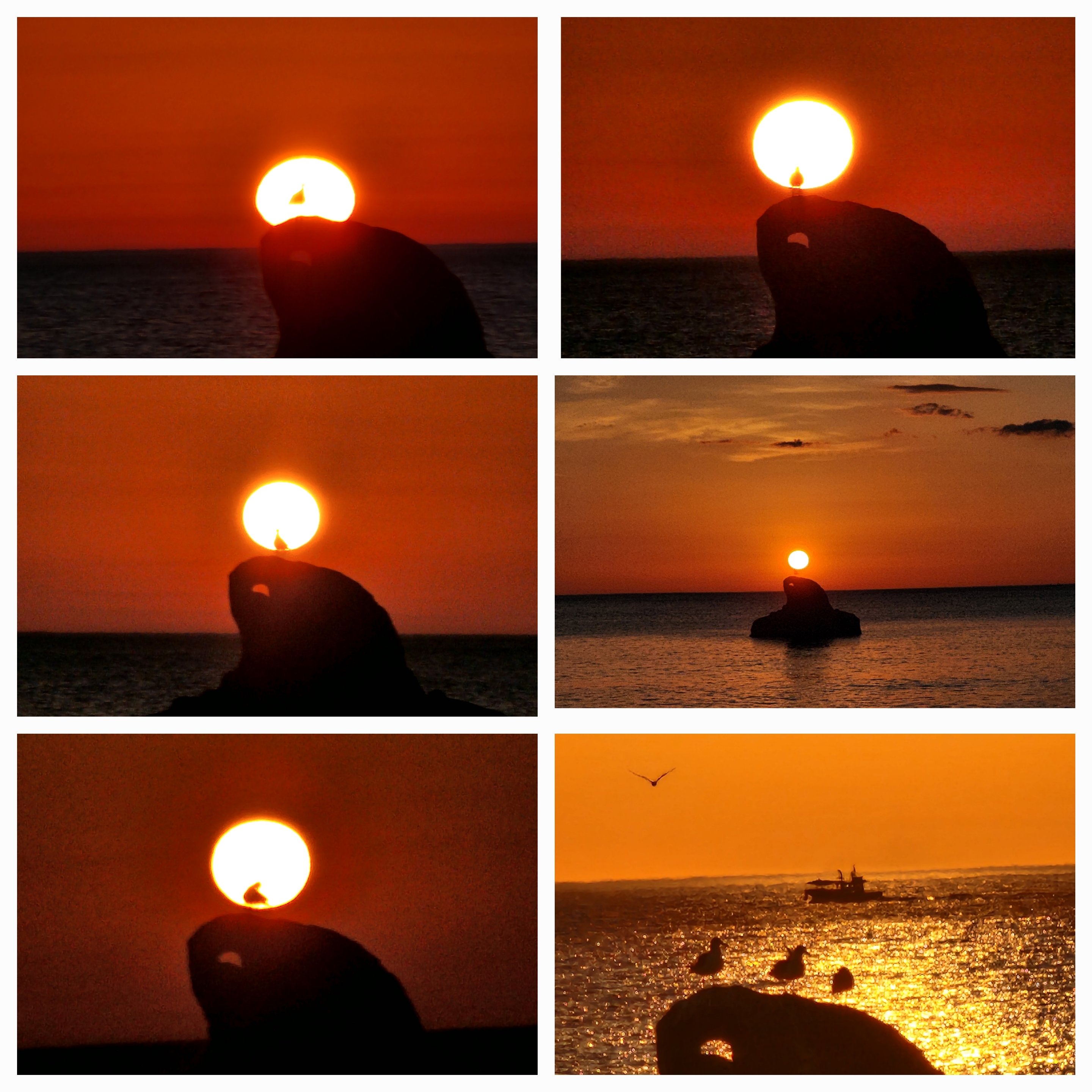 오메가현상을 동반한 수평선 일출이다... 해는 외계인(?)닮고.. 갈매기가 잠시 모델을 자청한다.