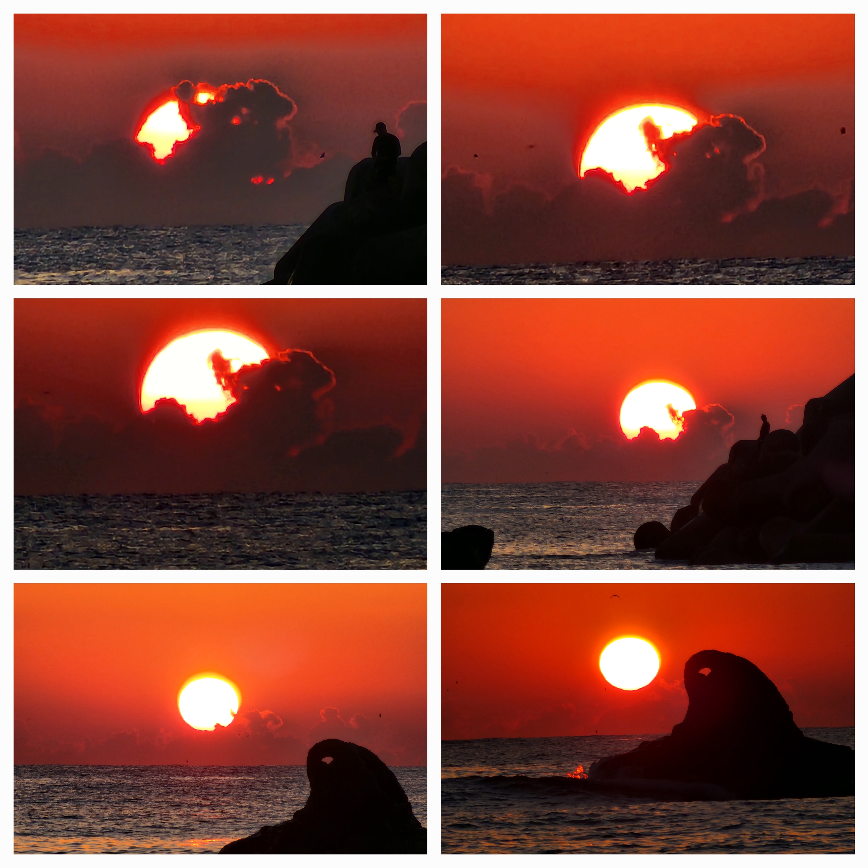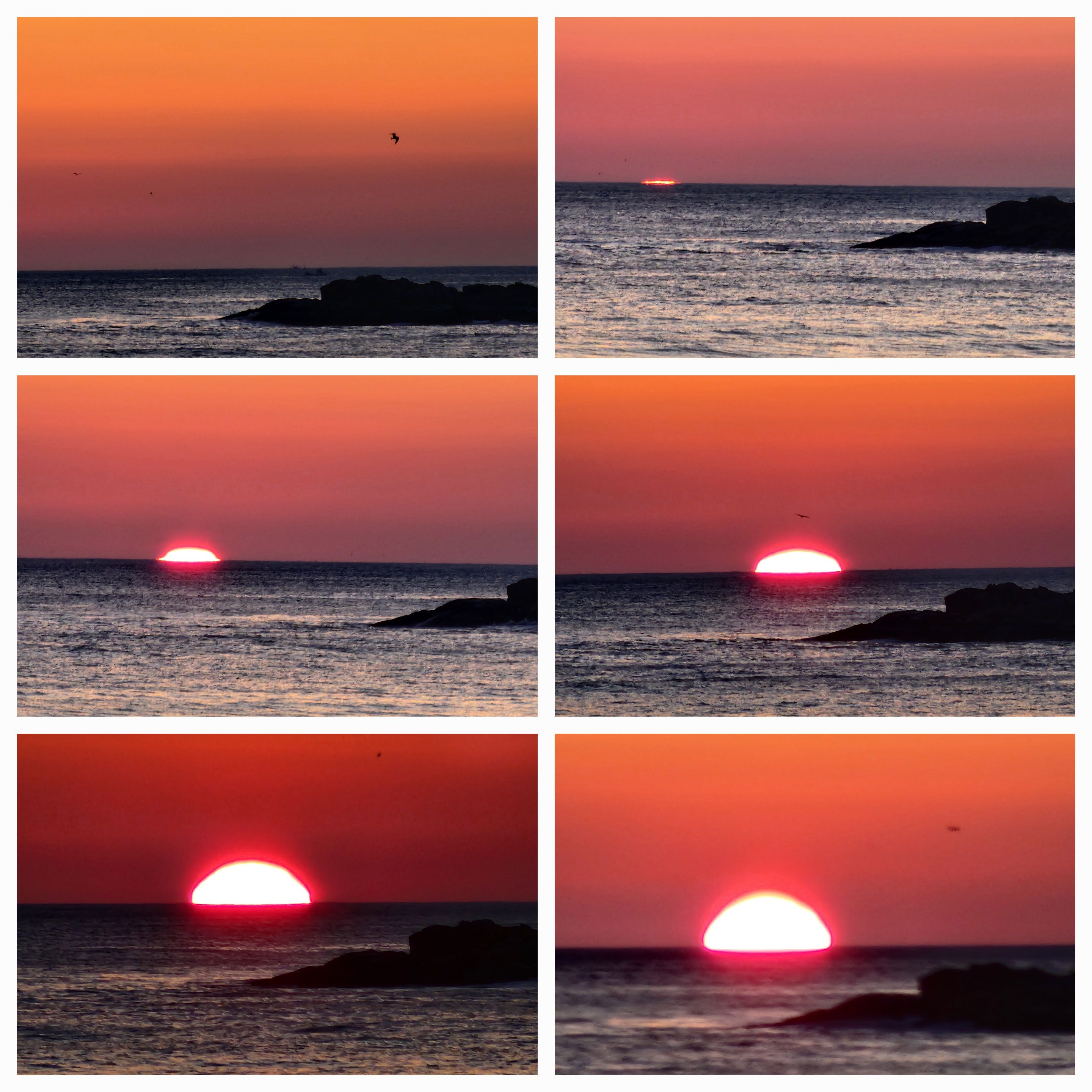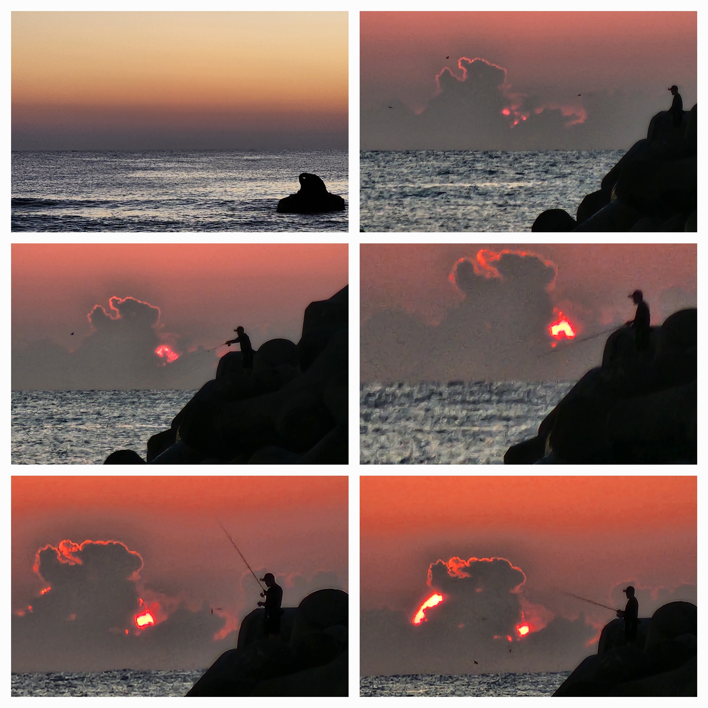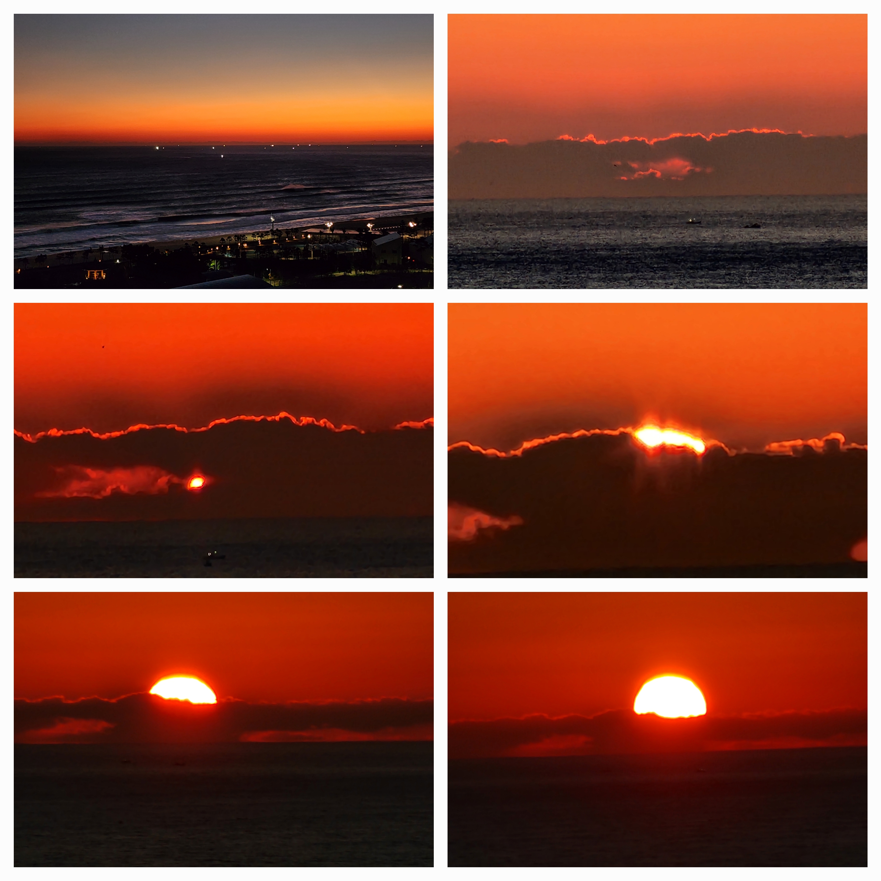 구름이 온 하늘을 덮고 있는데, 일출쇼를 펼치려 수평선위에 공간을 확보했지만 폭이 너무좁아 해의 얼굴도 다 못보이고 구름에 잠긴다. 그래도 수평선 일출이라 반갑다.