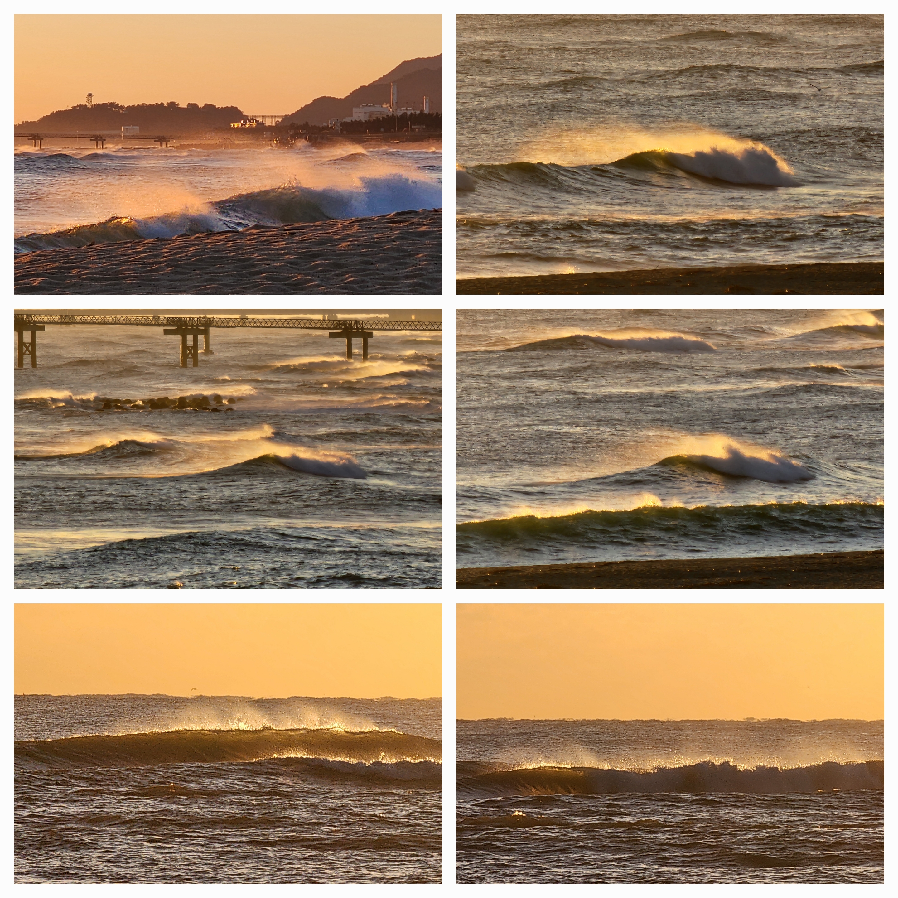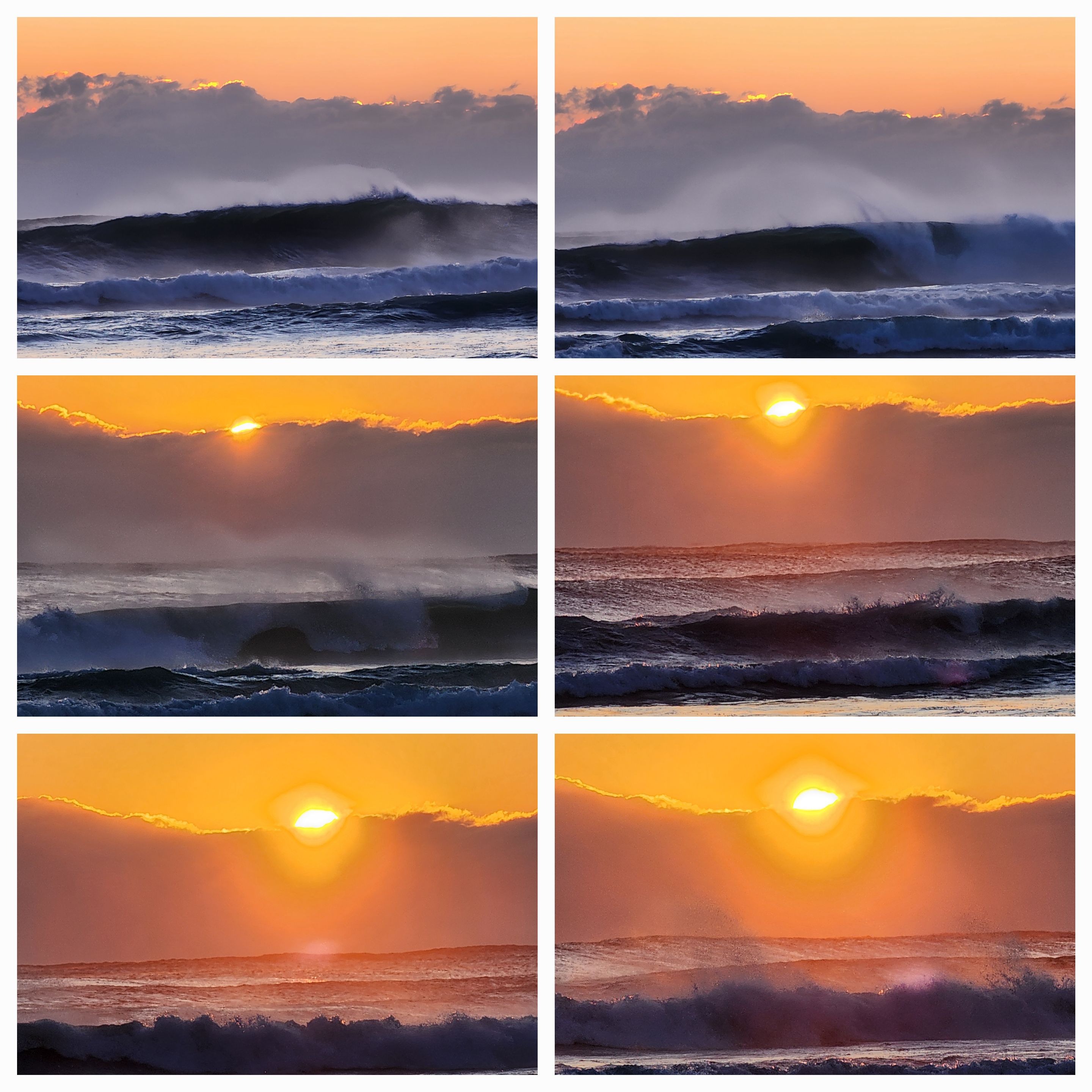 늘 일출쇼의 주연은 강릉해가 맡아왔으나 오늘은 구름과 파도가 주연 경쟁을 벌안다. 하늘 전체는 맑았으나 수평선에만 오밀조밀 짜임새있게 끼어있는 구름, 파도의 흣날리는 물보라가 햇빛을 받아 동물이 질주하는 듯한 색다른 모습을 보인다.