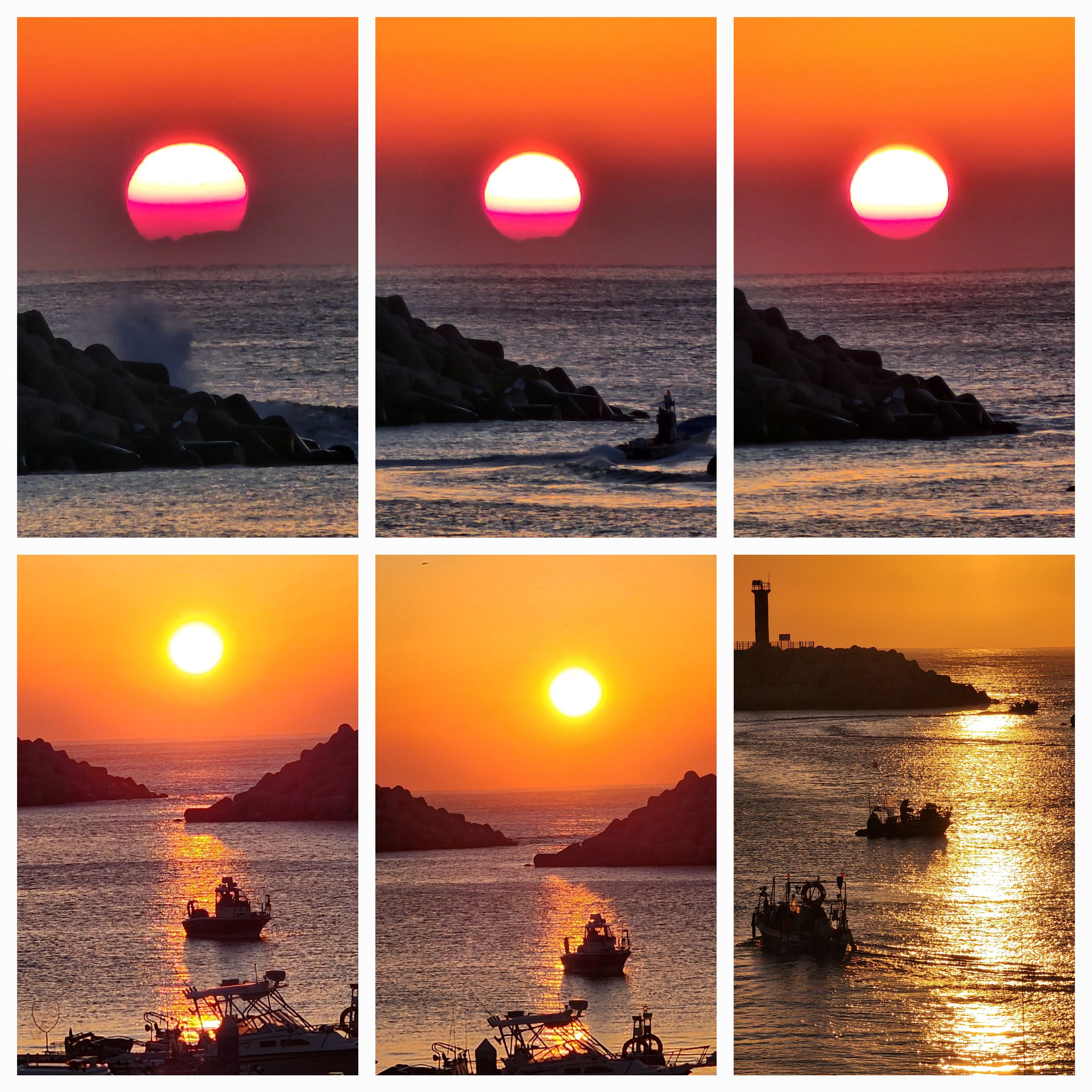 요즘은 구름때문에 수평선 일출을 보기 어렵다. 오늘은 그나마 수평선에 버티고 있는 구름 속에서 이지만 산뜻한 모습 보인다. 요며칠 파도가 세어 방파제 출입이 통제되고 있다.