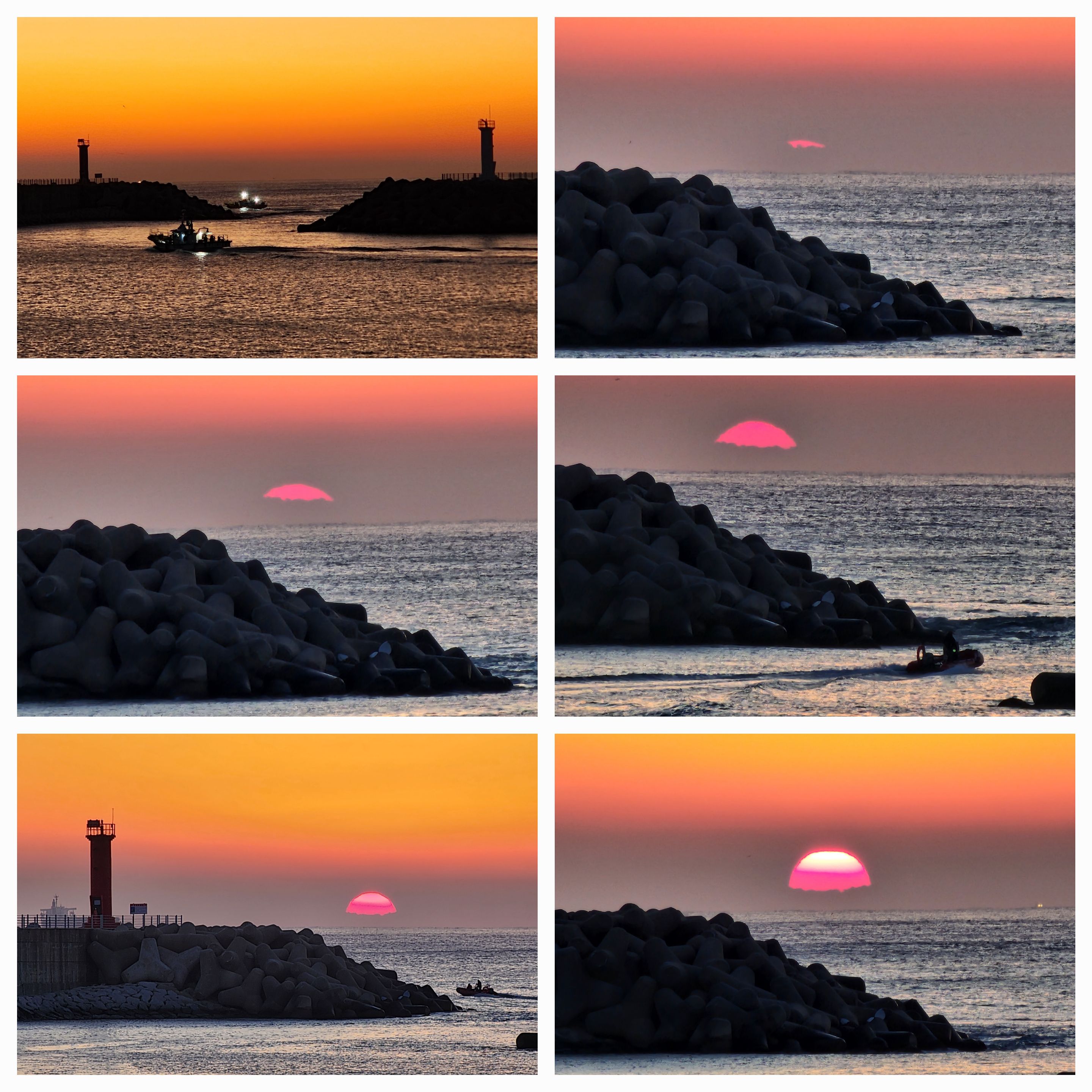 새해들어 두번째로 맞는, 오메가가 수반된 수평선 일출이다. 예보와는 달리 바람이 엄청불고, 방파제가 출입통제되니