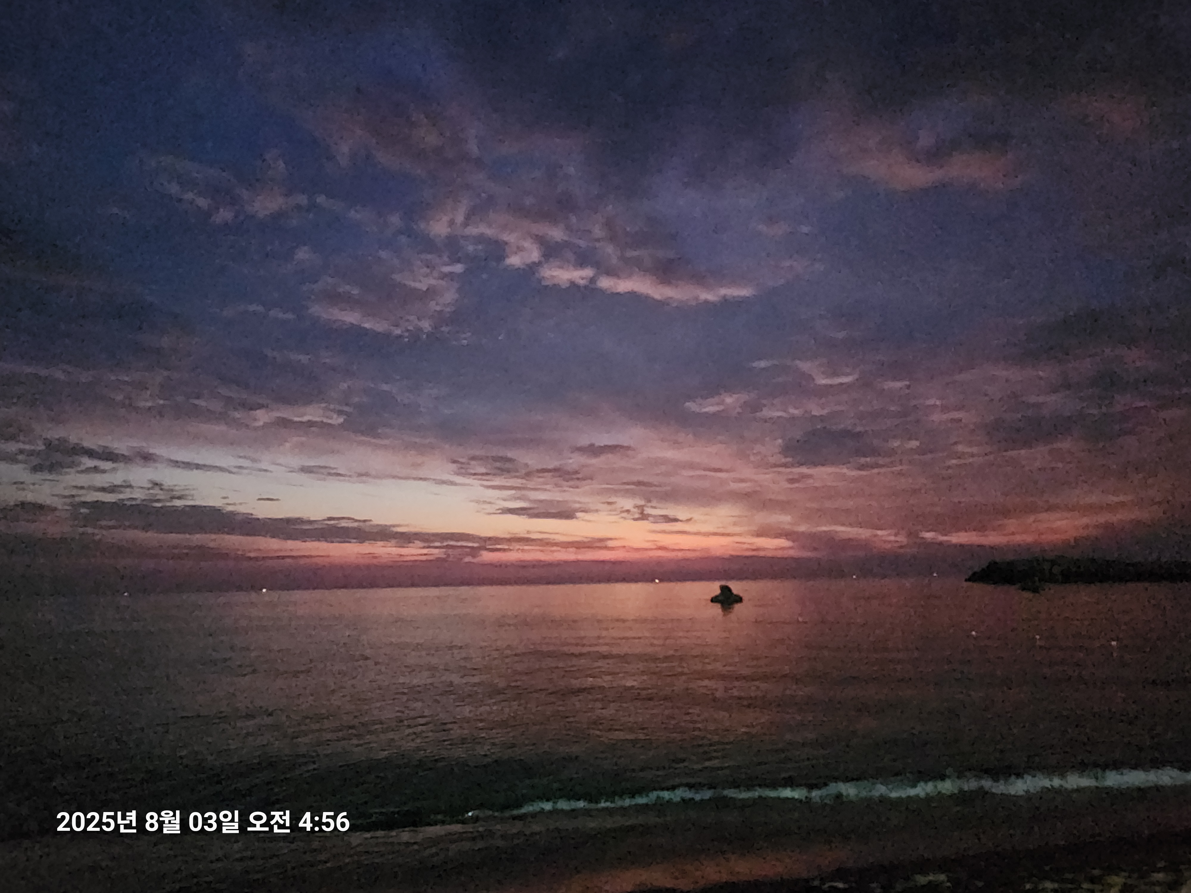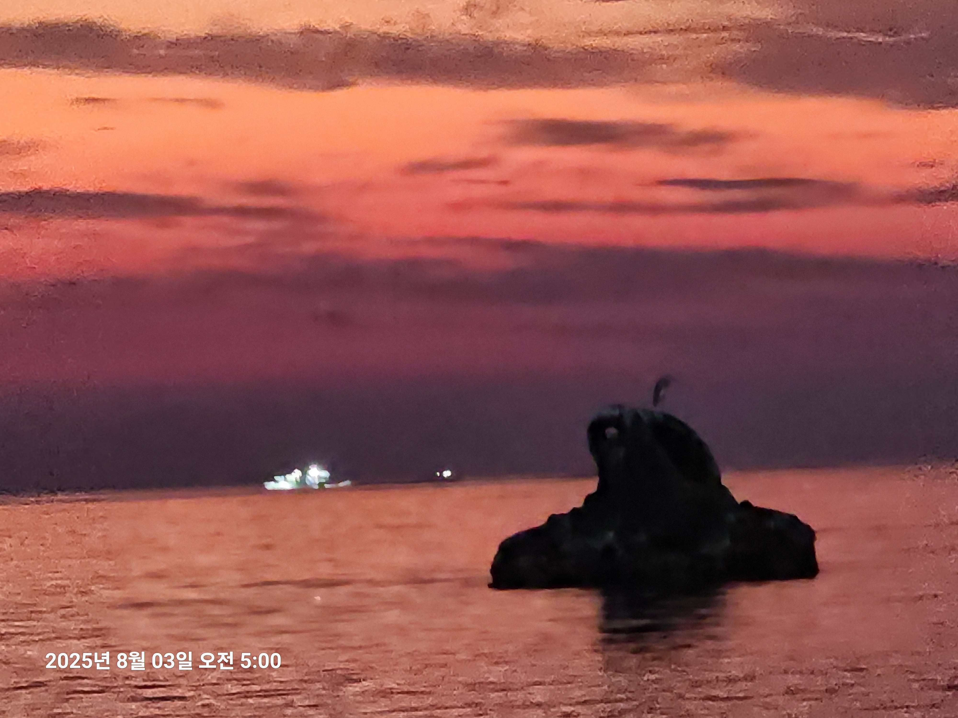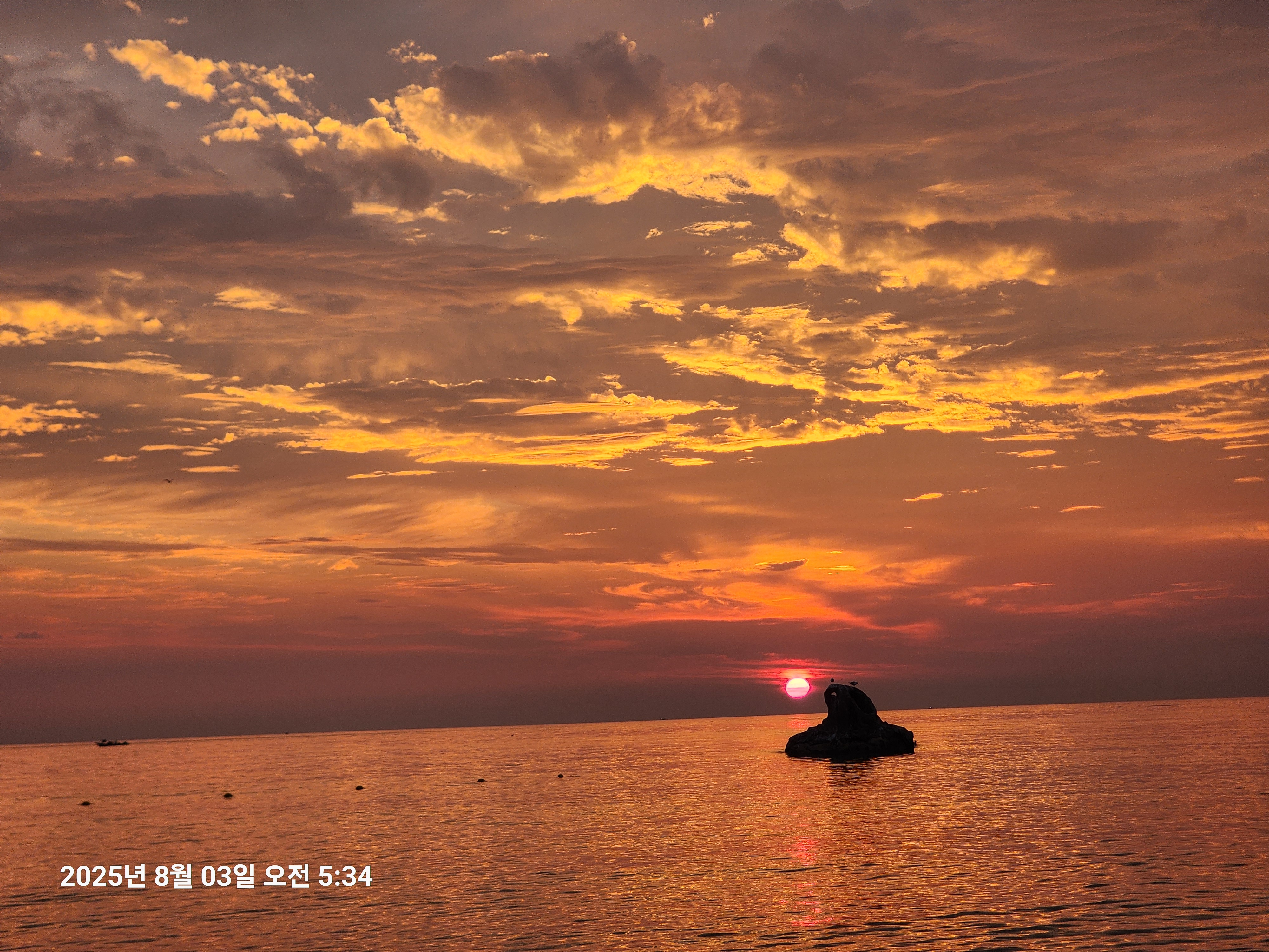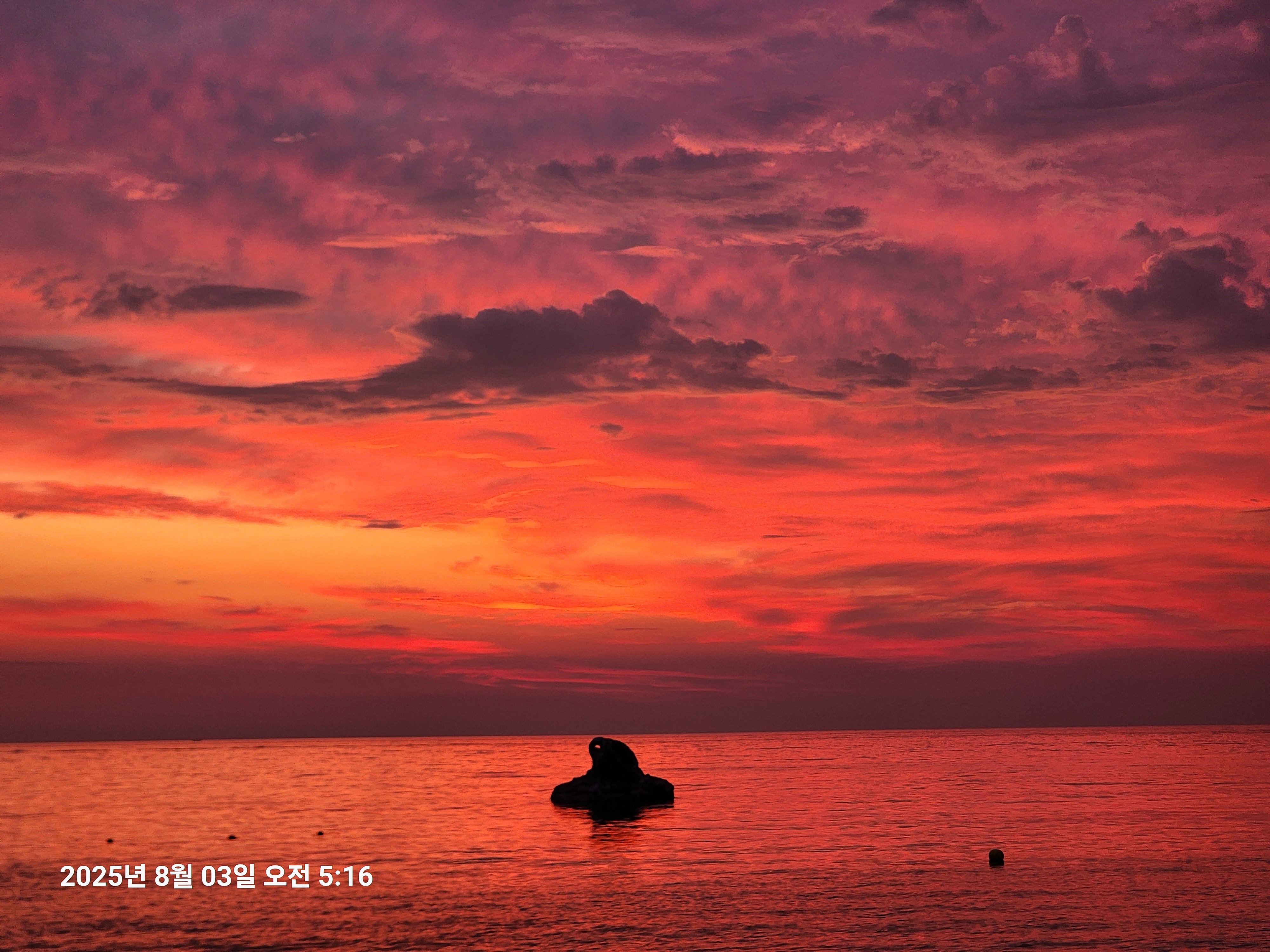 많이 끼어 수평선일출을 기대하지 않았는데도, 8월 첫주말, 피서객이 많이 온것을 감안해서인가 수평선에서 살며시 모습보이는 강릉해!