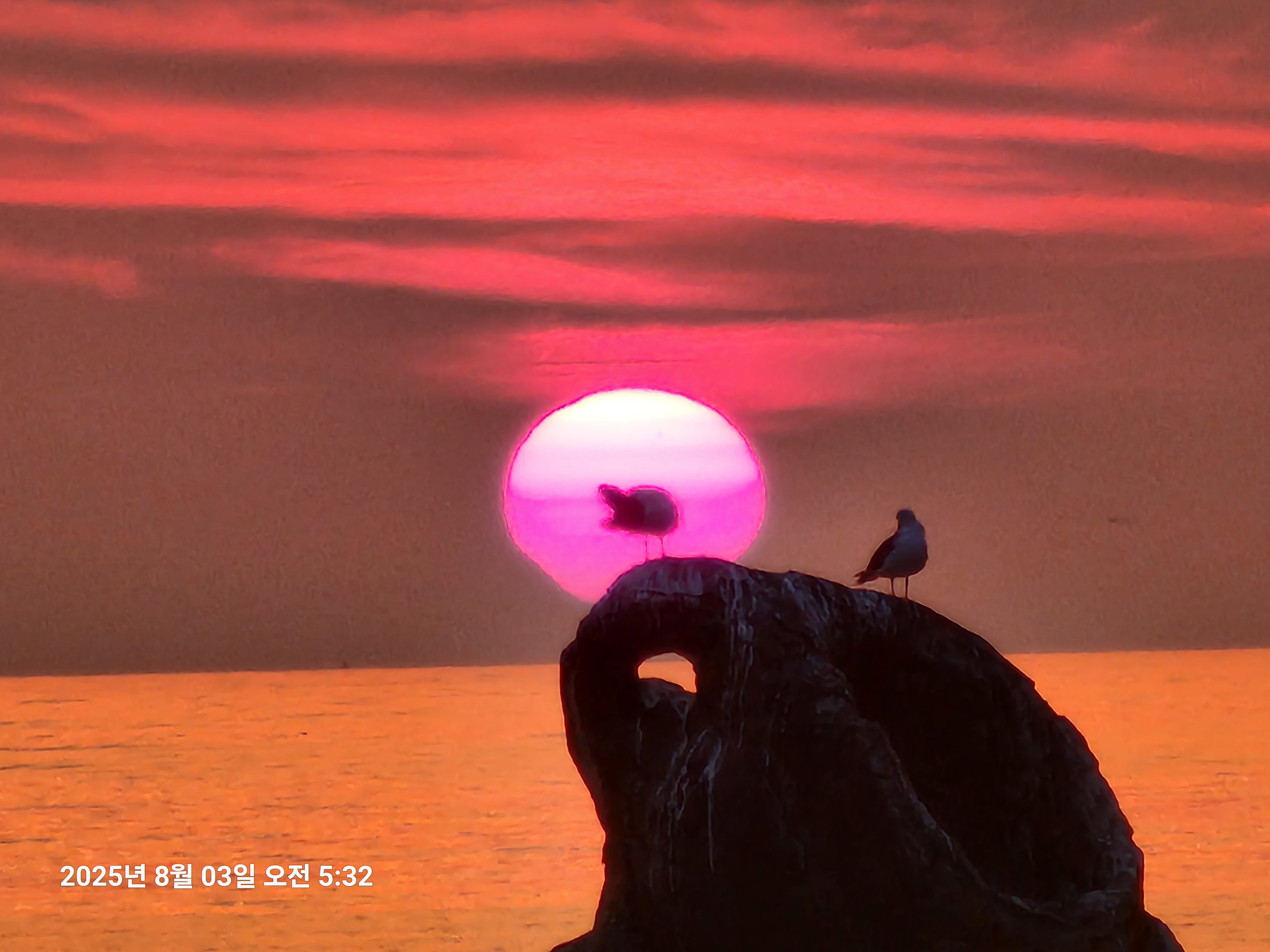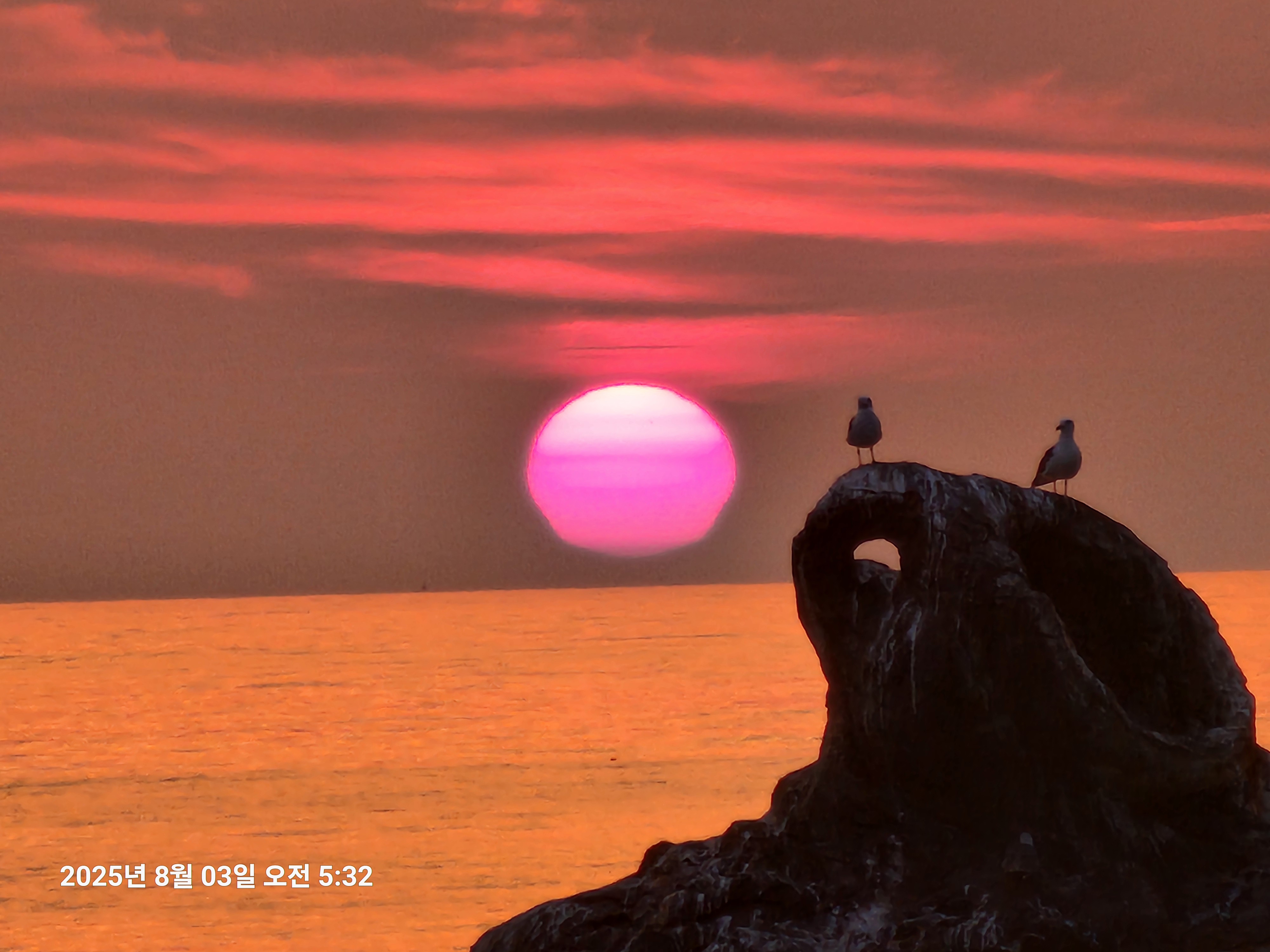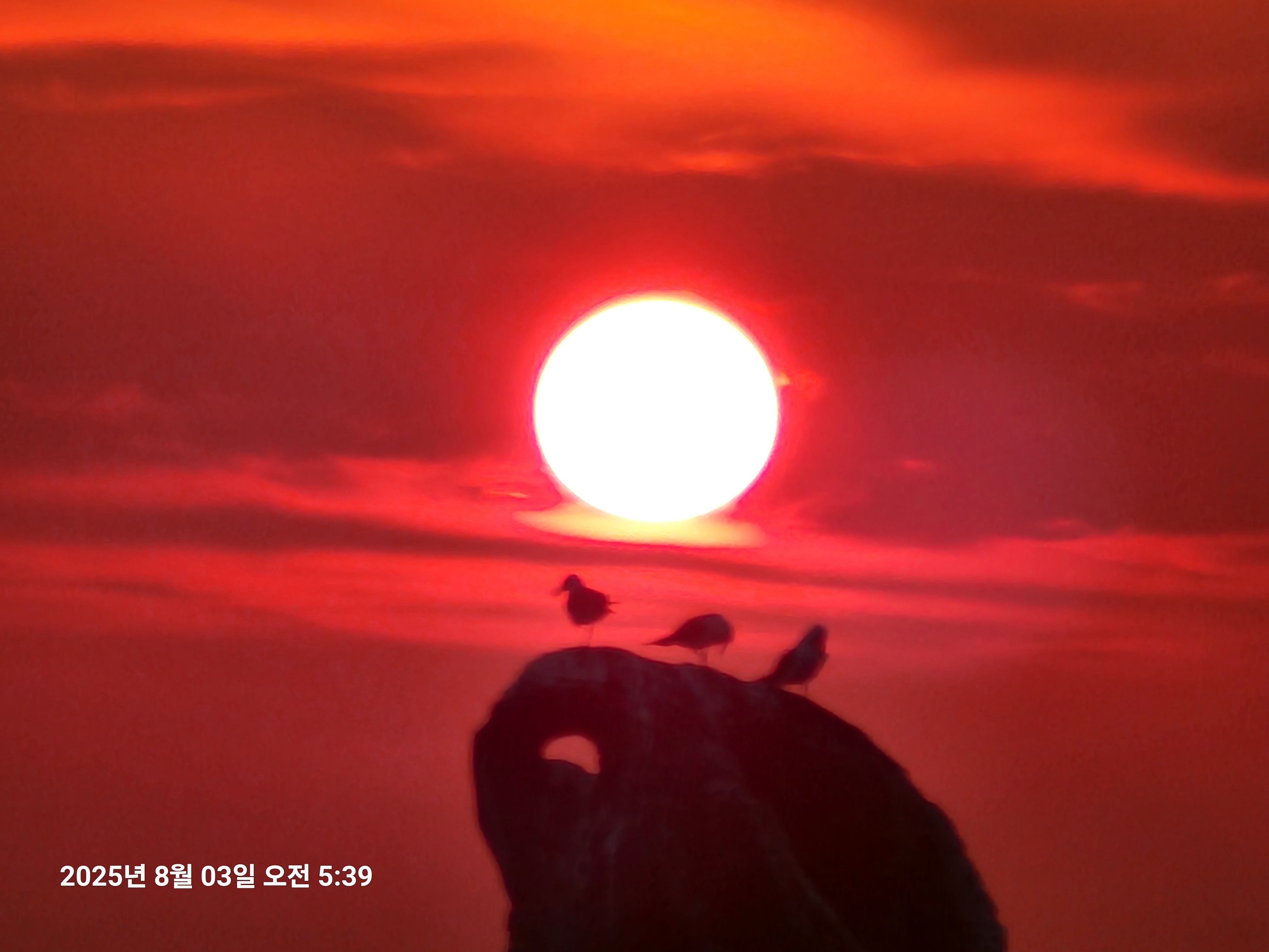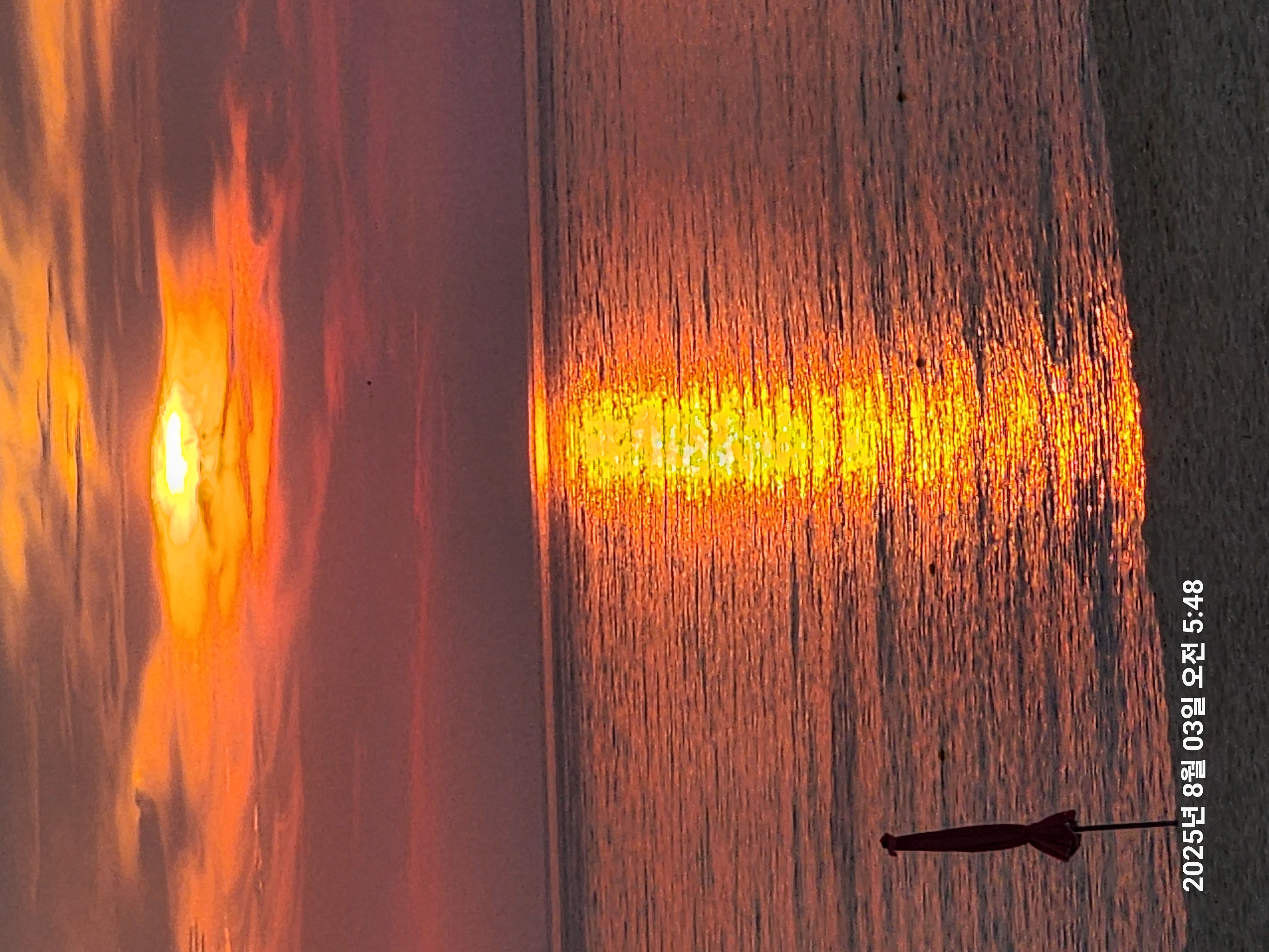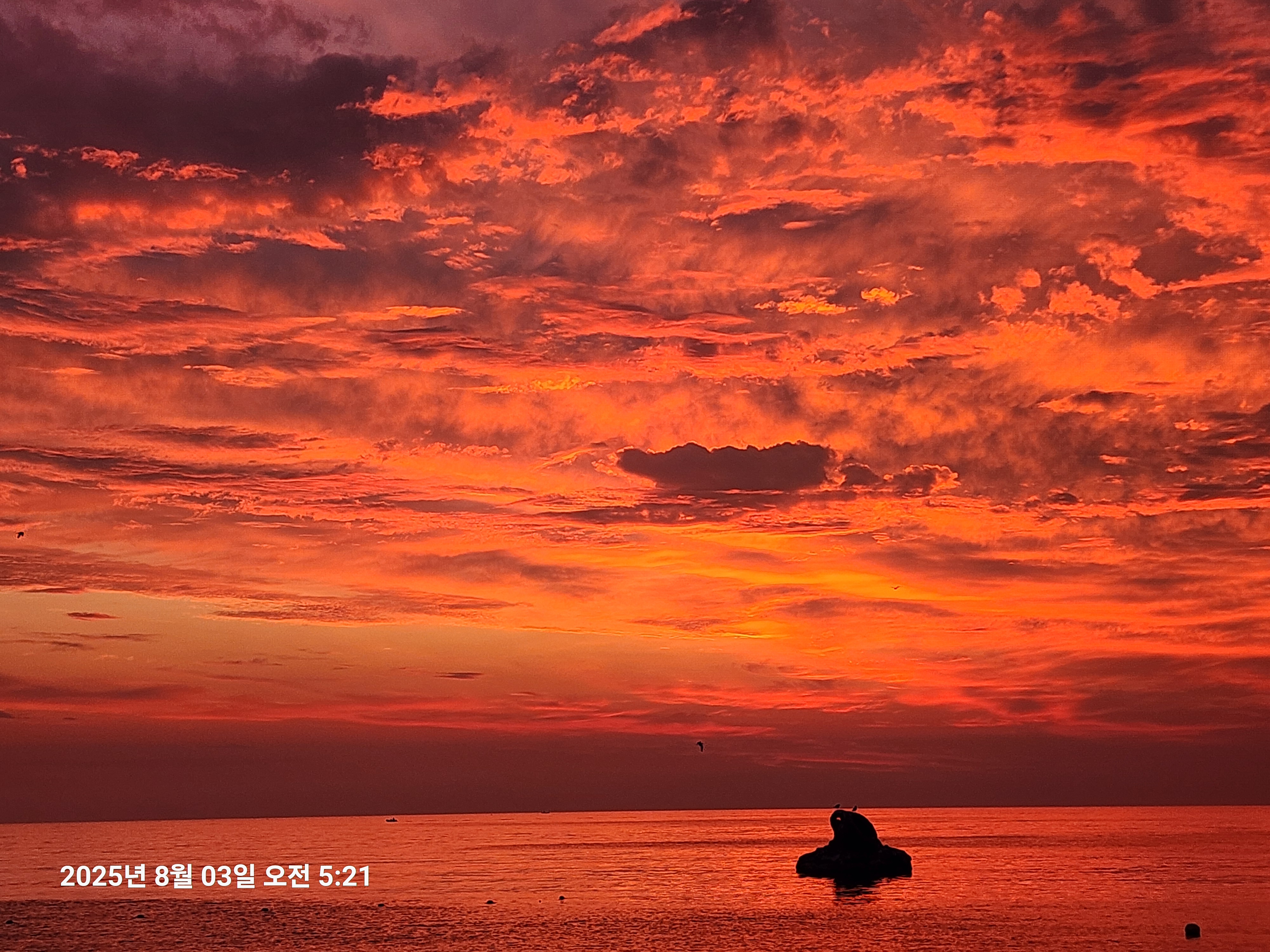 많이 끼어 수평선일출을 기대하지 않았는데도, 8월 첫주말, 피서객이 많이 온것을 감안해서인가 수평선에서 살며시 모습보이는 강릉해!
