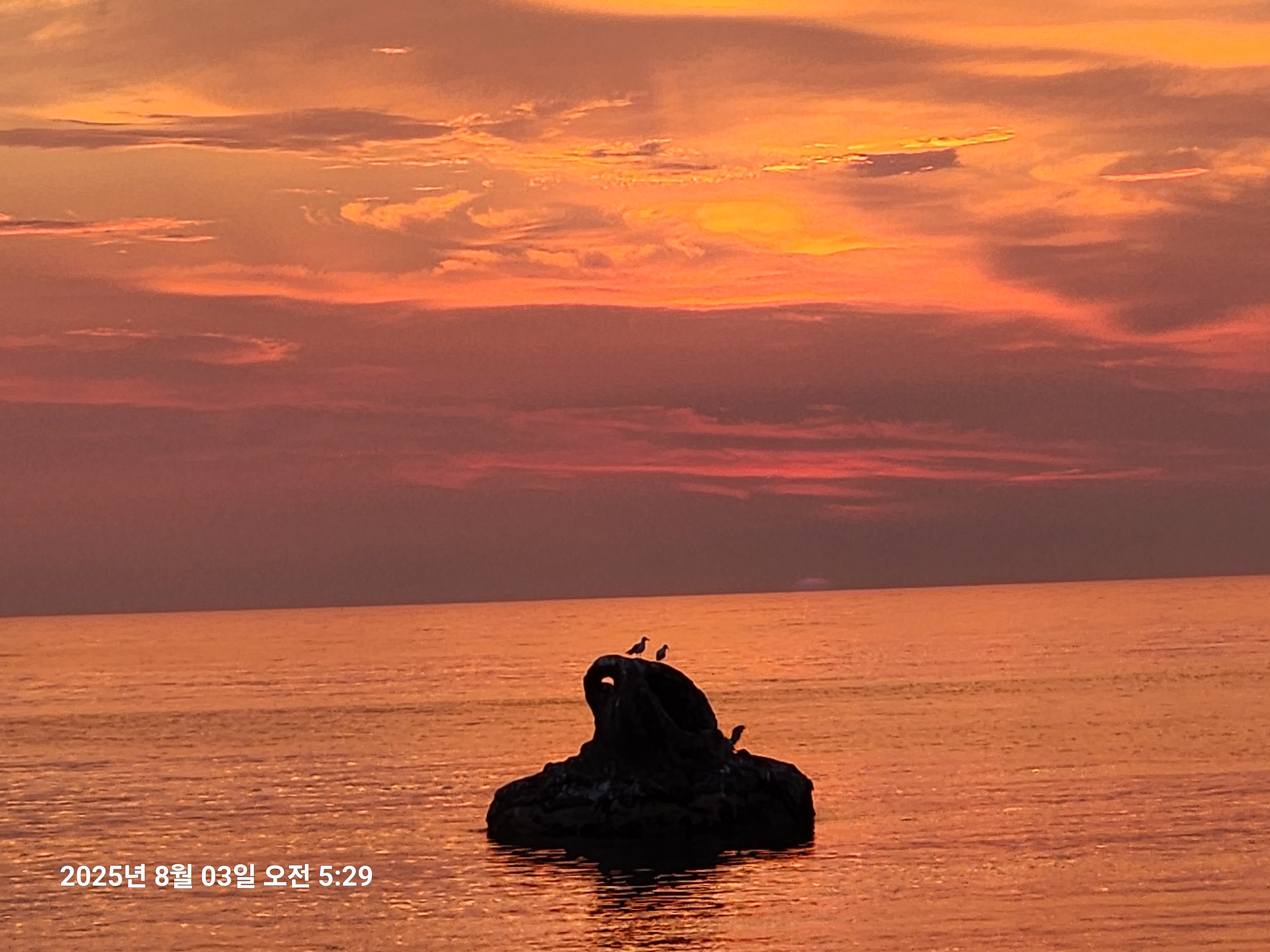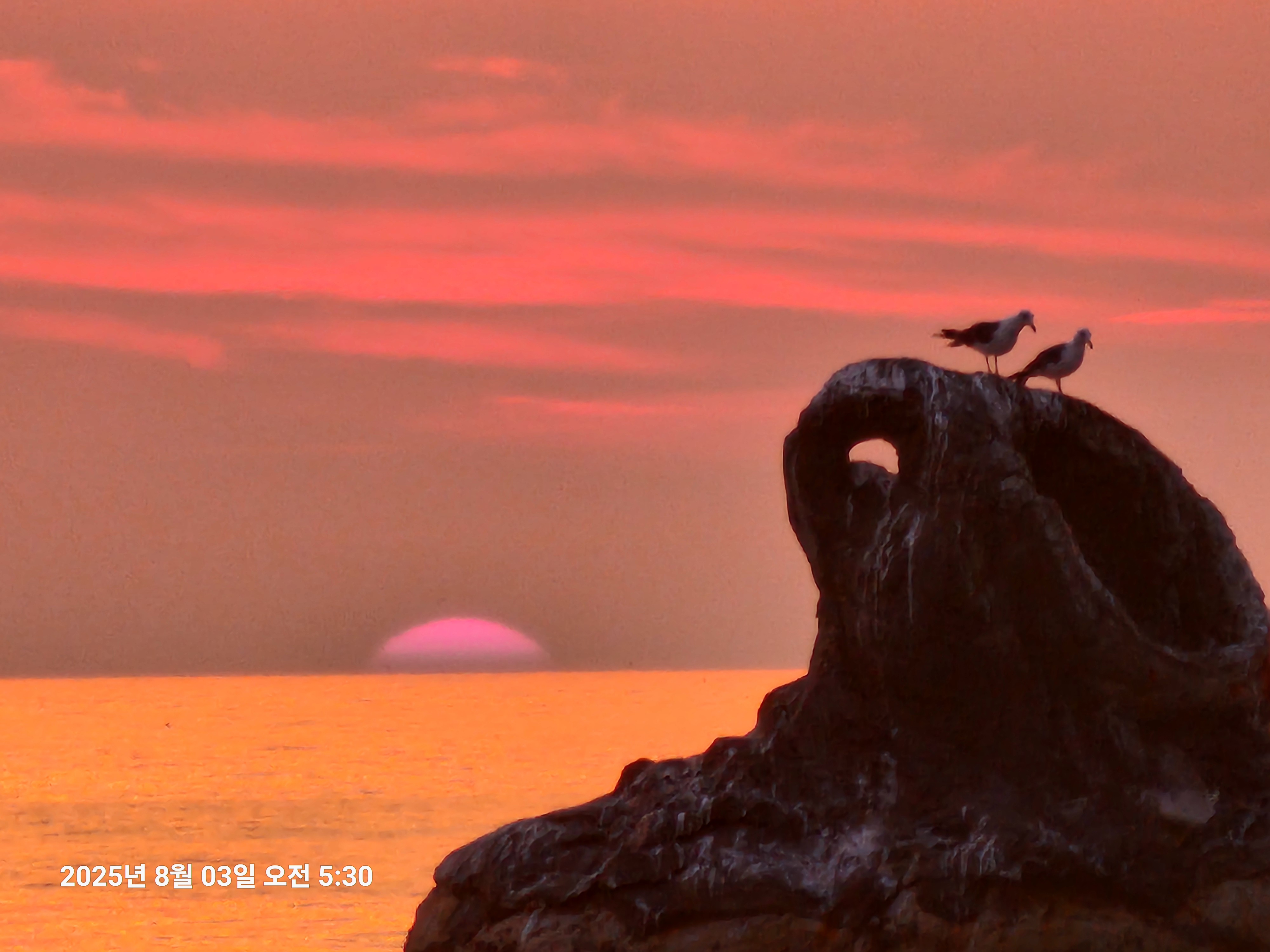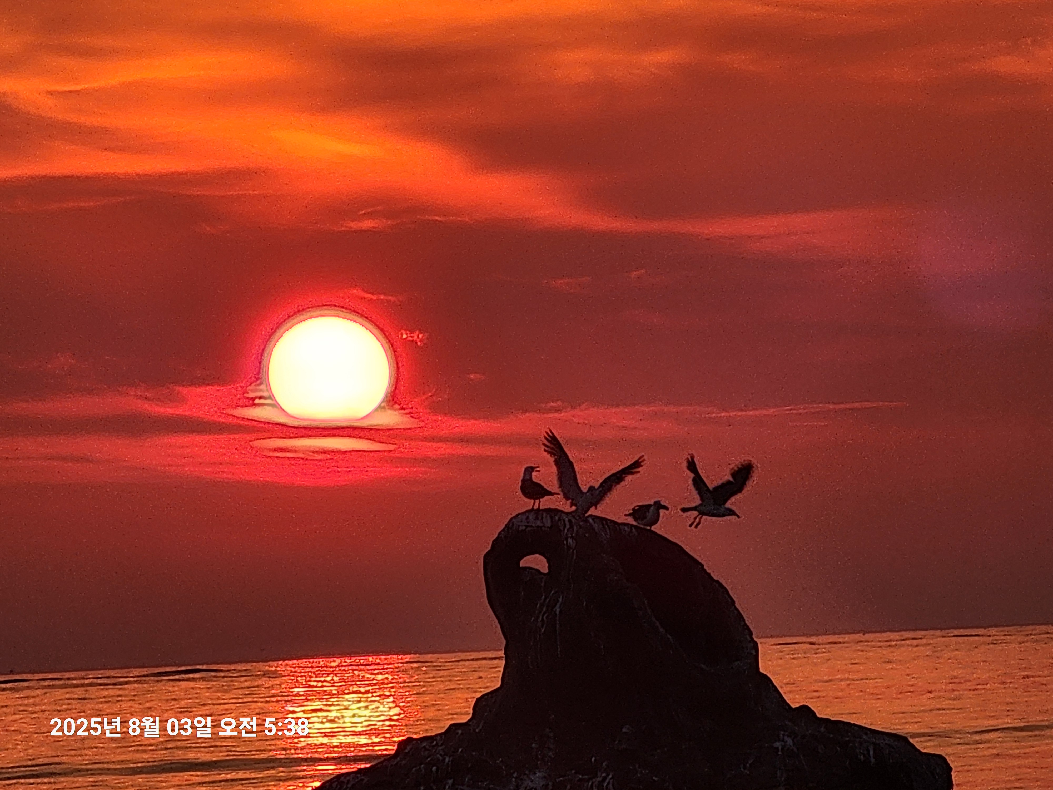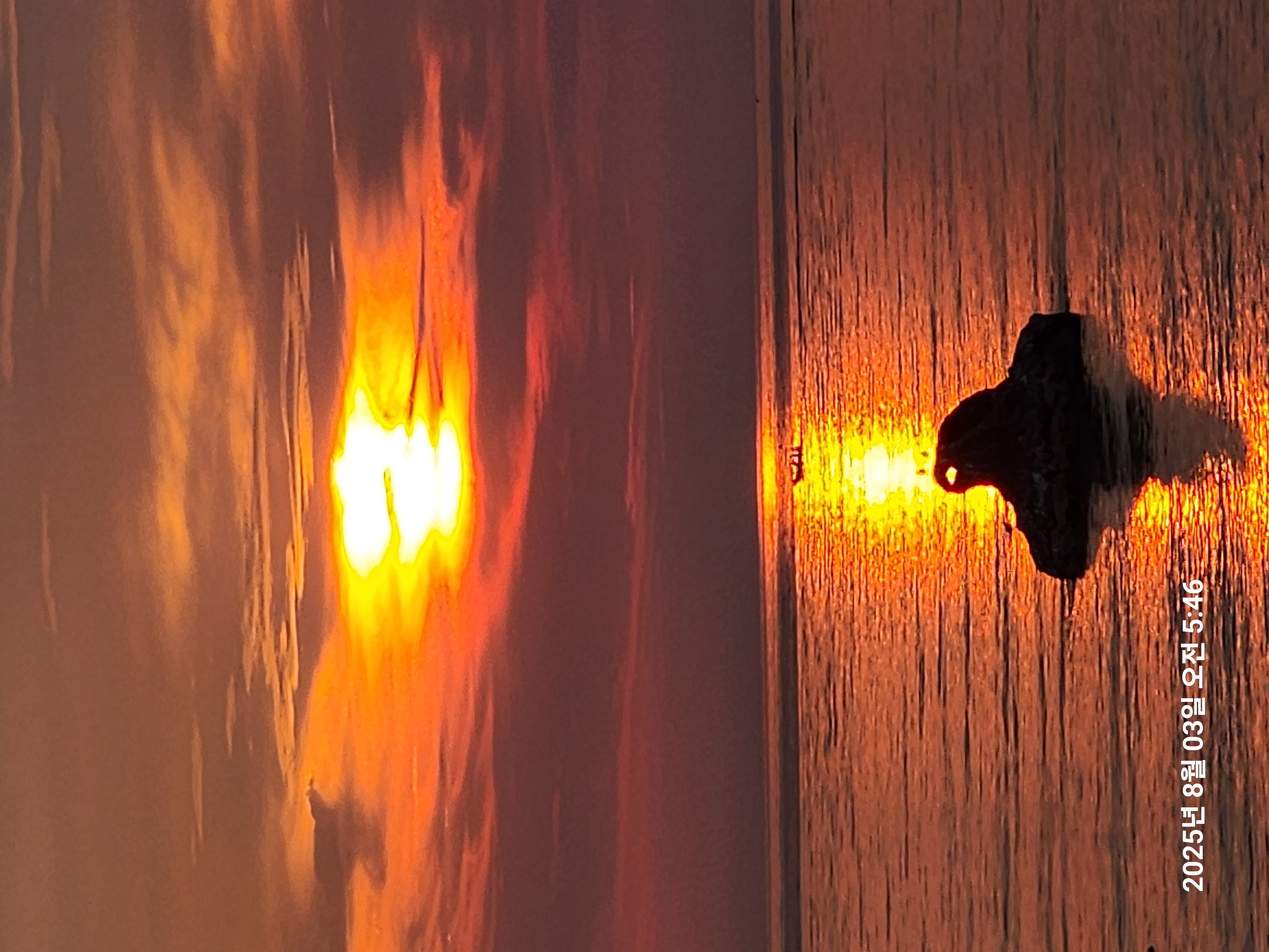 많이 끼어 수평선일출을 기대하지 않았는데도, 8월 첫주말, 피서객이 많이 온것을 감안해서인가 수평선에서 살며시 모습보이는 강릉해!