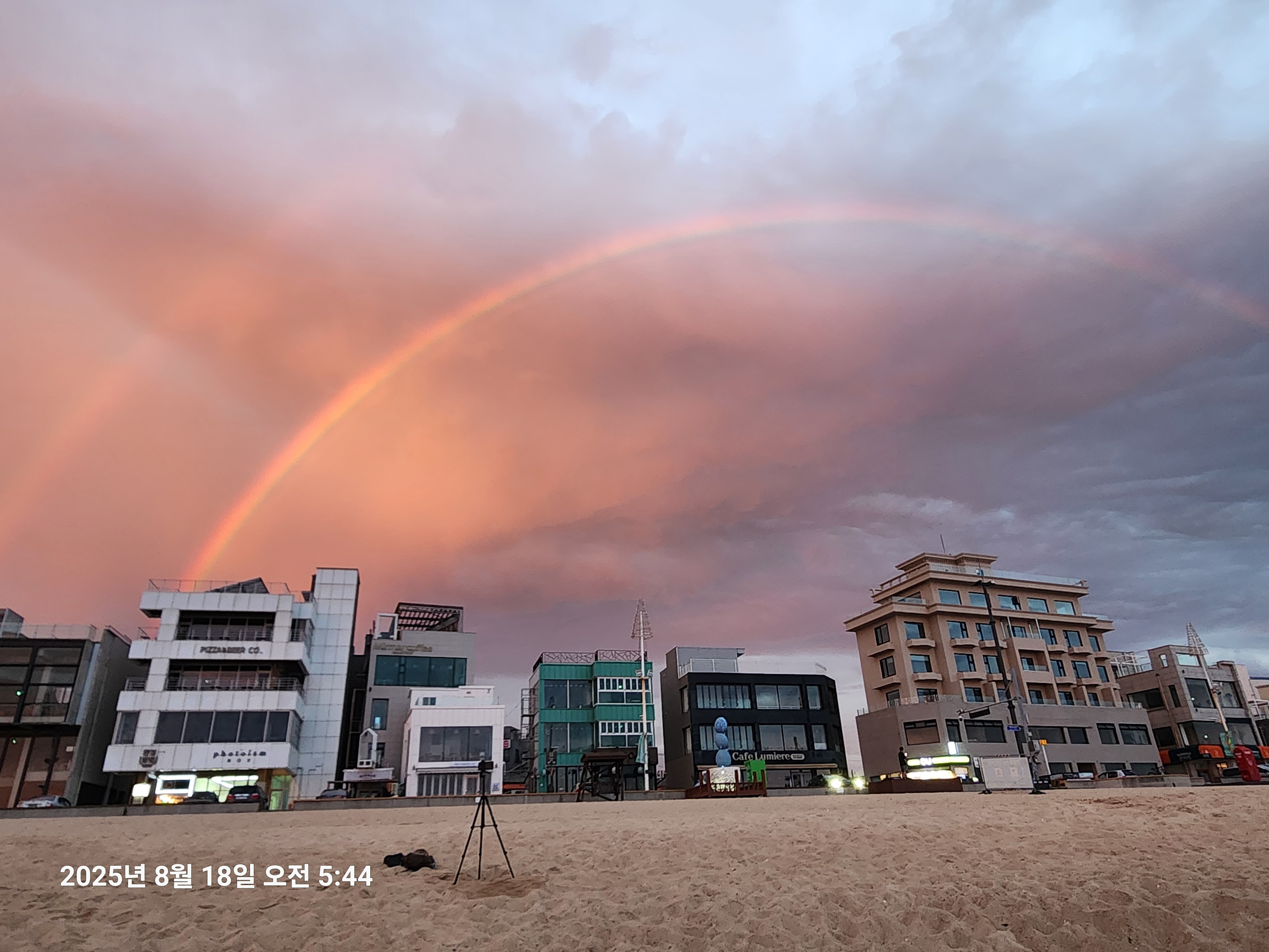 그 와중에 서쪽하늘에 선명치는 않으나 무지개도 일출보러 나왔다.