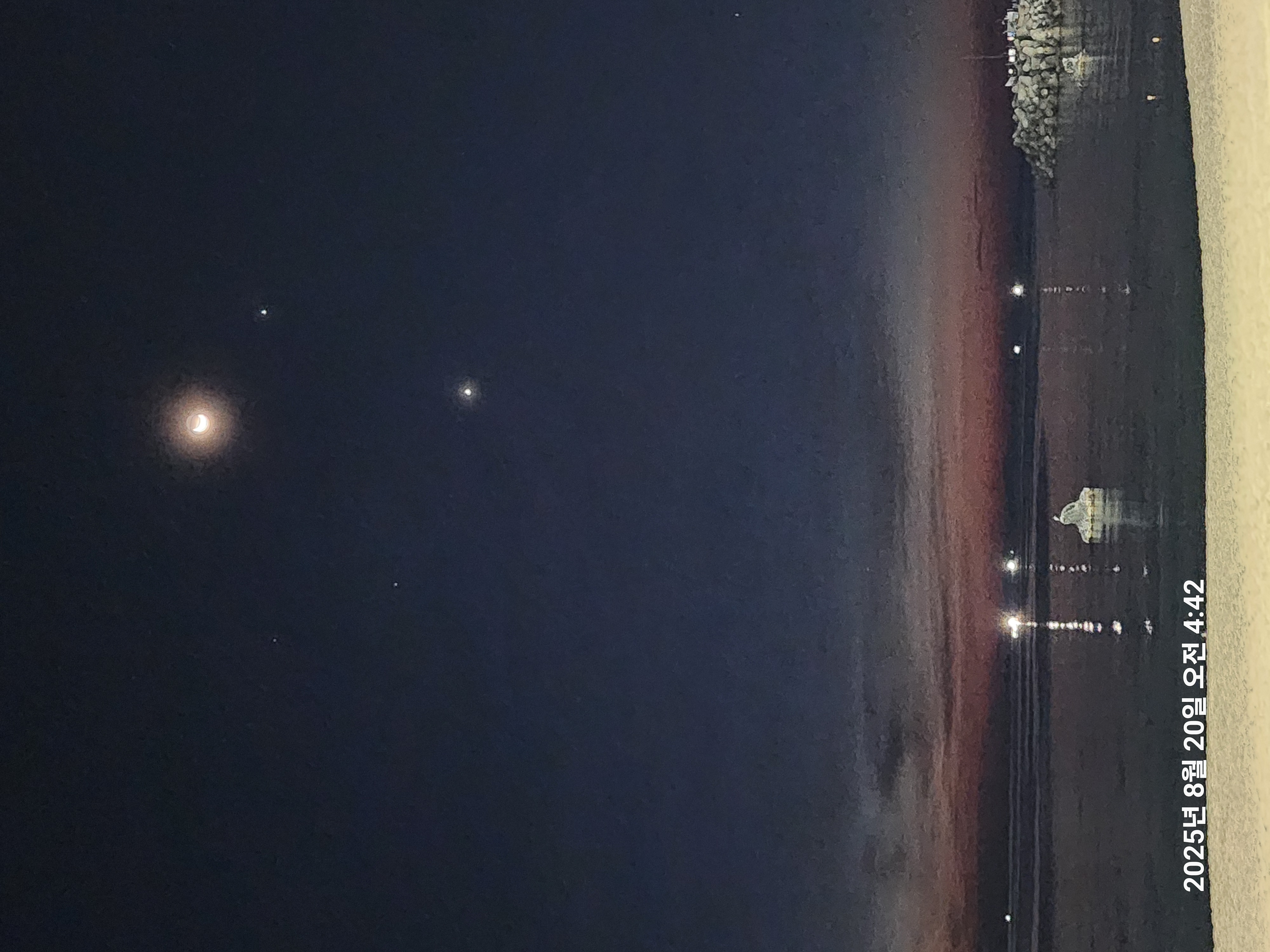 새벽 하늘에 구름도없고 빛나는 달과 별이 멋진일출을 알려주는 듯하다.
