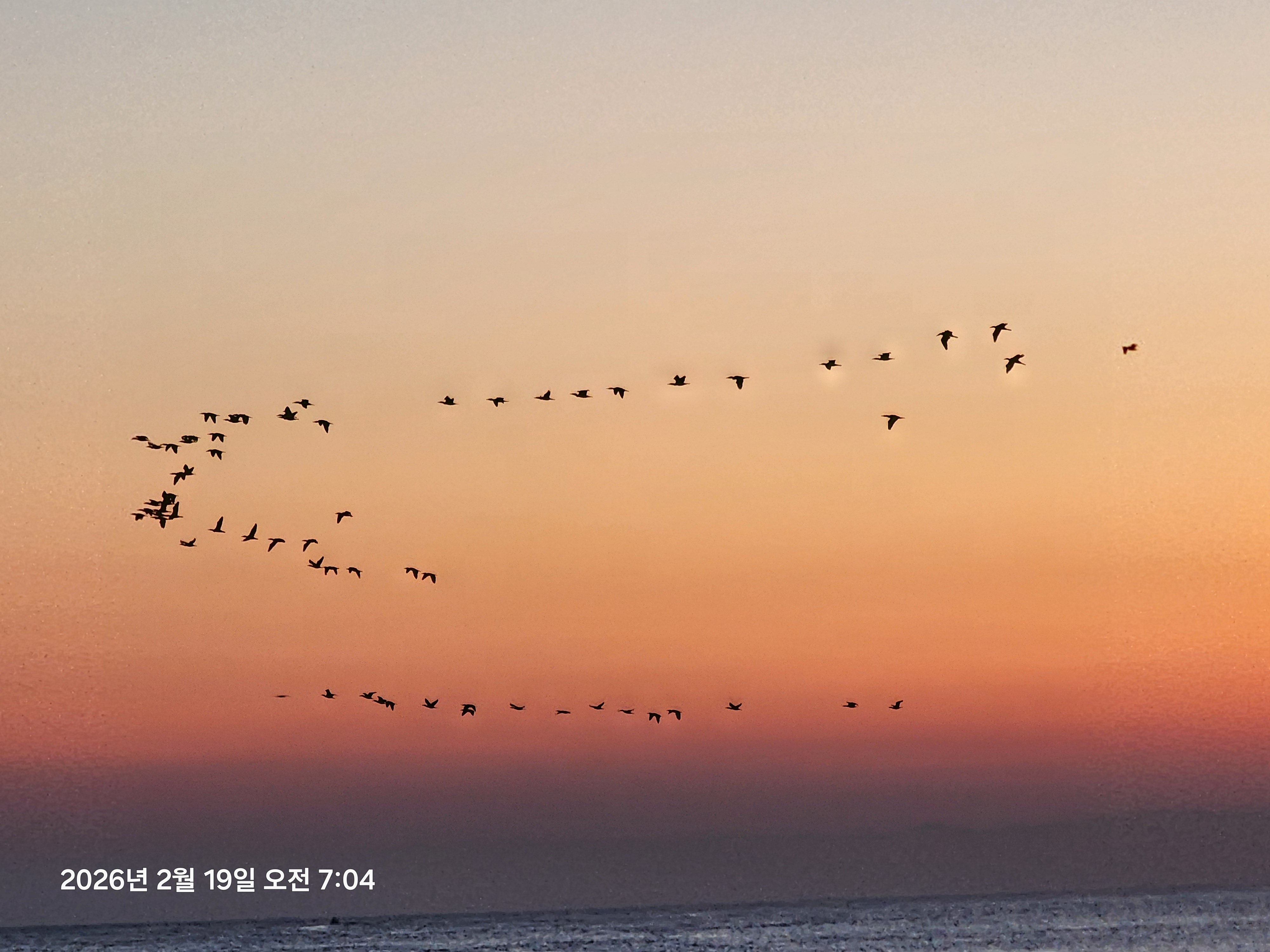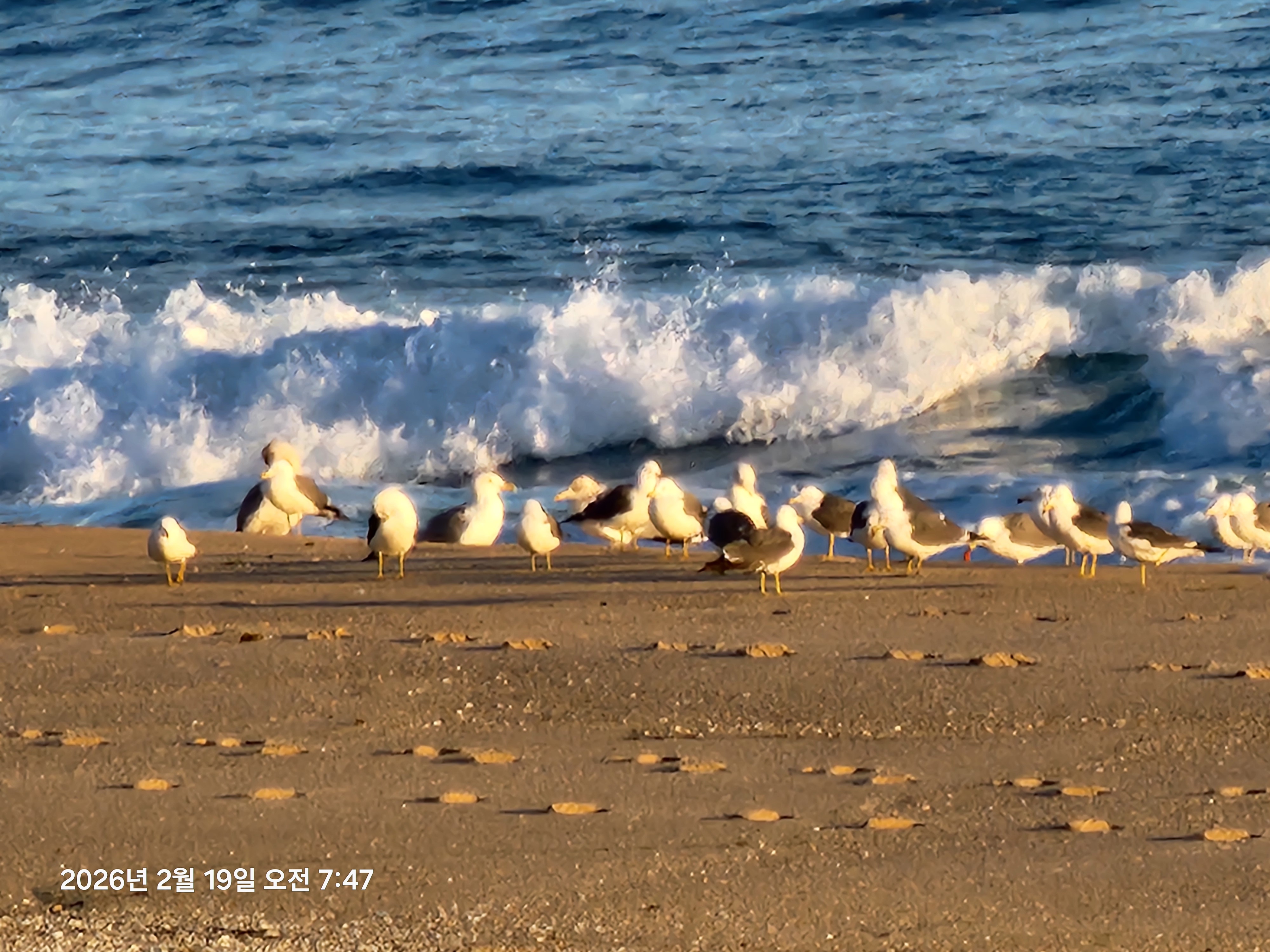 파도는 잔잔한 편이고, 2~3개의 갈매기 편대가 일출 축하 비행을 한다.