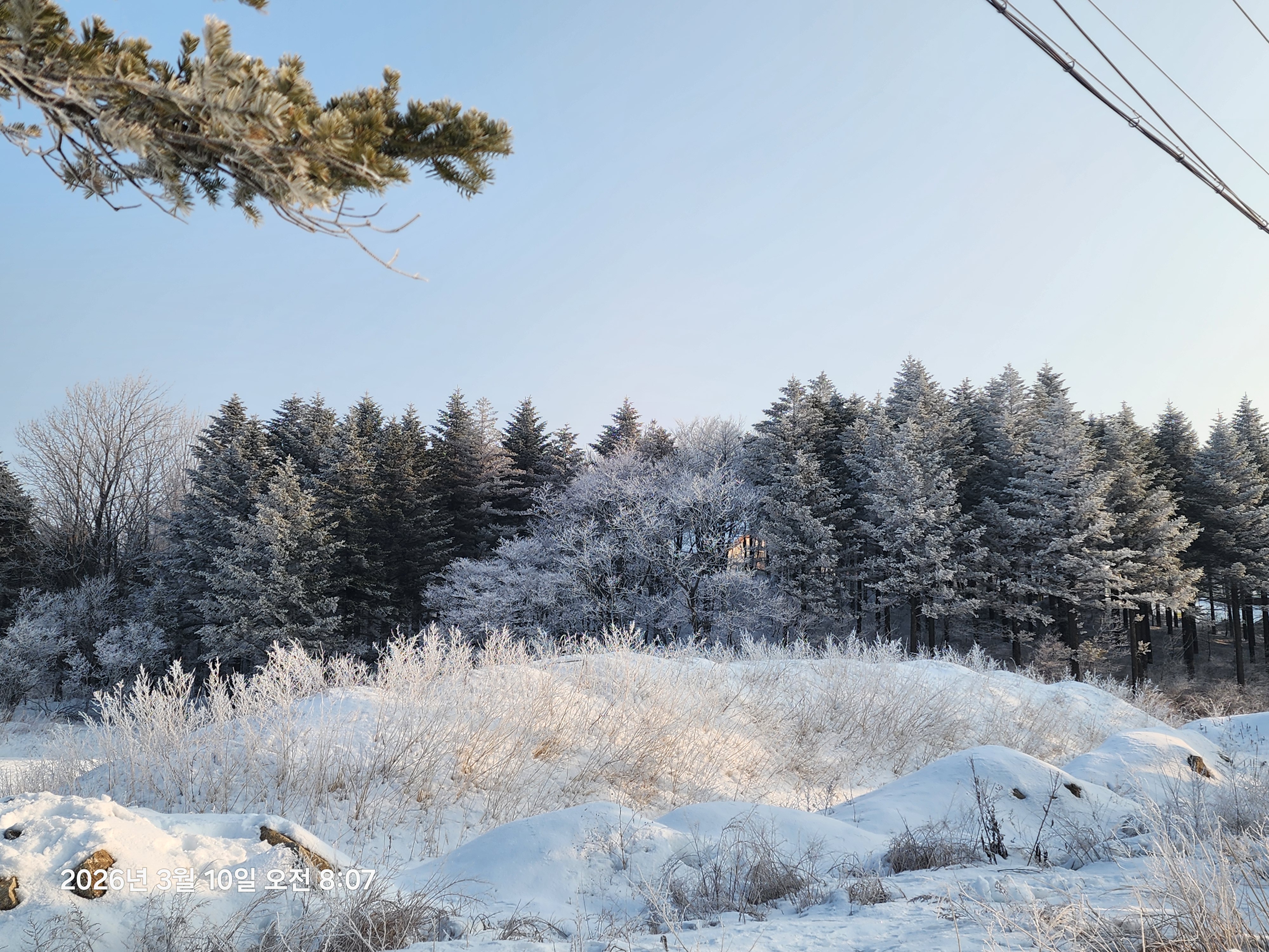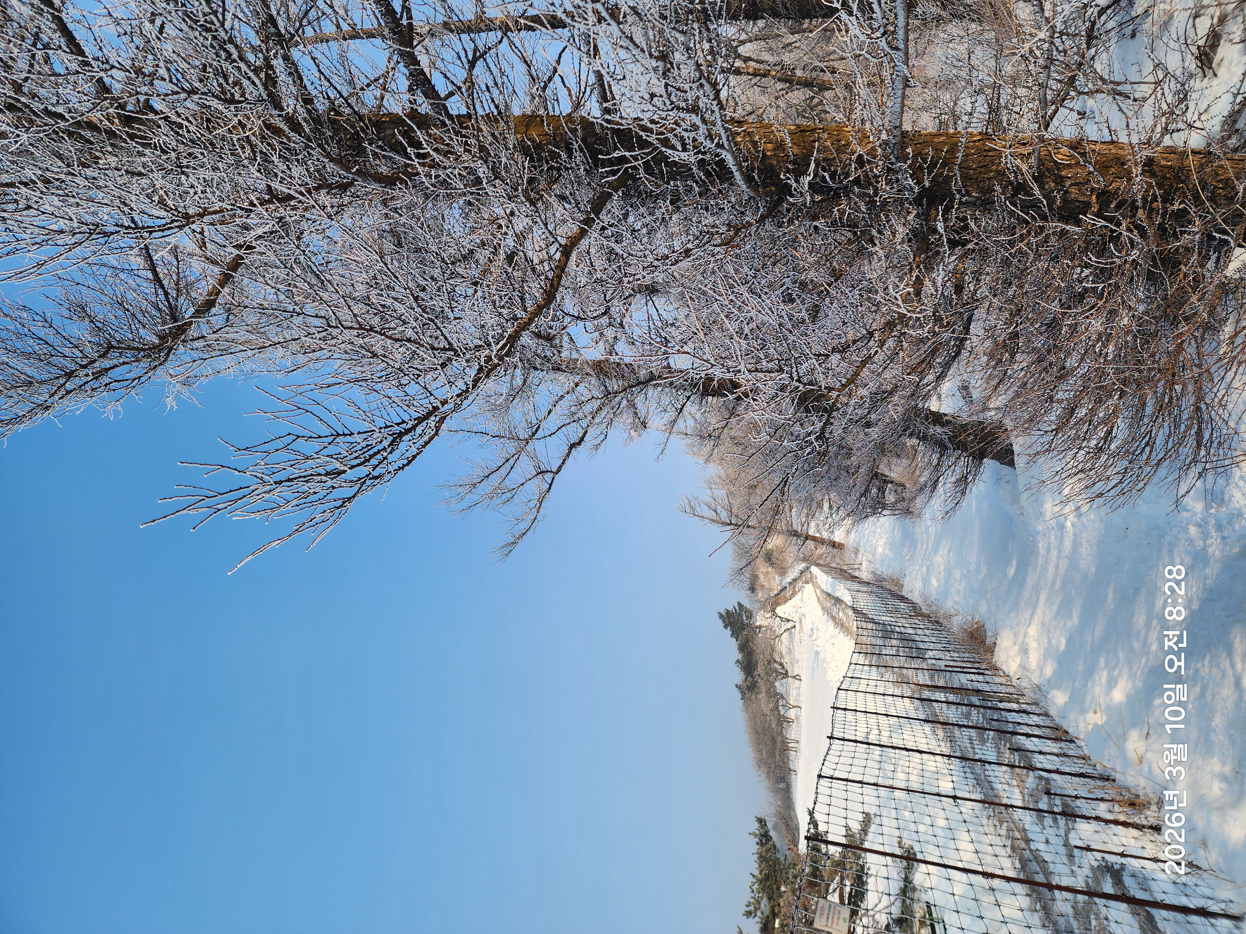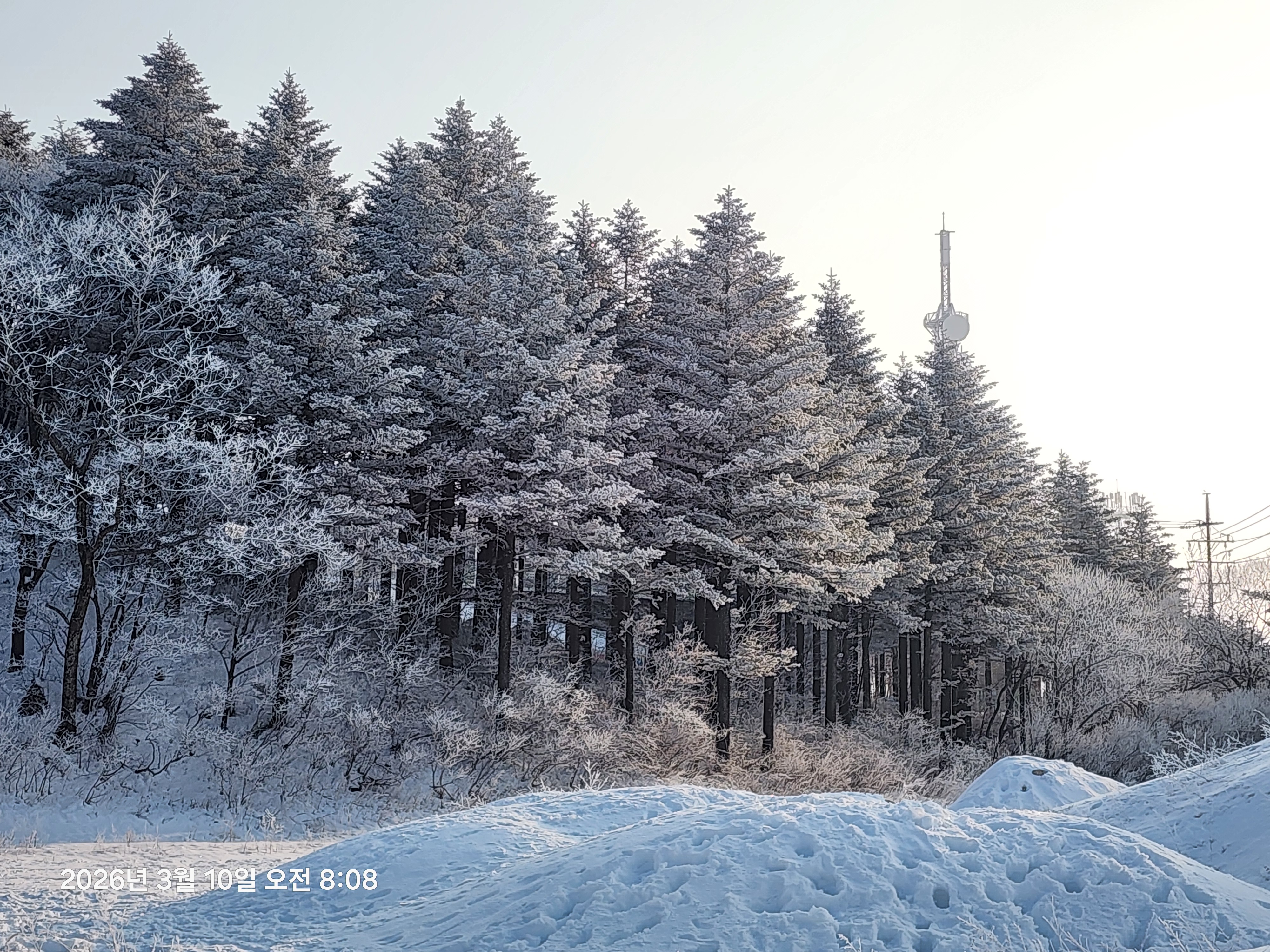 다음날( 오늘 10일)에 해가 난다길래 , 강릉에서 일출보고 선자령에서 파란하늘을 배경으로 눈덮인 산과 나무를