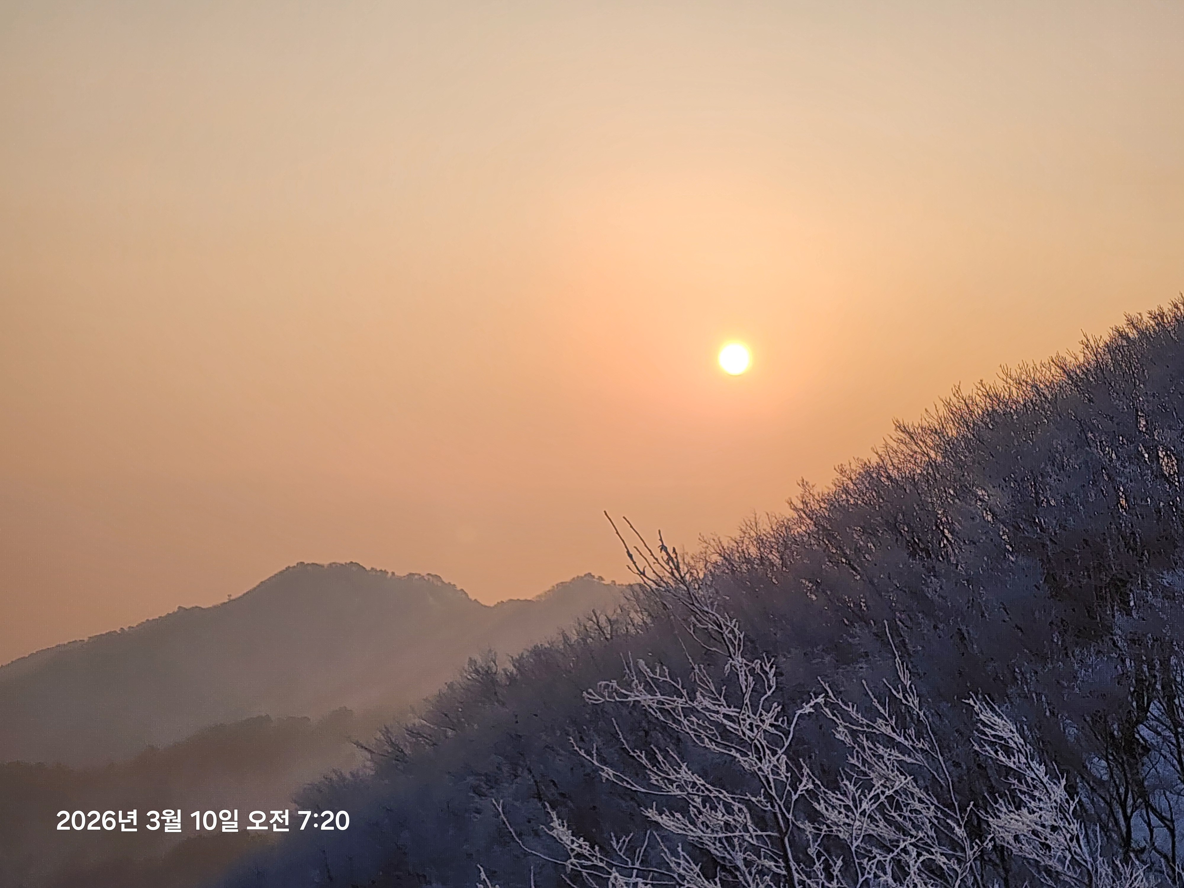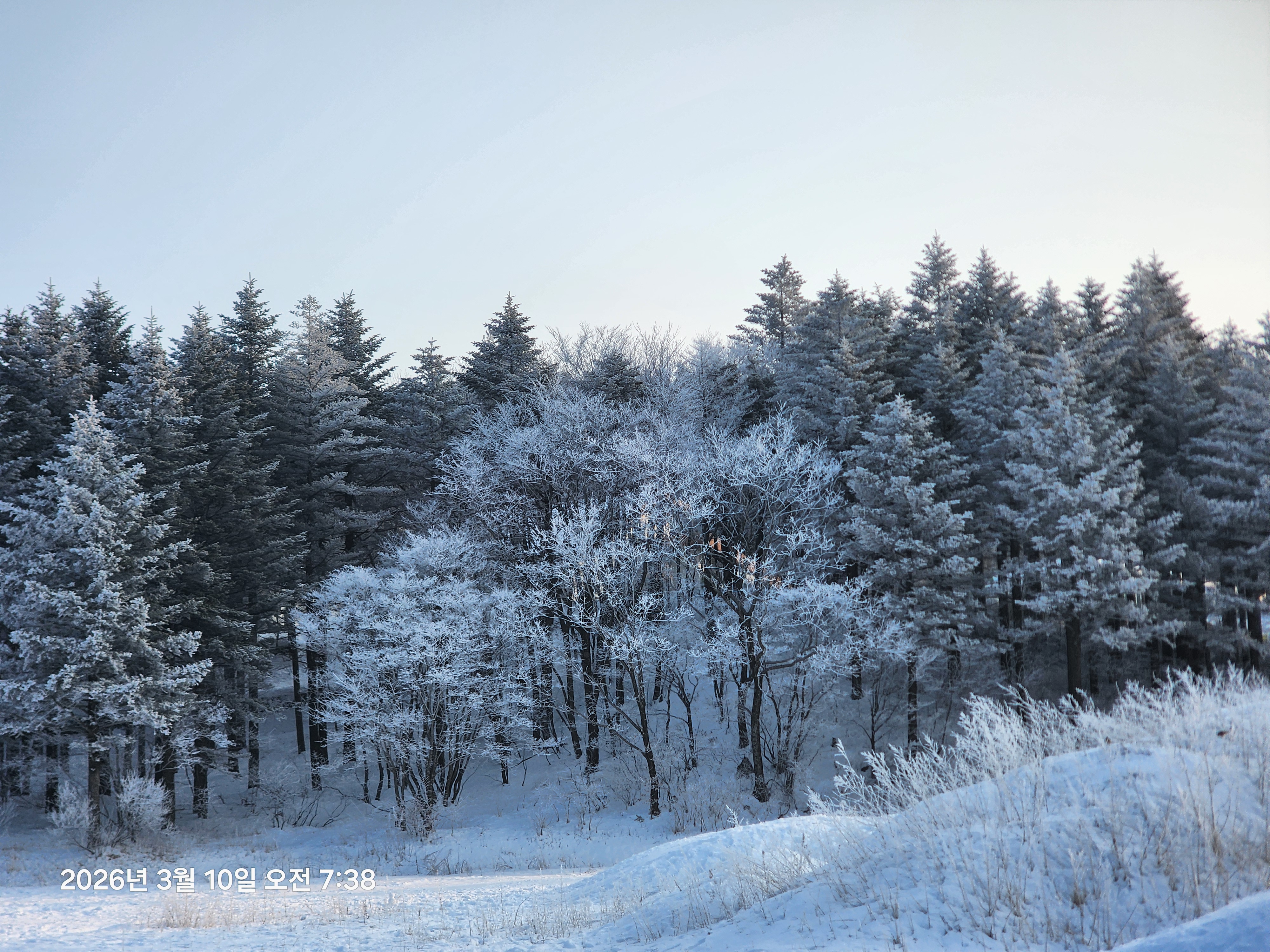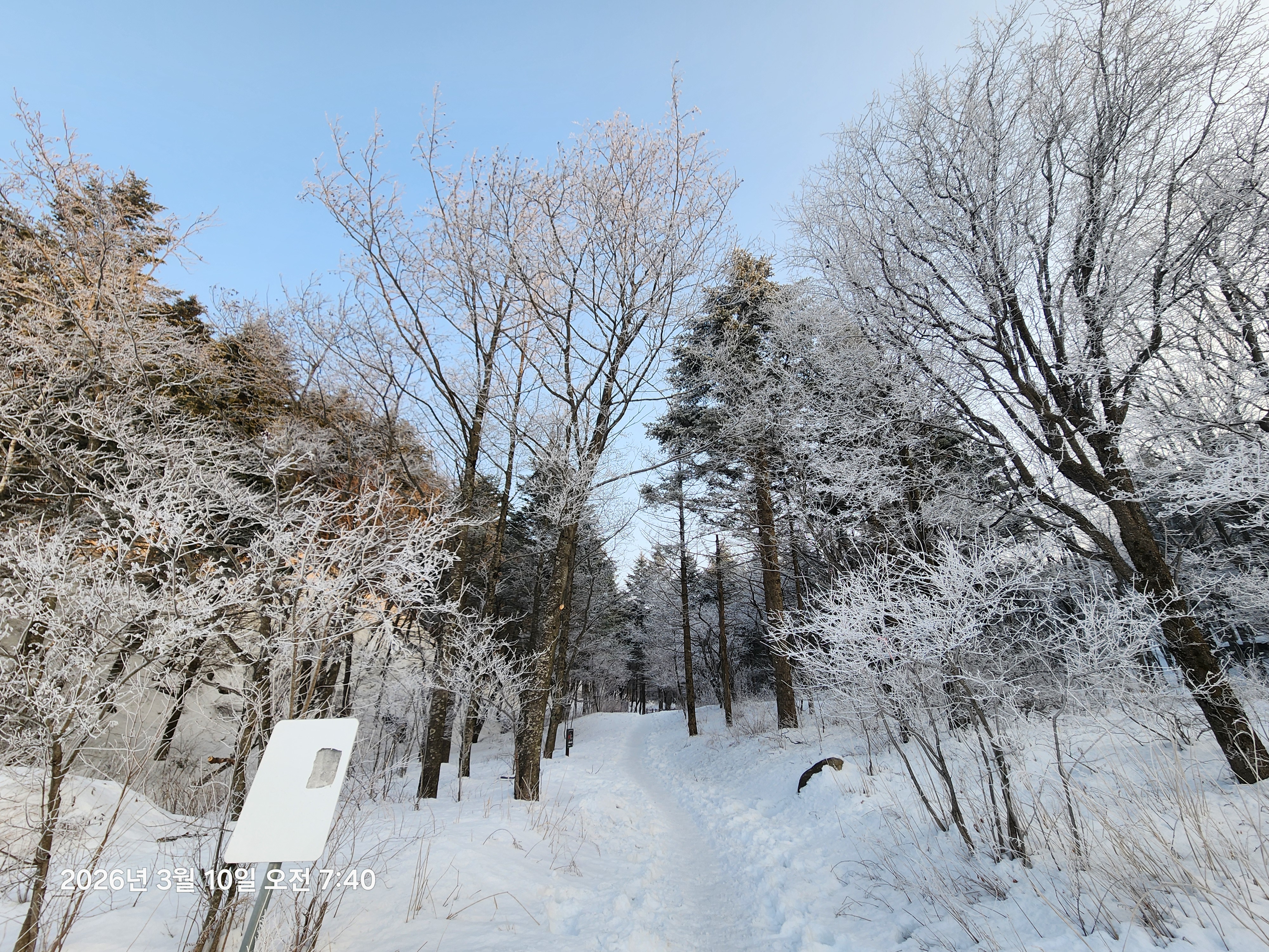 다음날( 오늘 10일)에 해가 난다길래 , 강릉에서 일출보고 선자령에서 파란하늘을 배경으로 눈덮인 산과 나무를