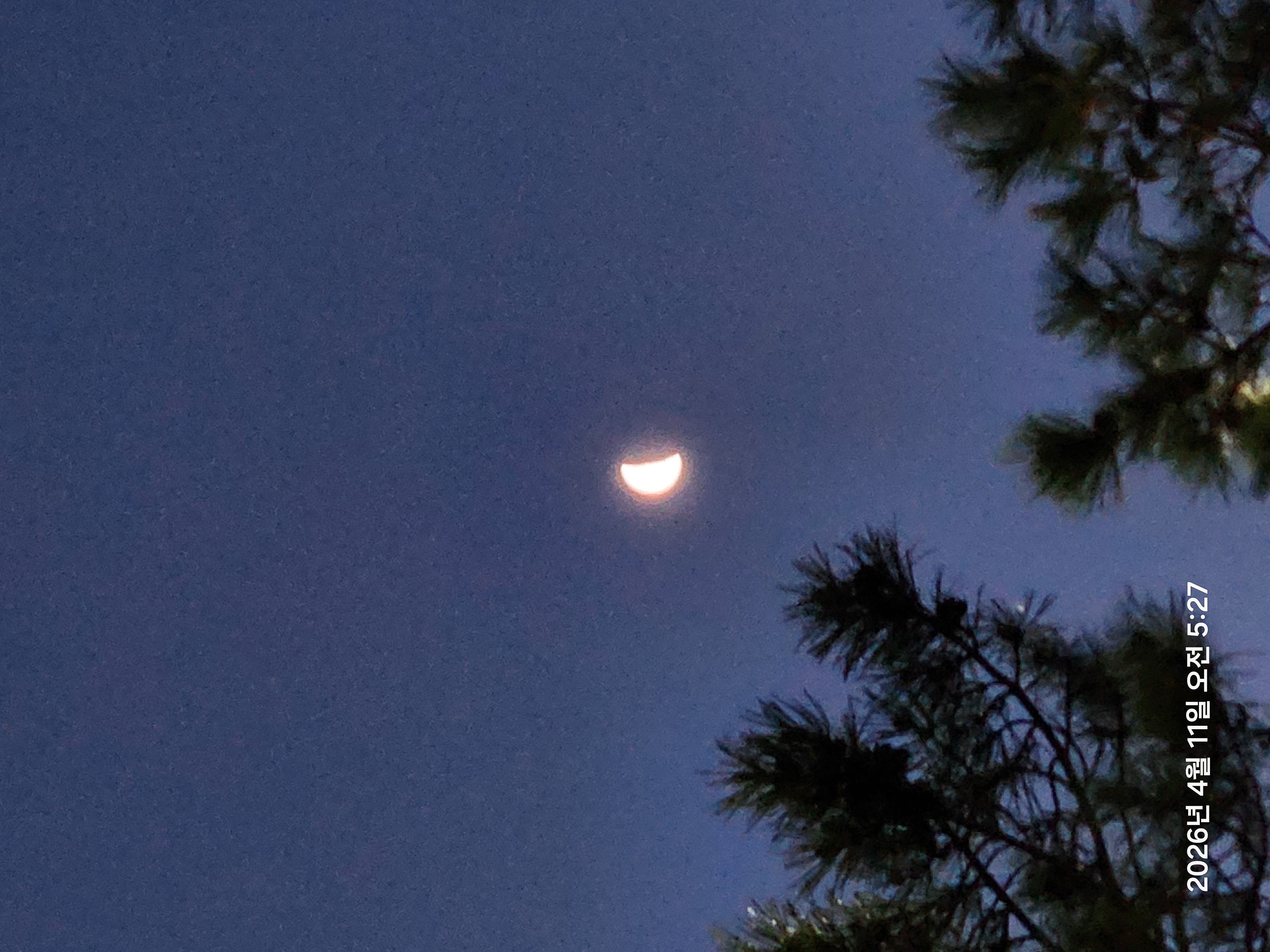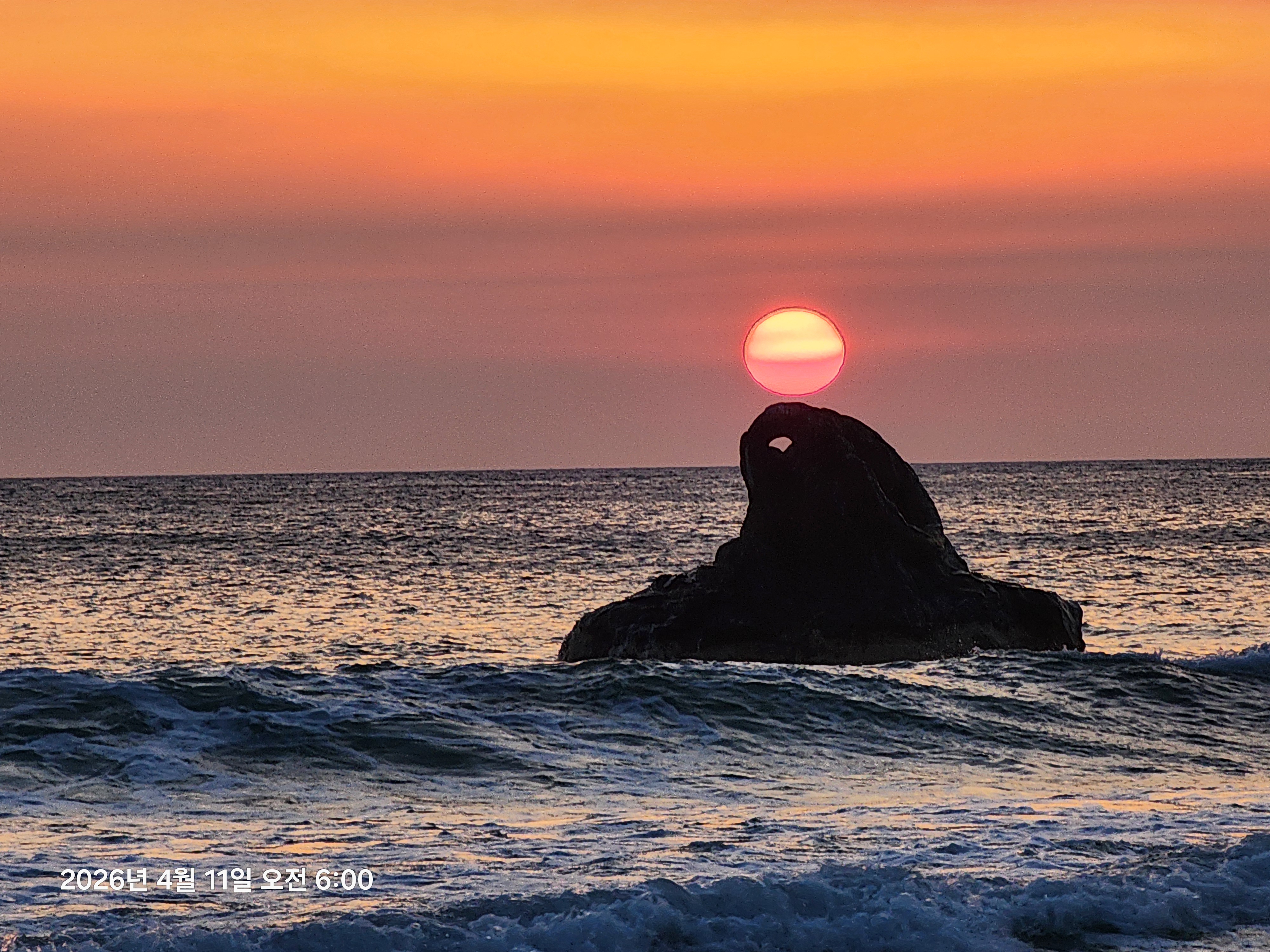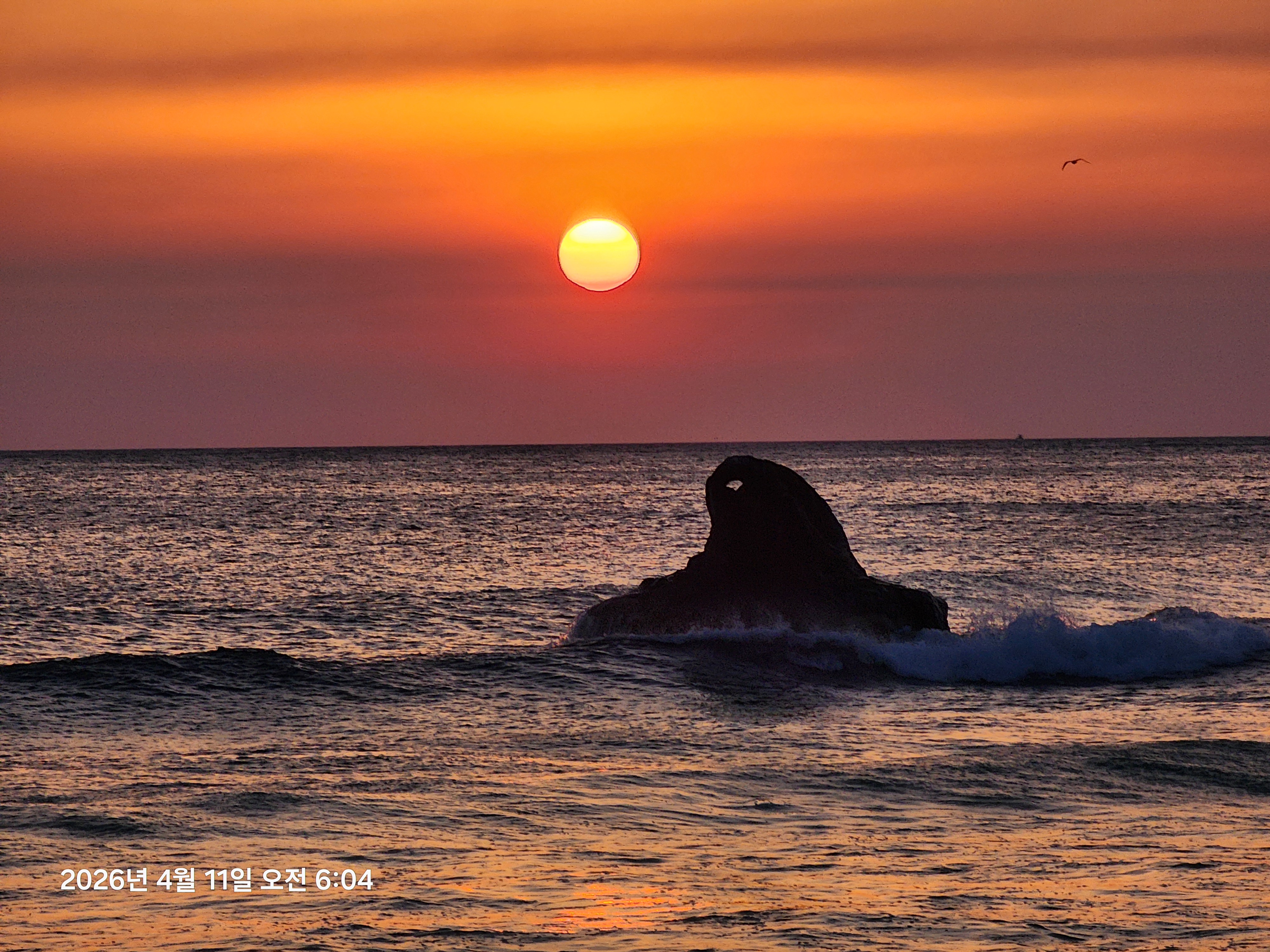 반쪽 몸으로 멋진 일출을 기대하는 반달에 보답이라도 하는듯, 수평선에 가로놓인 옅어보이지만 폭넓은 구름을 제치고 희미하게나마 수평선일출을 보여준다. 바람이 세차서 그런가 모델 갈매기의 모습뿐만 아니라 오가는 새한마리 안보인다.