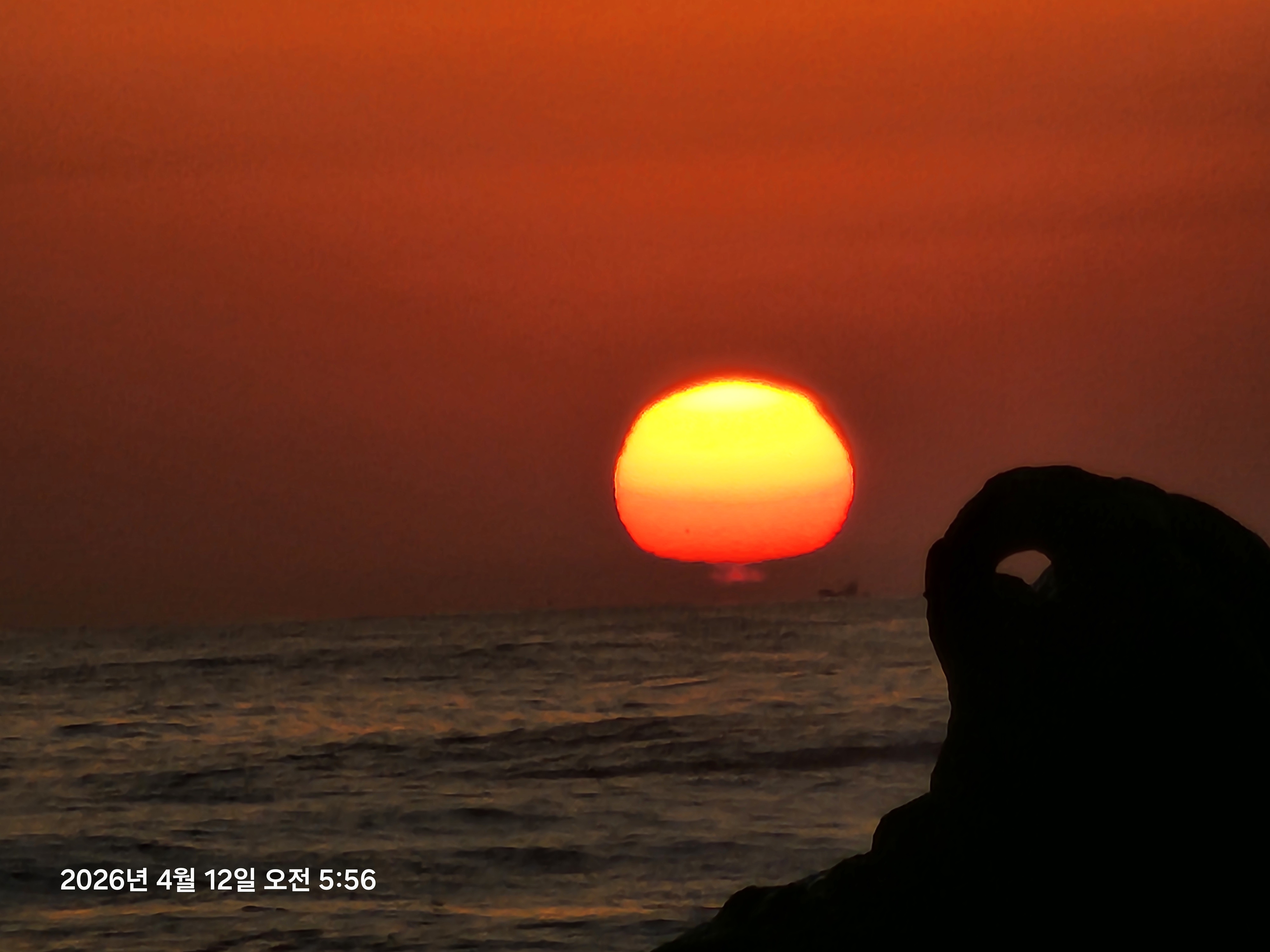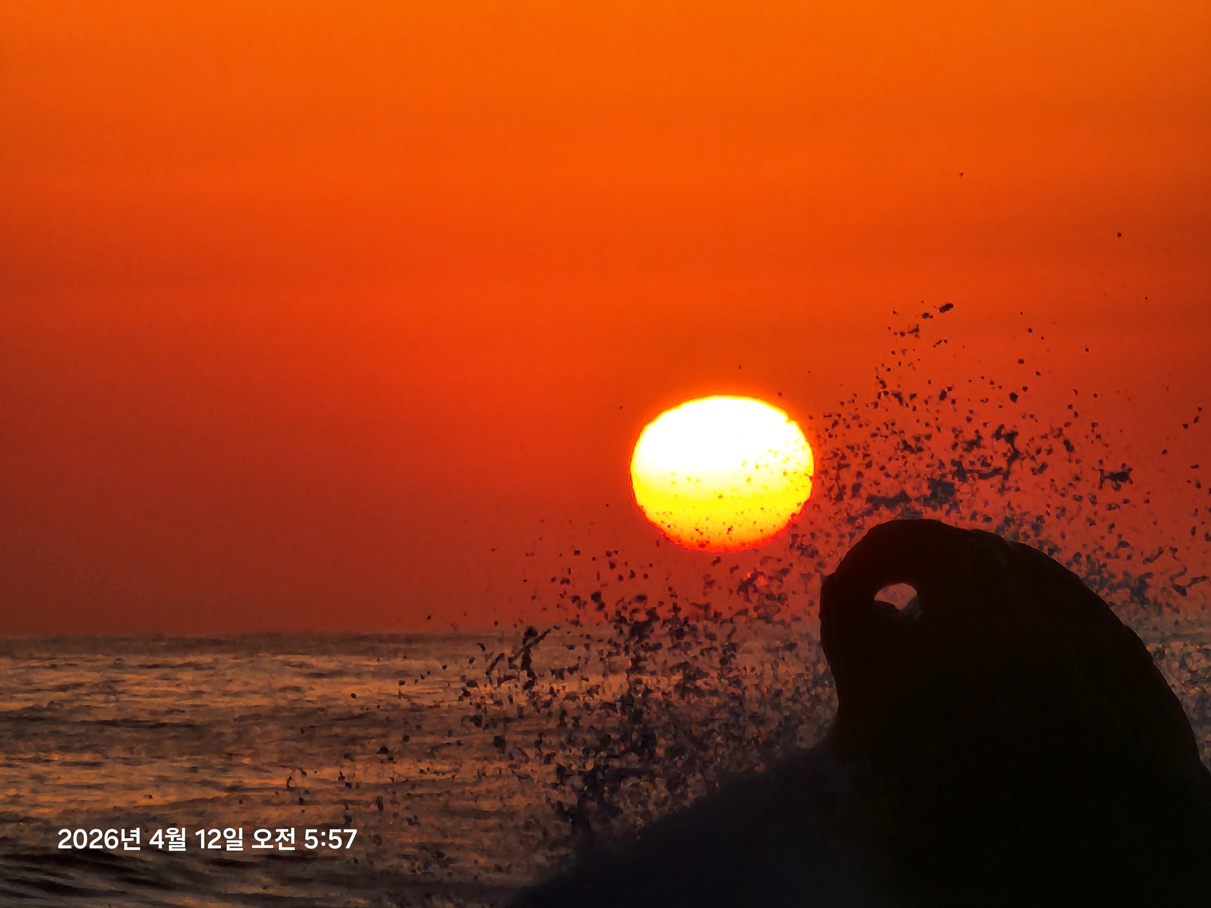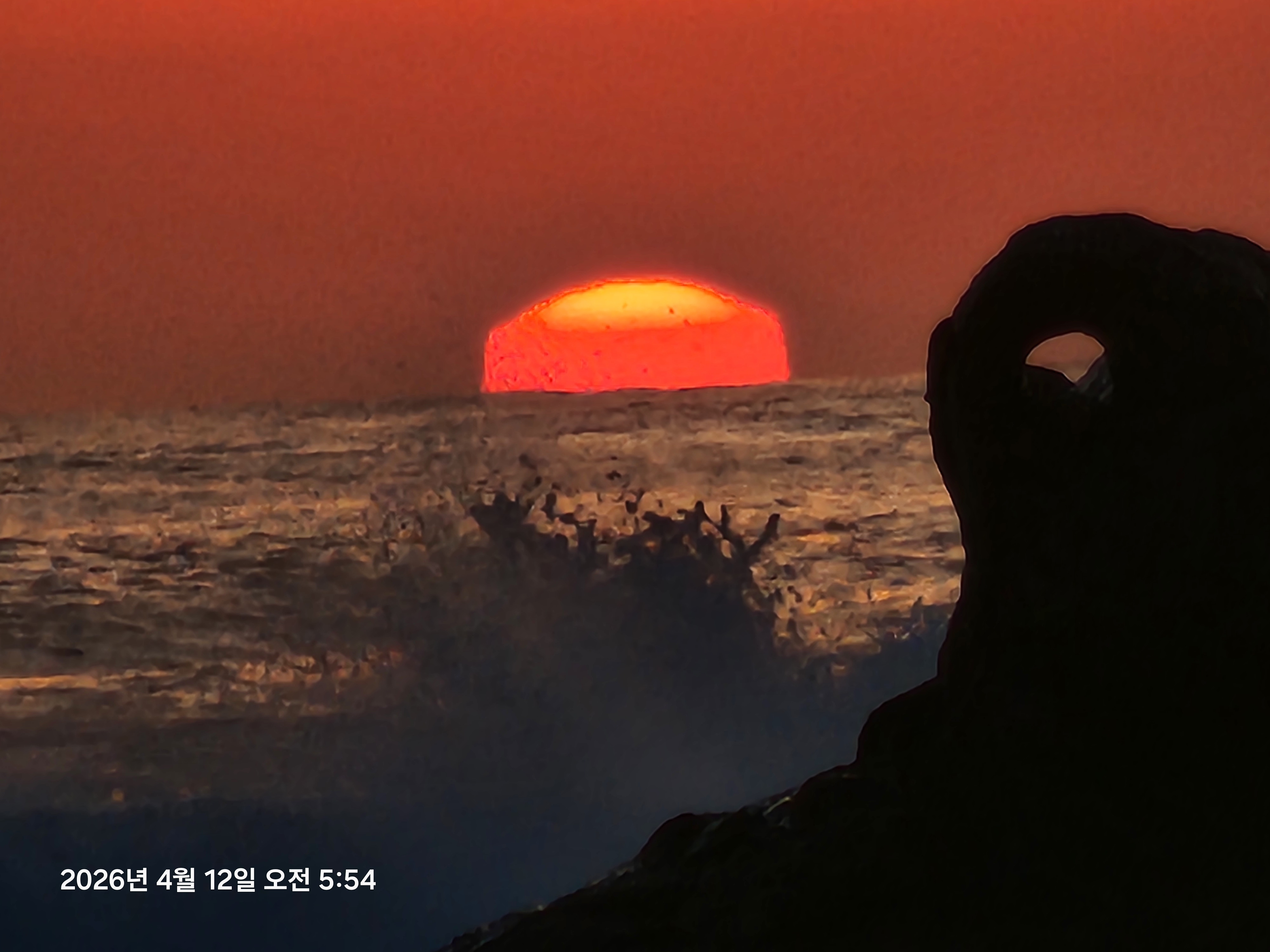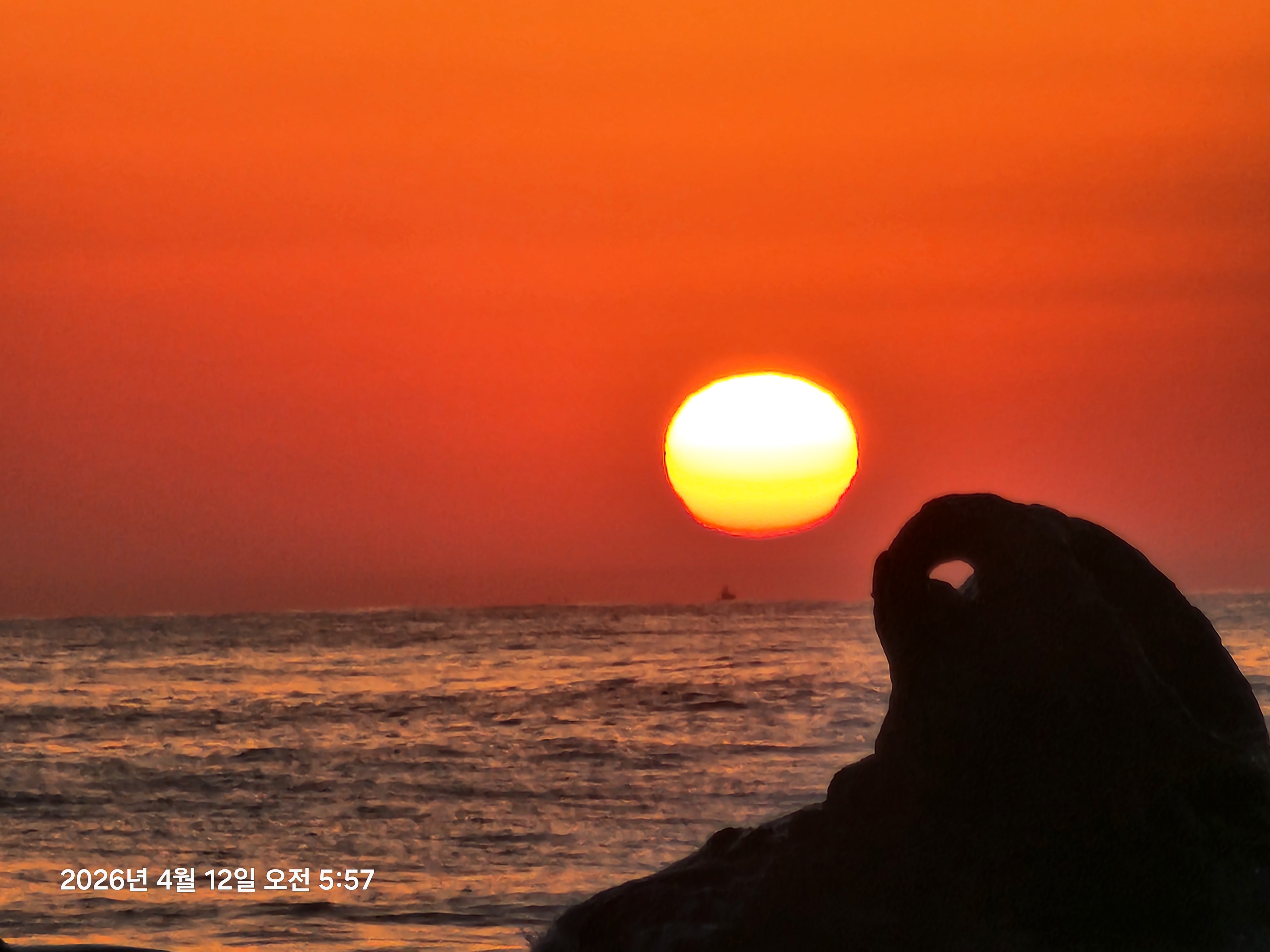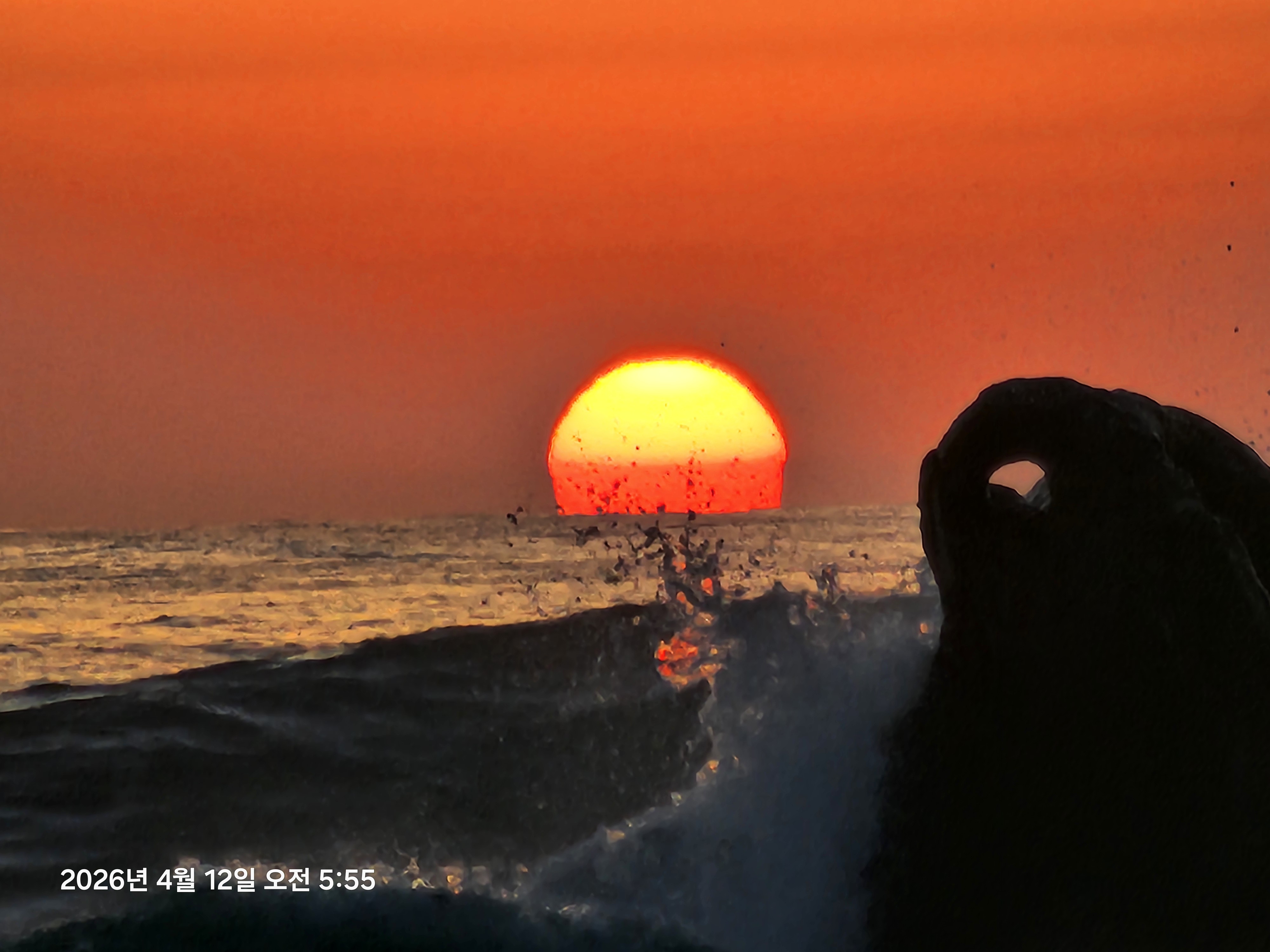 밤새 세상을 비추다 야위고 야윈 얼굴로 일출을 기다리는 달의 응원에 보답이라도 하듯 수평선 일출이다.