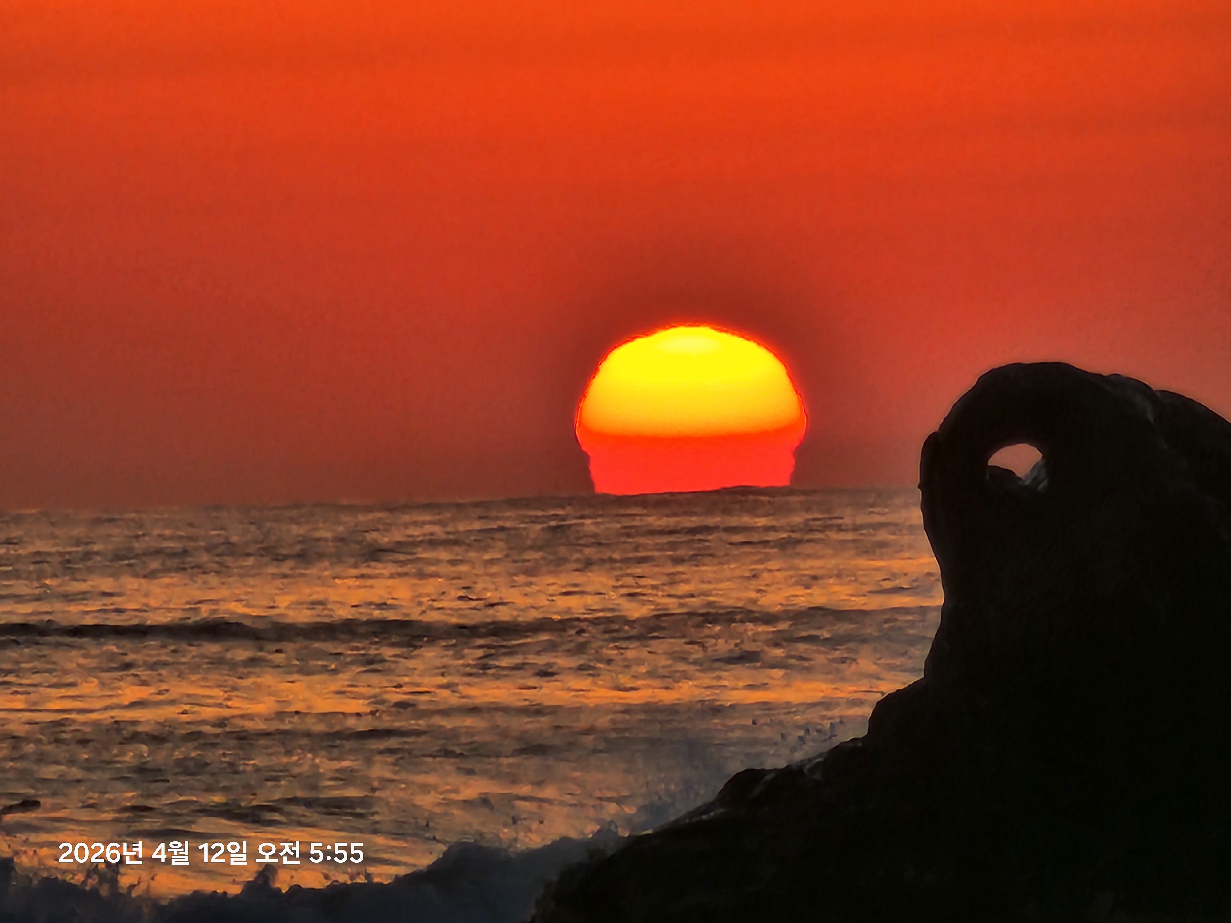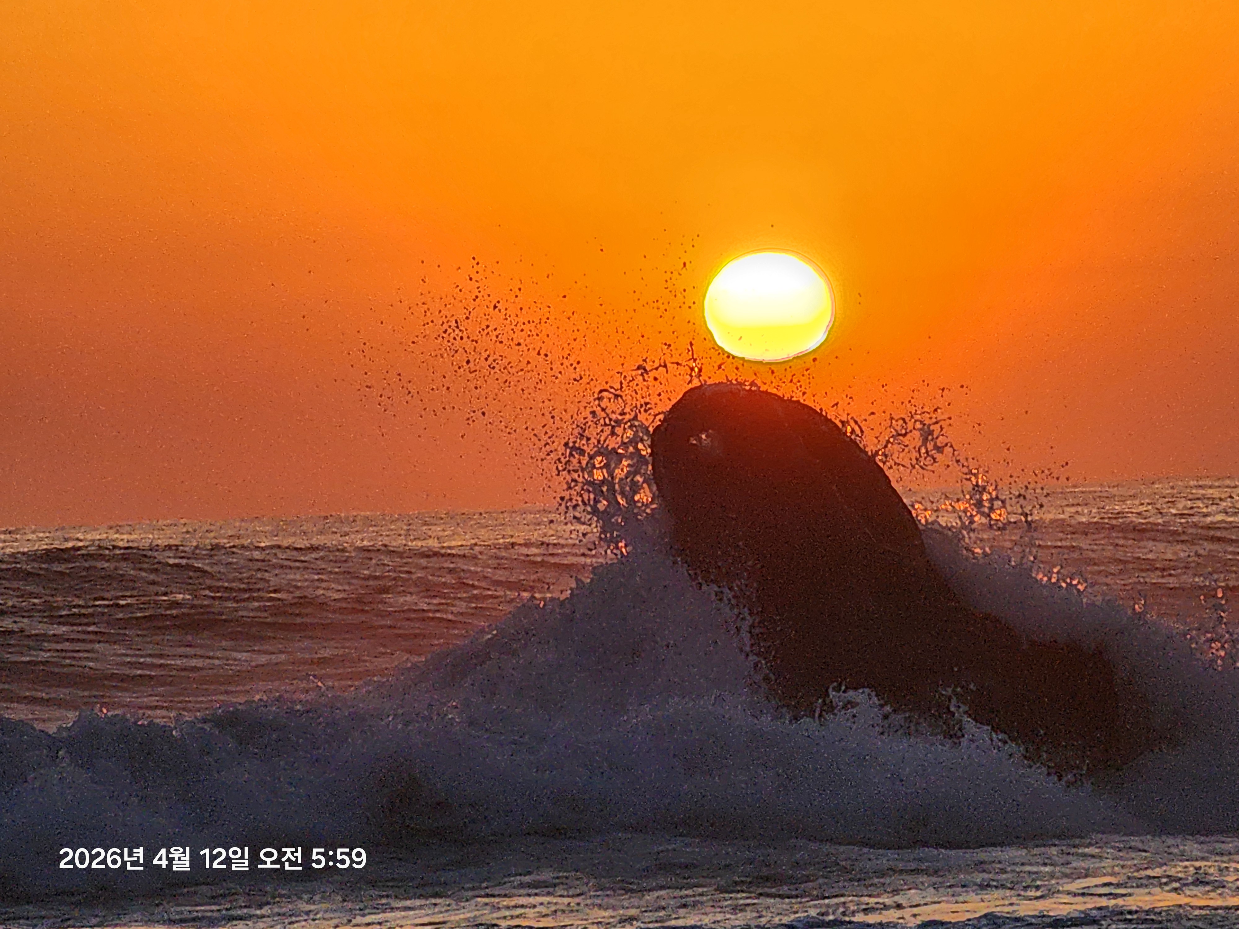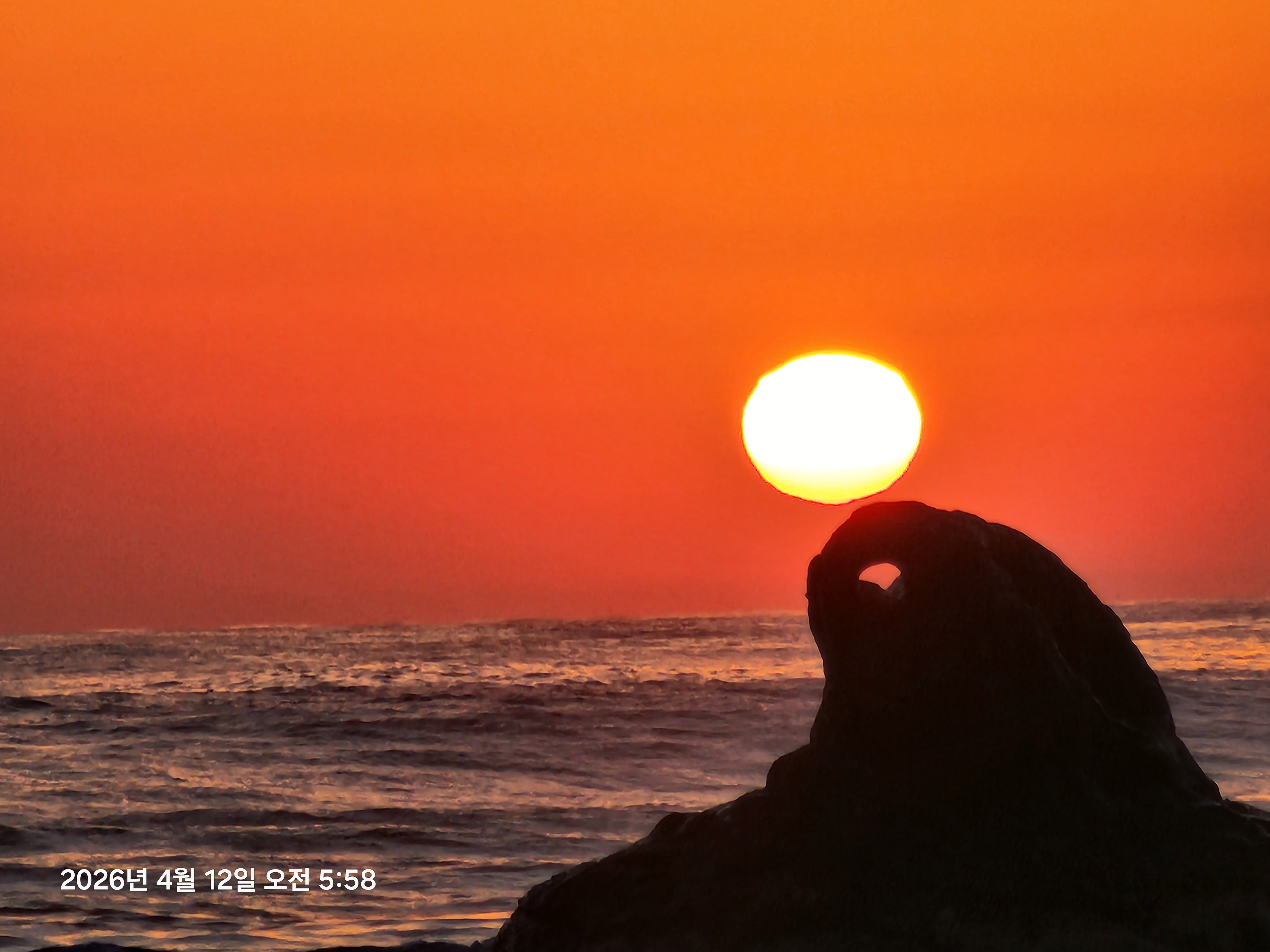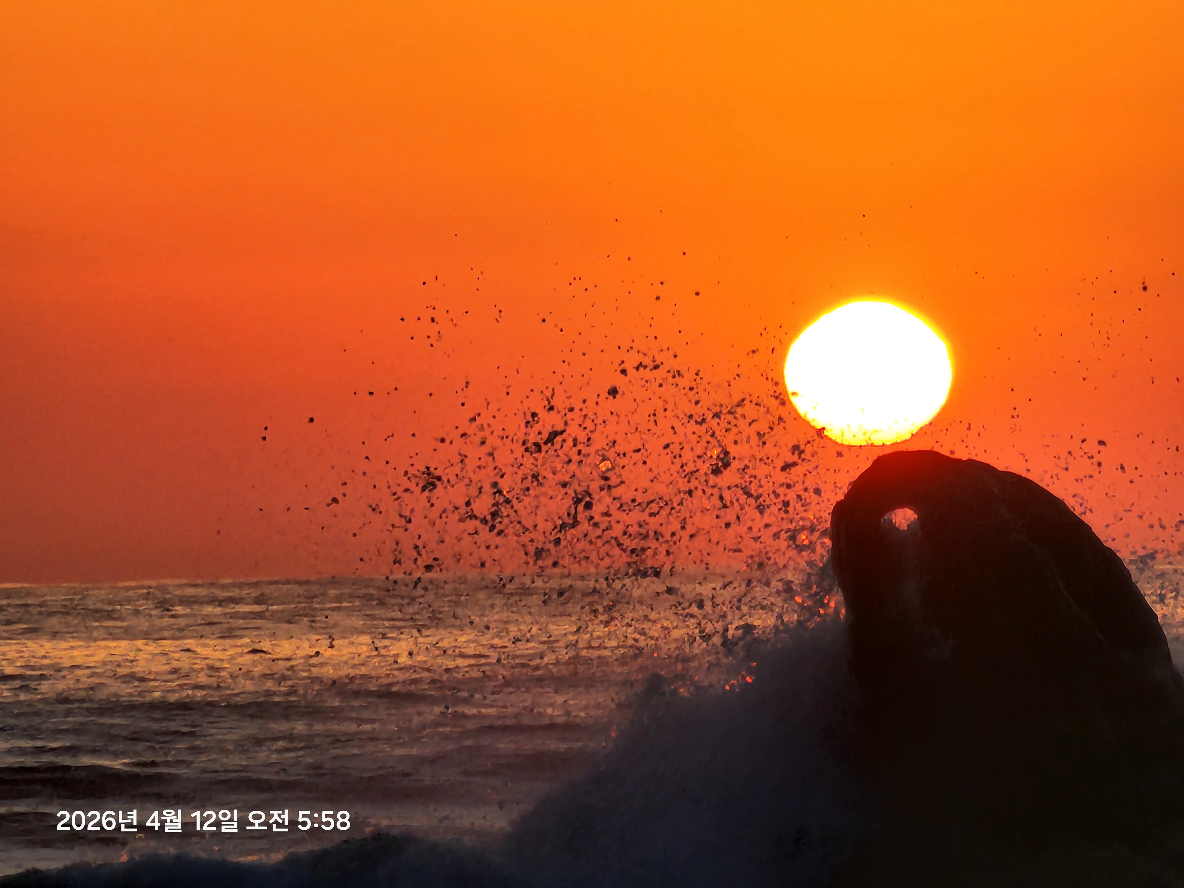 밤새 세상을 비추다 야위고 야윈 얼굴로 일출을 기다리는 달의 응원에 보답이라도 하듯 수평선 일출이다.
